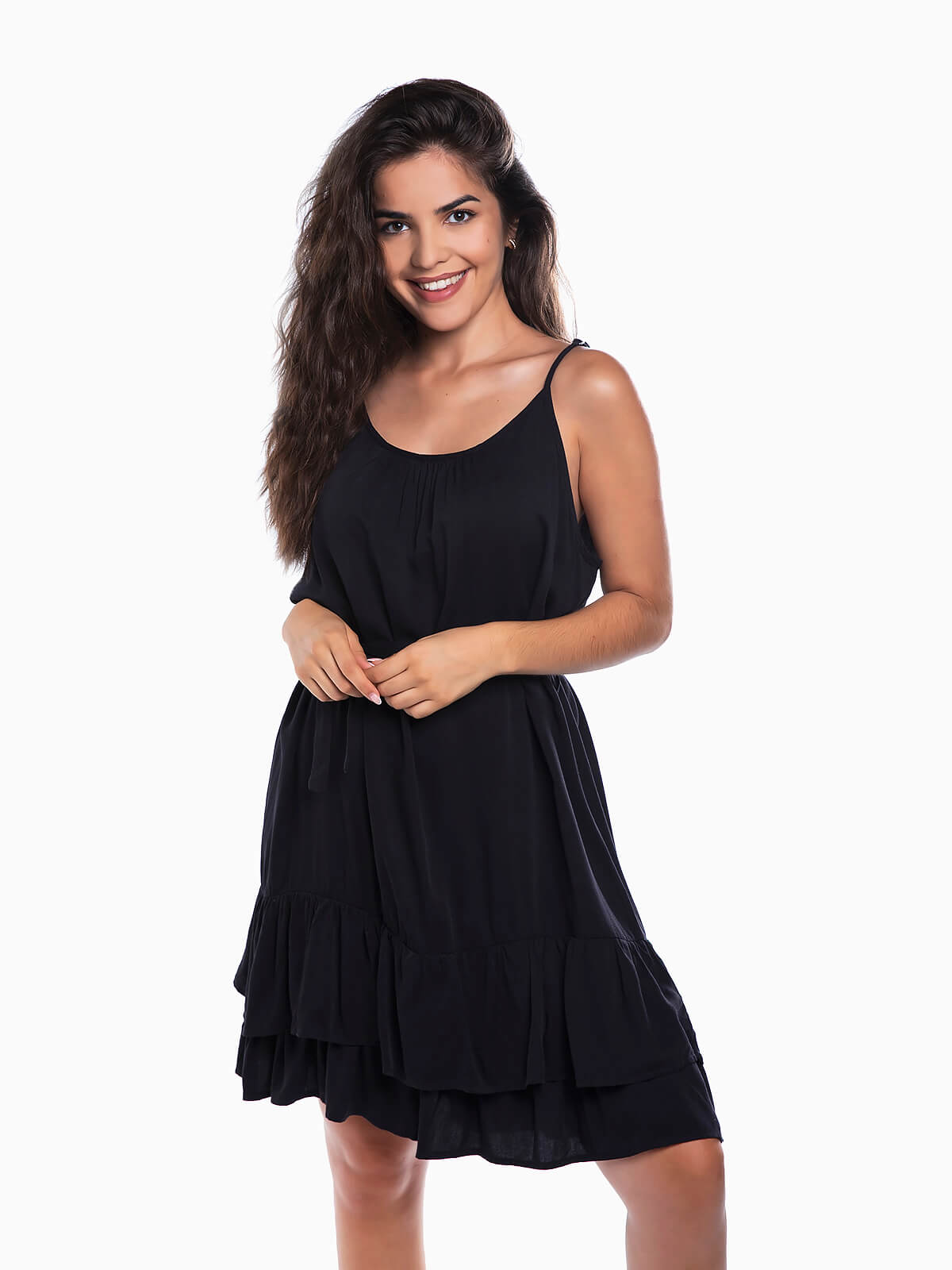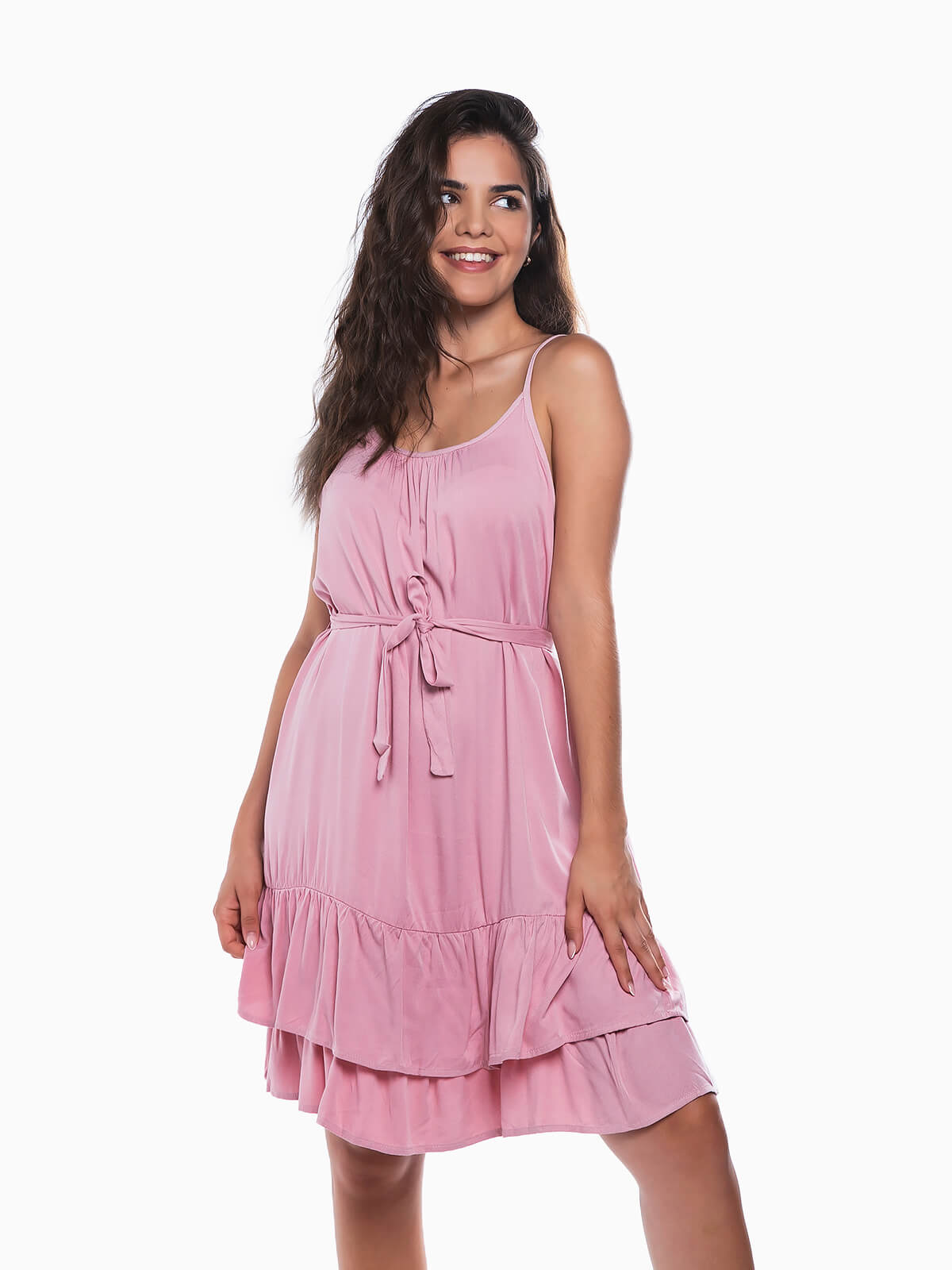 Vestido curto cintado com laço. Vestido de alças finas reguláveis com folhos em baixo. Decote redondo.