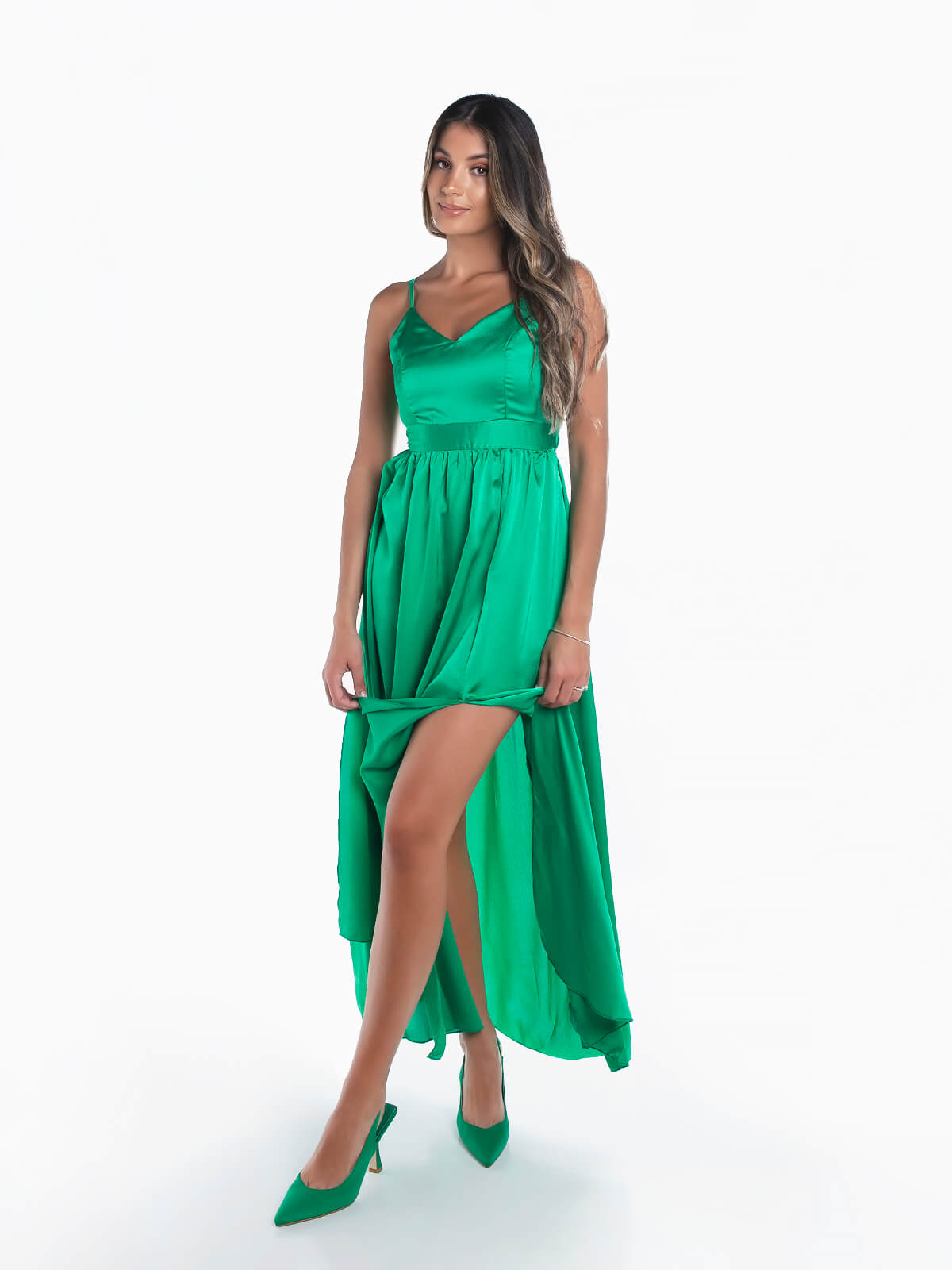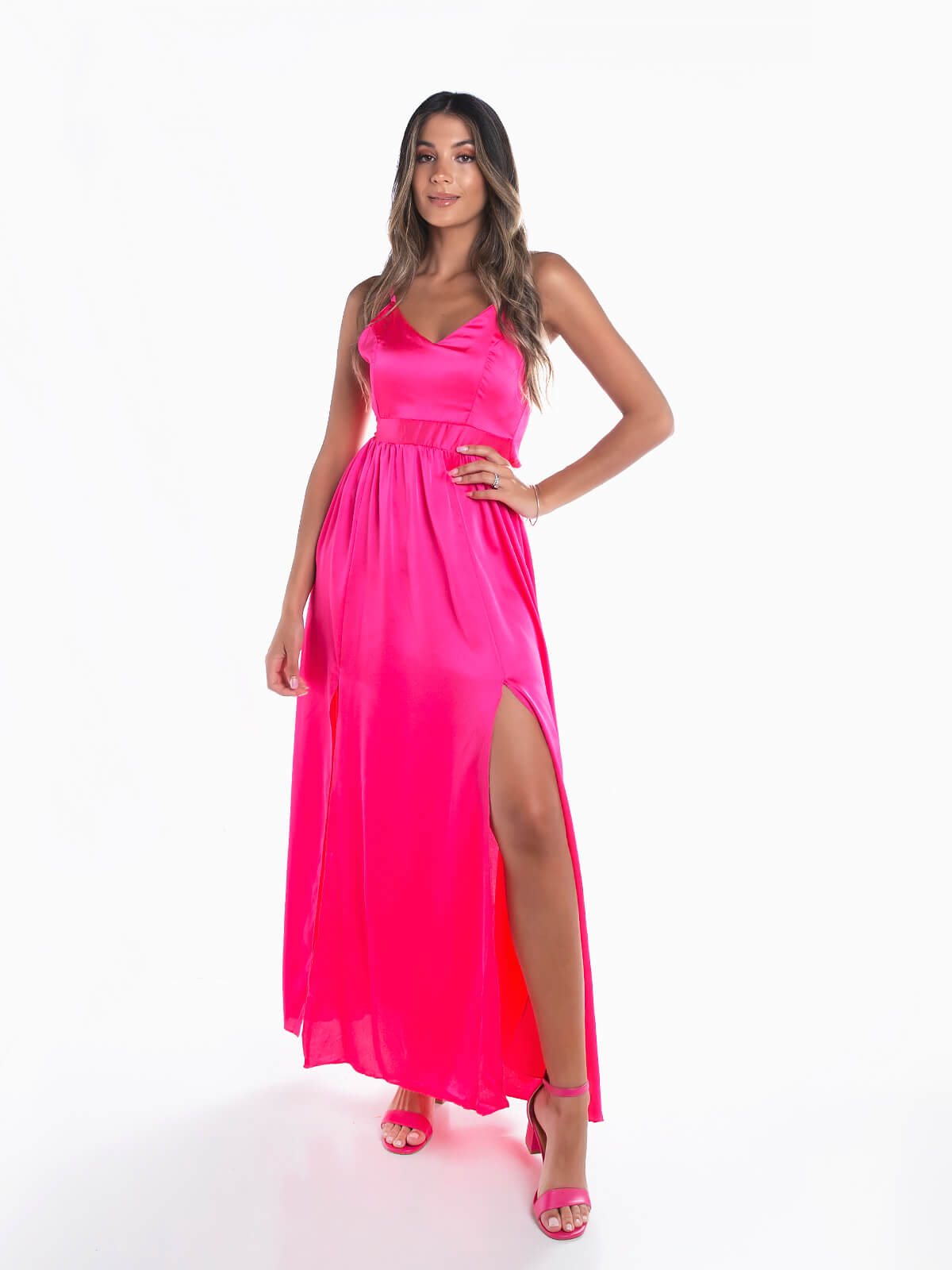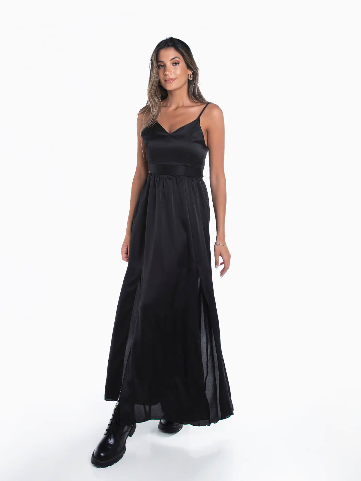 Vestido comprido acetinado com aberturas para senhora. Vestido fluído de alças finas ajustáveis e decote em bico. Pormenor de aperto de laço e elástico na parte posterior.