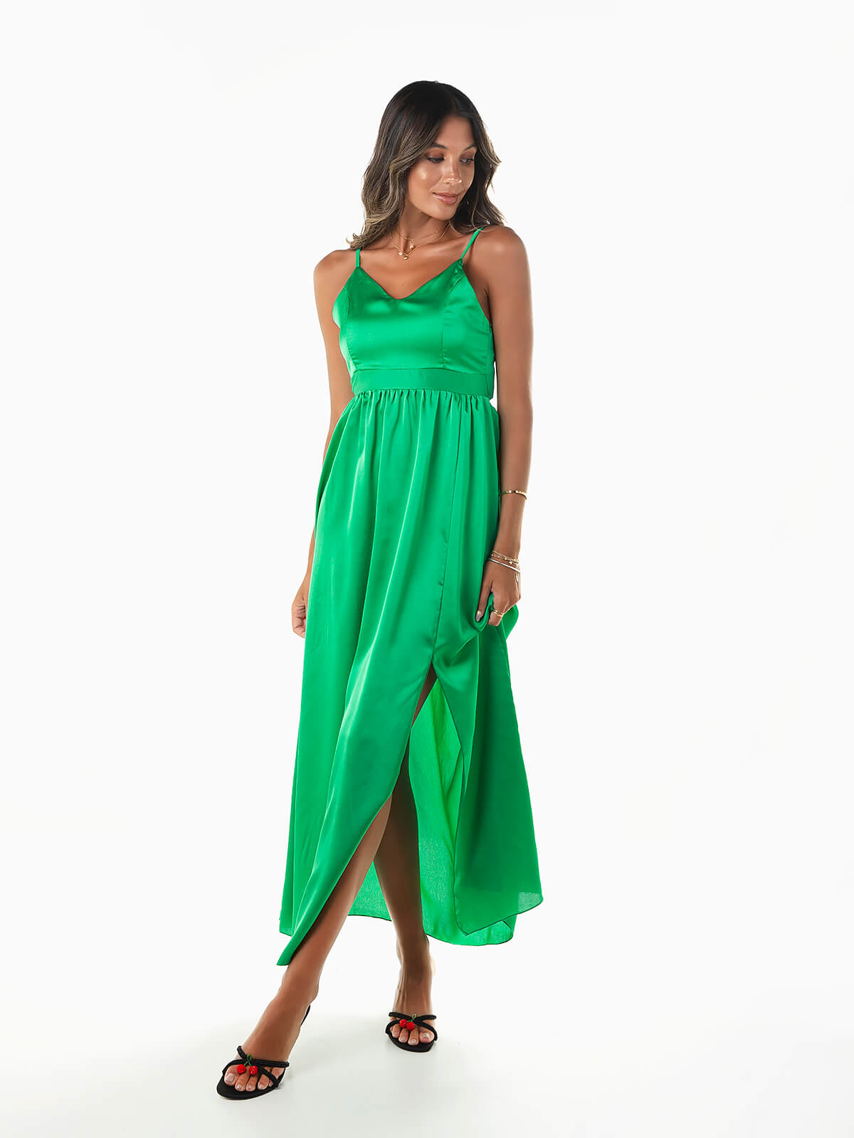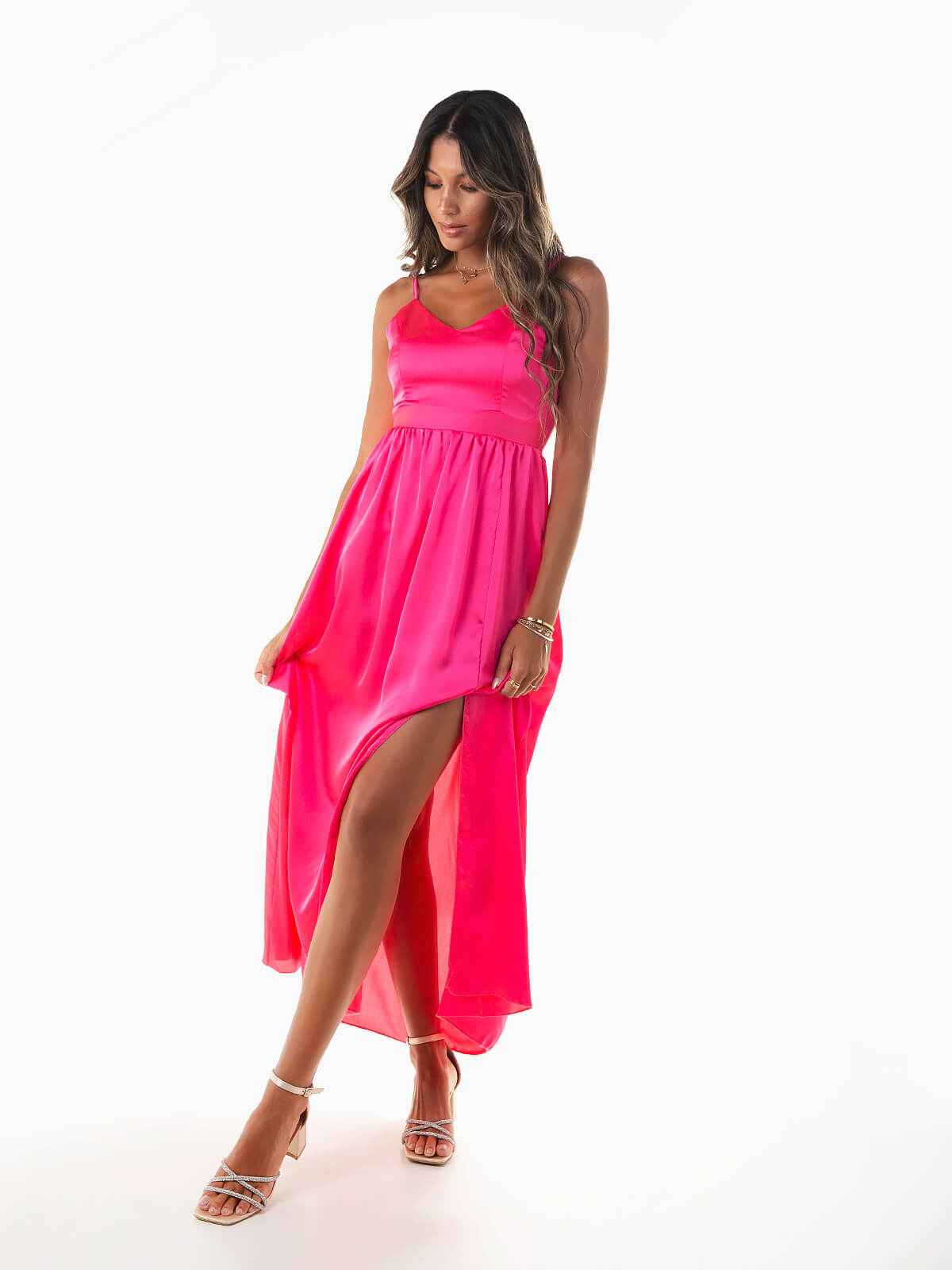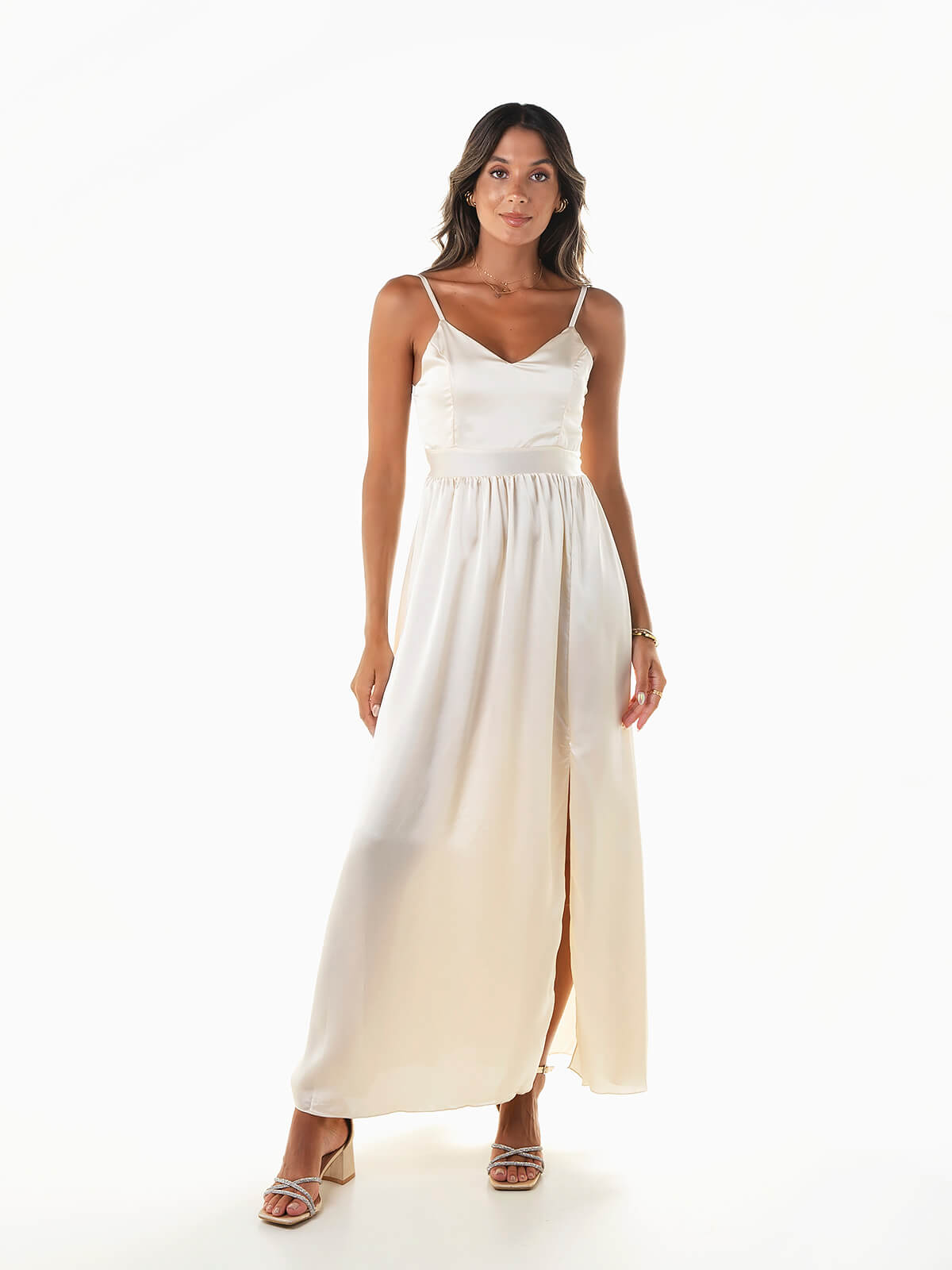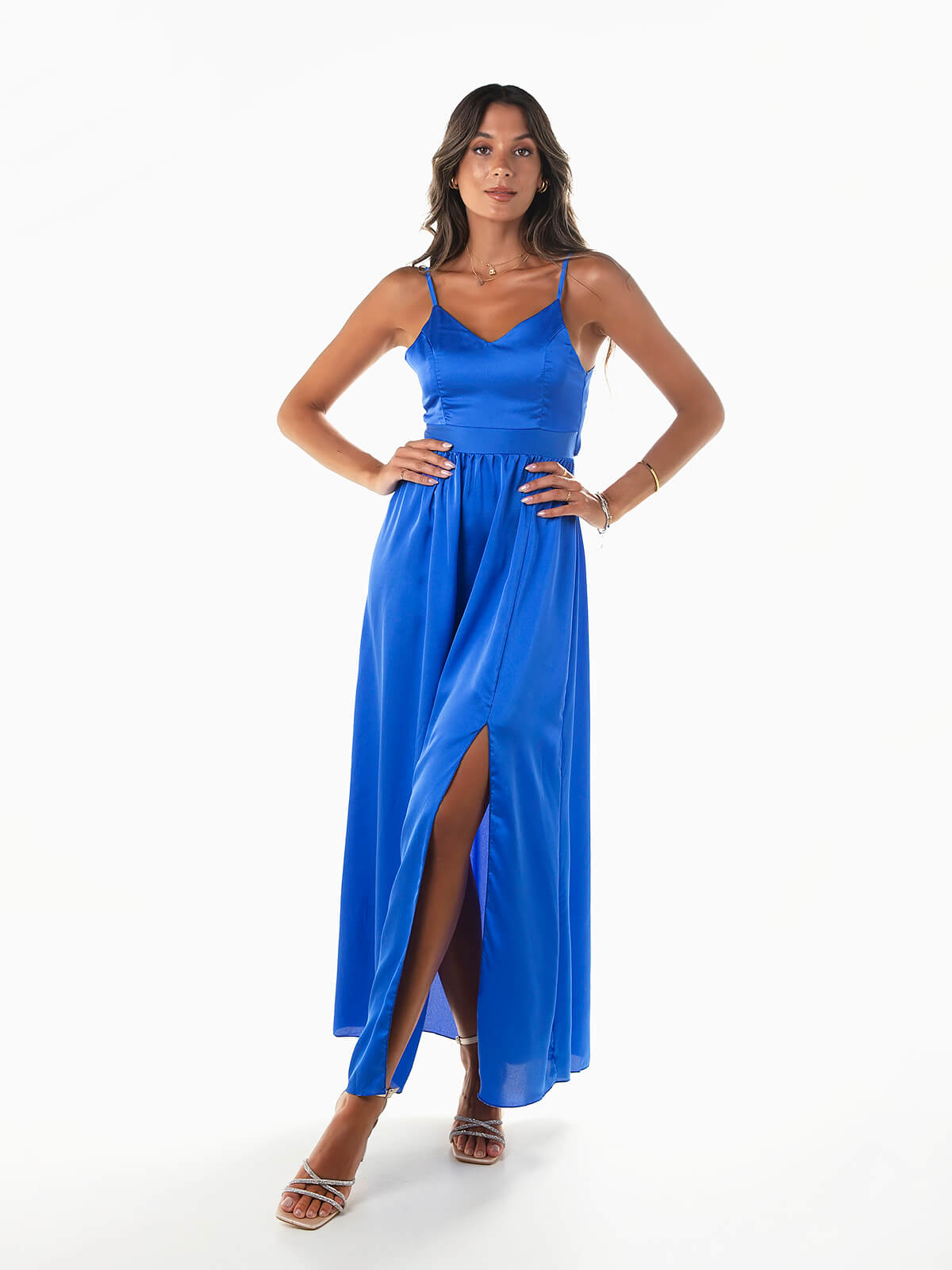 Vestido comprido acetinado com aberturas para senhora. Vestido fluído de alças finas ajustáveis e decote em bico. Pormenor de aperto de laço e elástico na parte posterior.