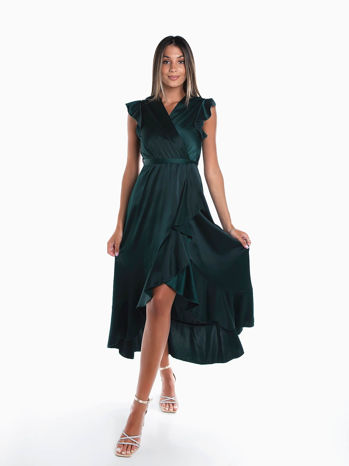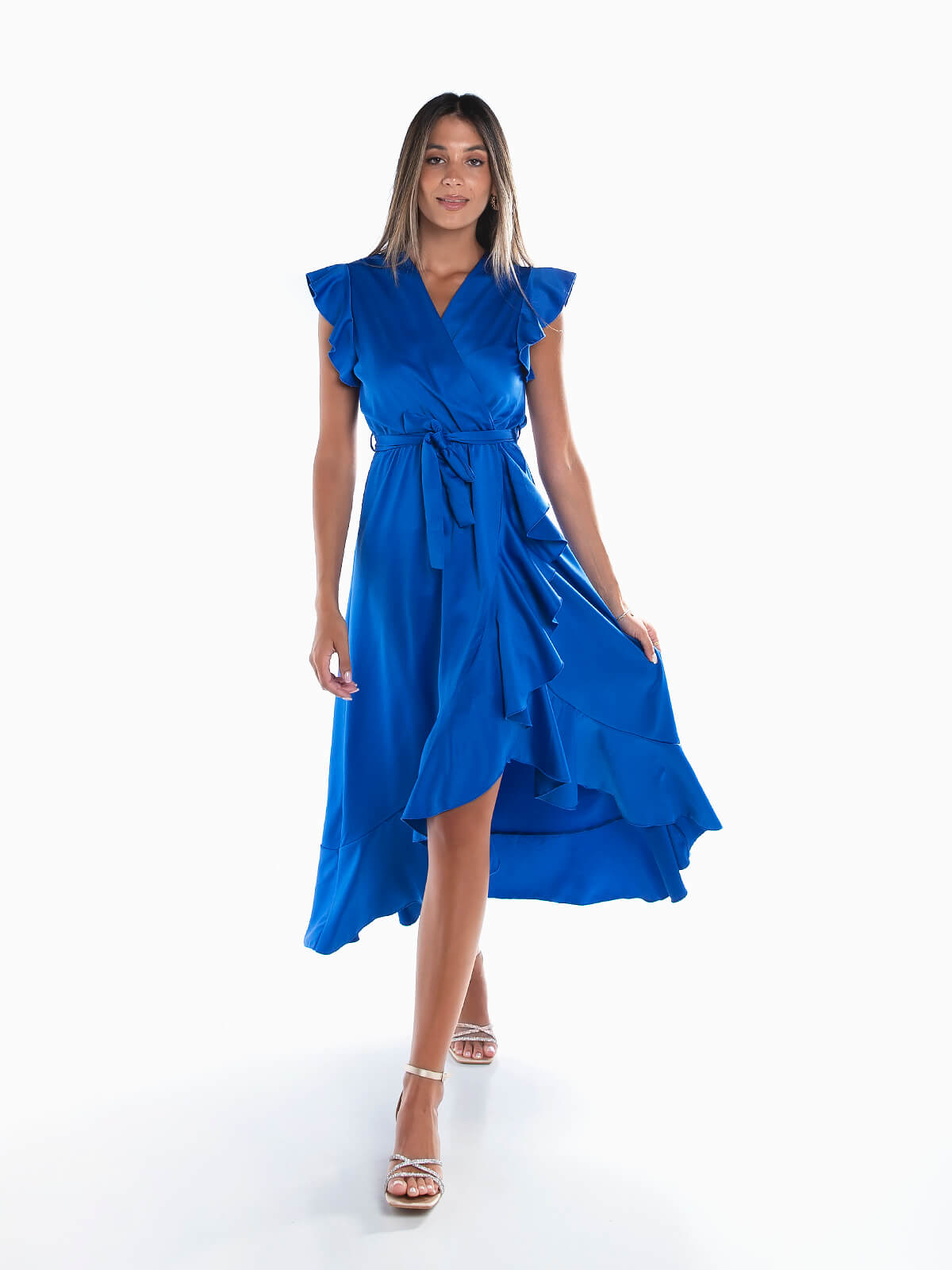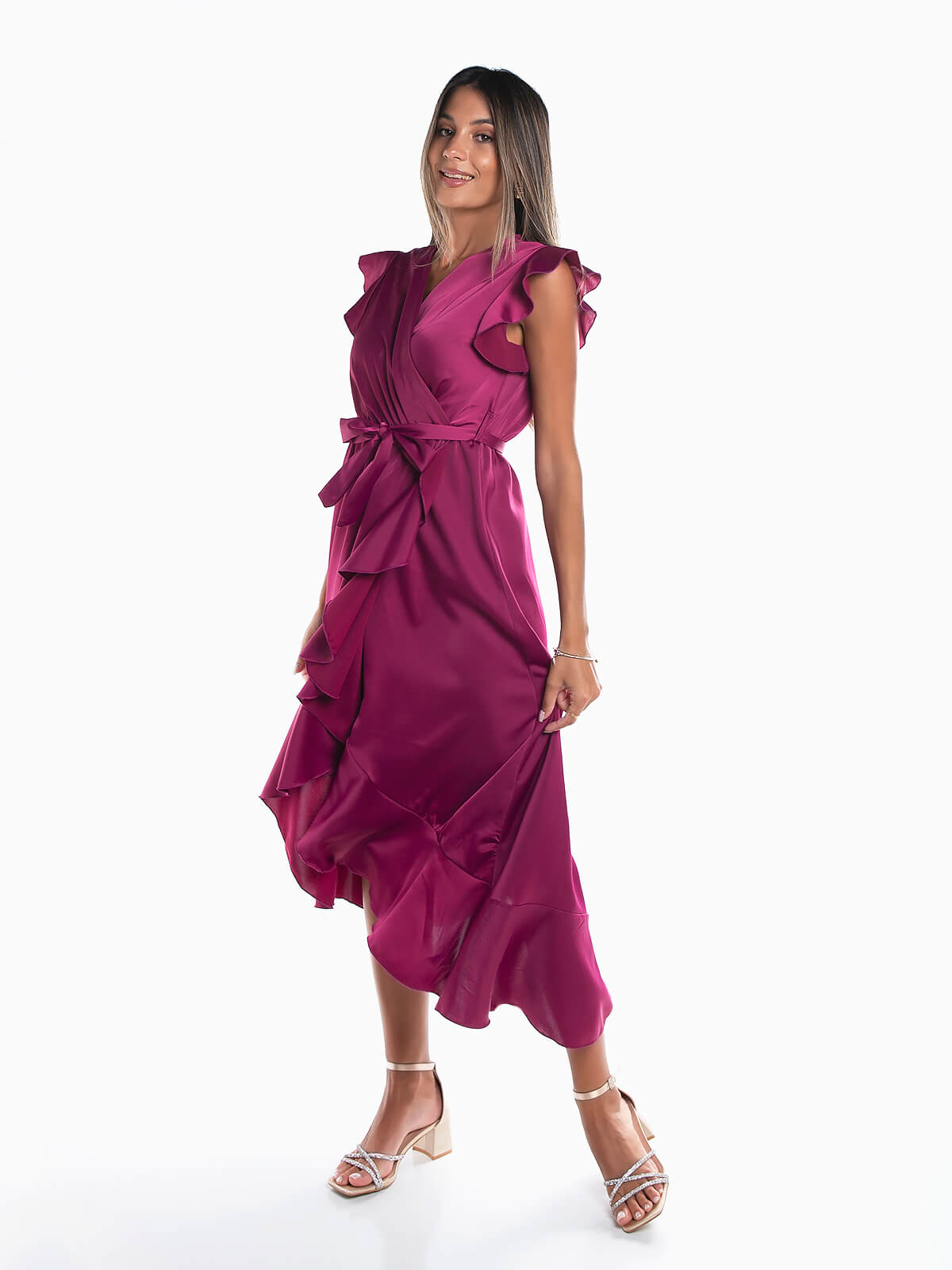 Vestido comprido acetinado com encaixe de folhos na cava e base. Vestido sem mangas com cintura elástica e decote cruzado. Cinto no mesmo tecido para laço. Pormenor aberto.