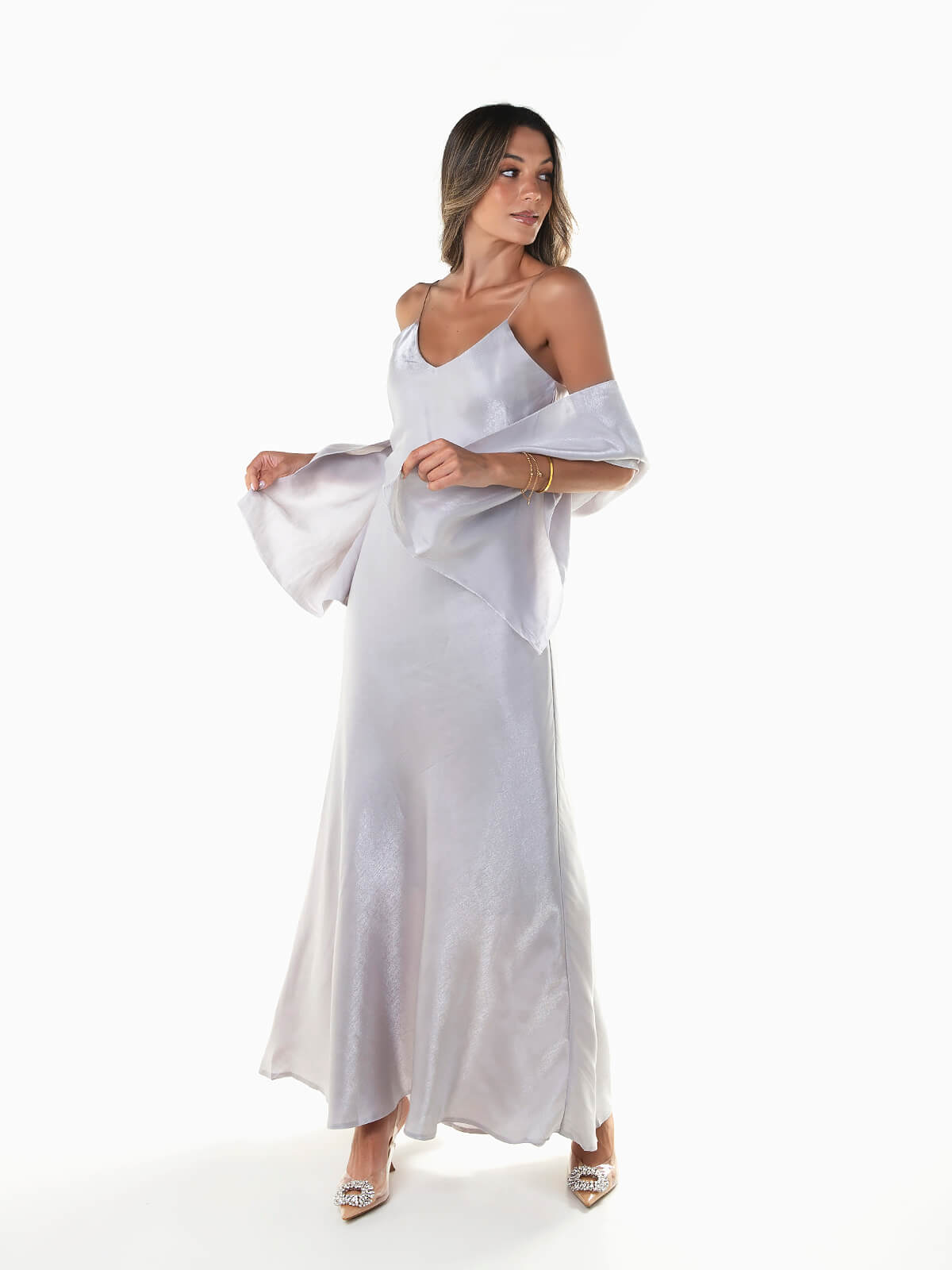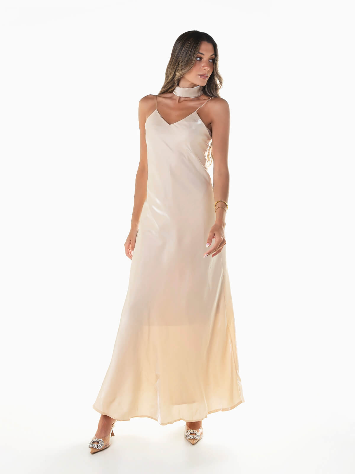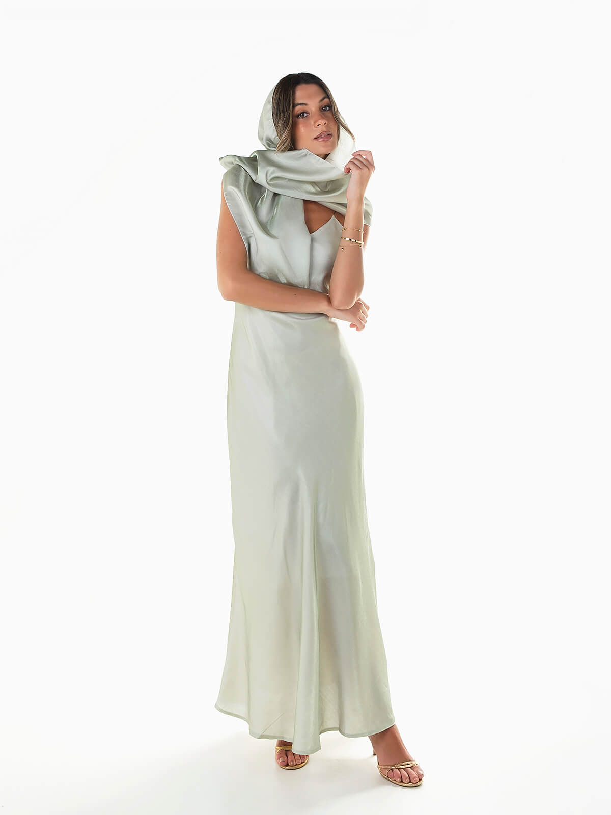 Vestido comprido acetinado com lenço no mesmo tecido para completar o look. Vestido de alças finas com decote em bico. Corte evasé.