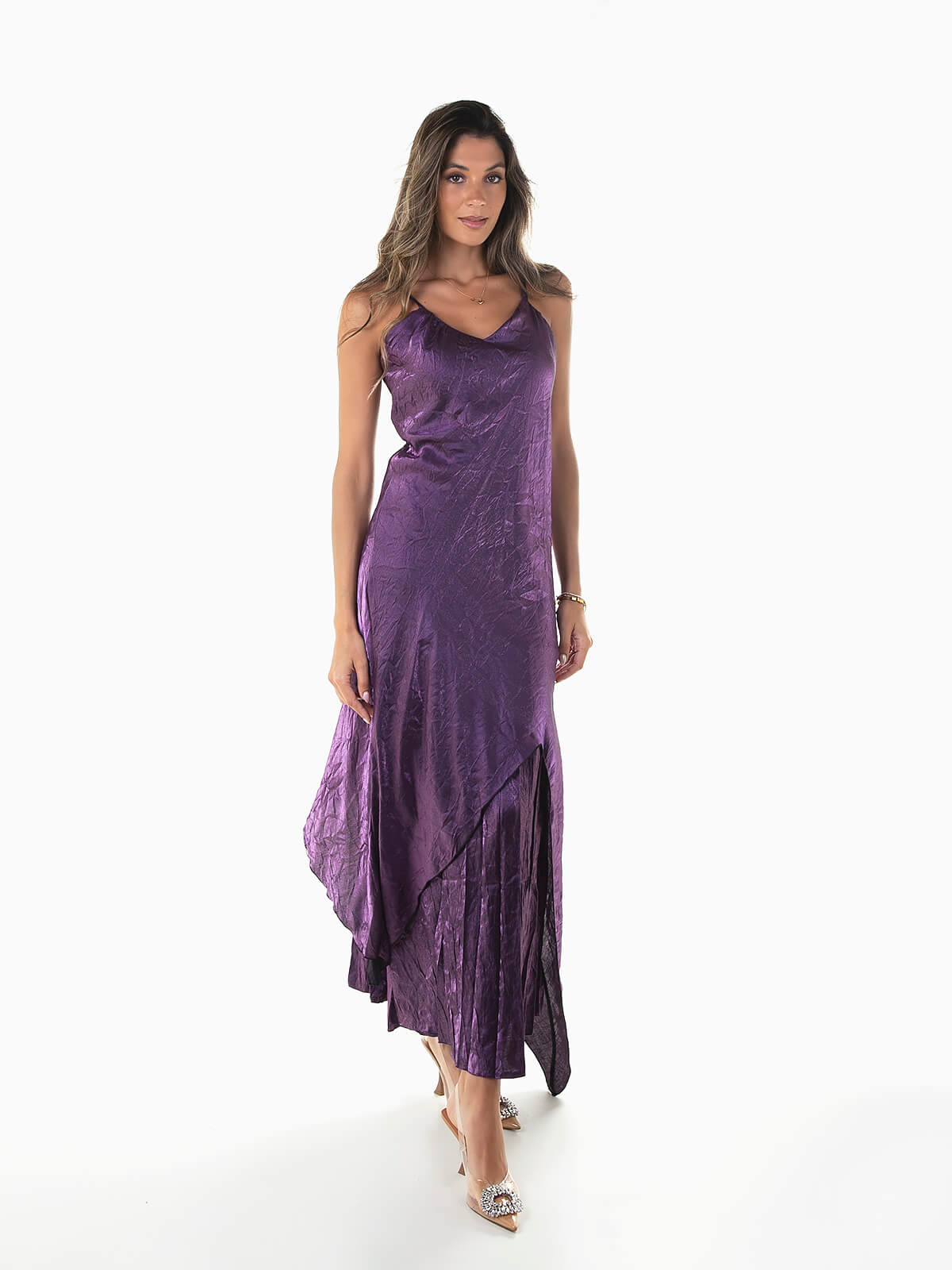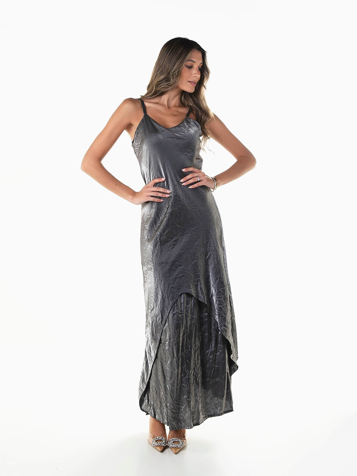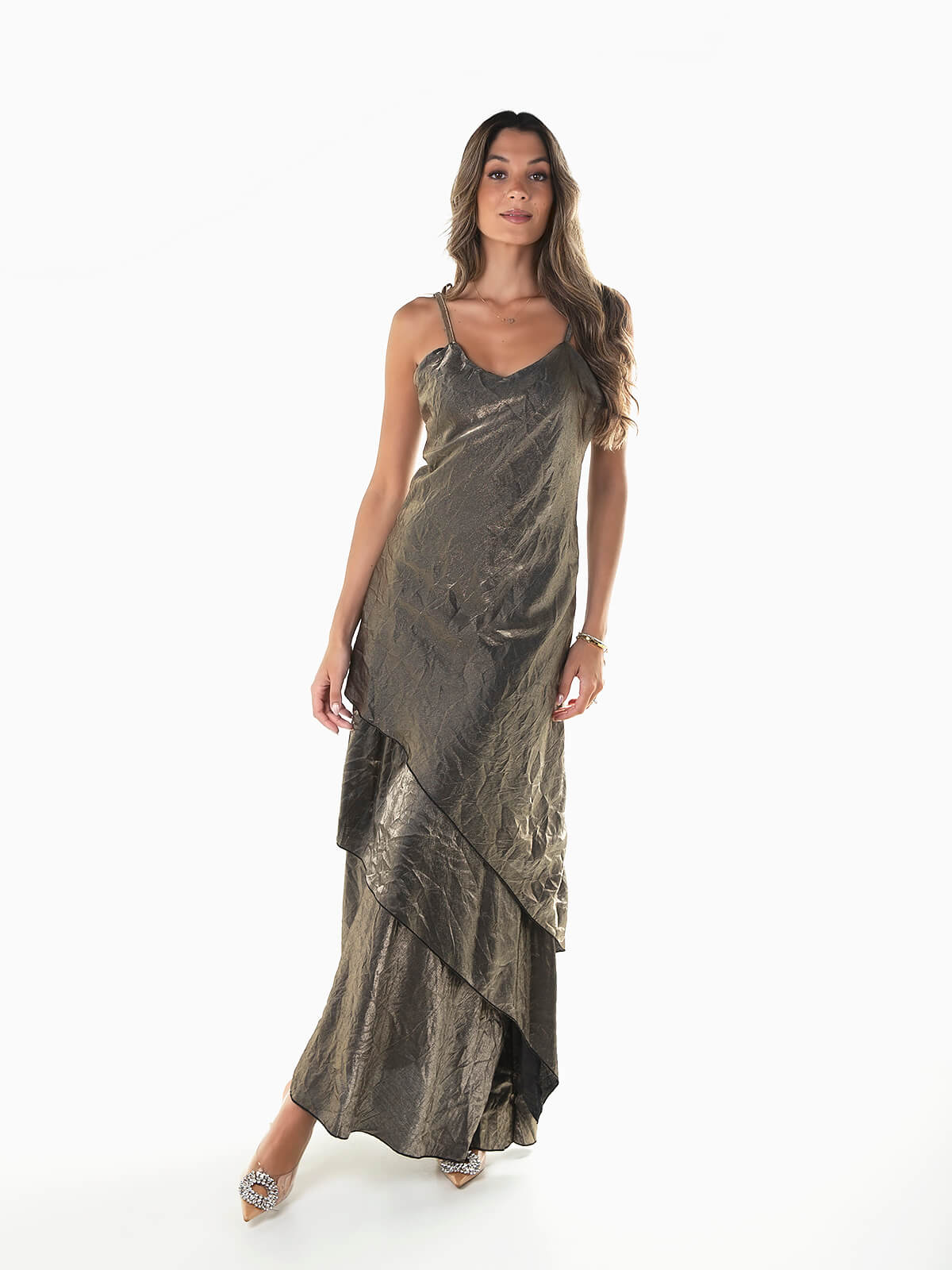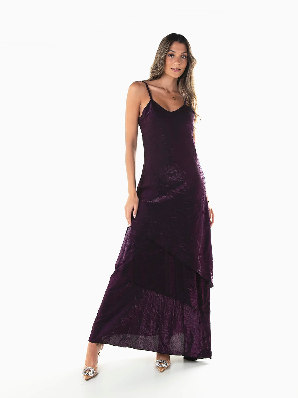 Vestido comprido acetinado com efeito enrugado e camadas. Vestido de alças com decote em bico. Corte evasé.