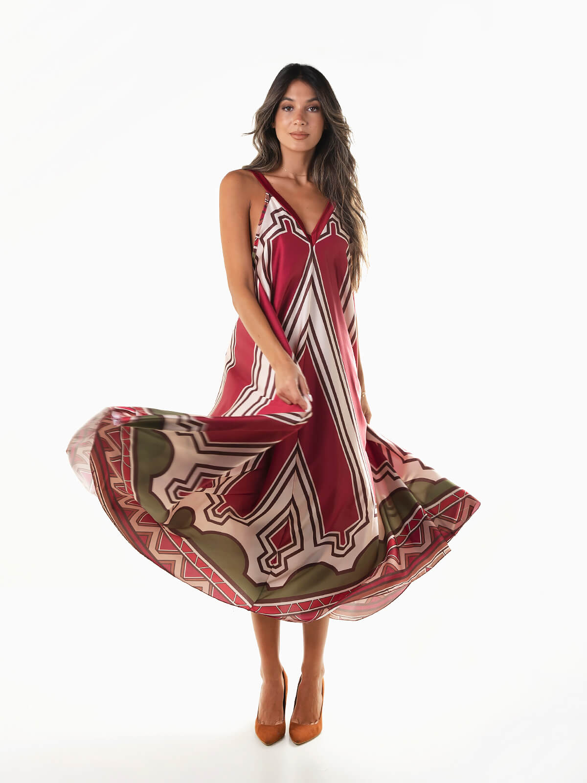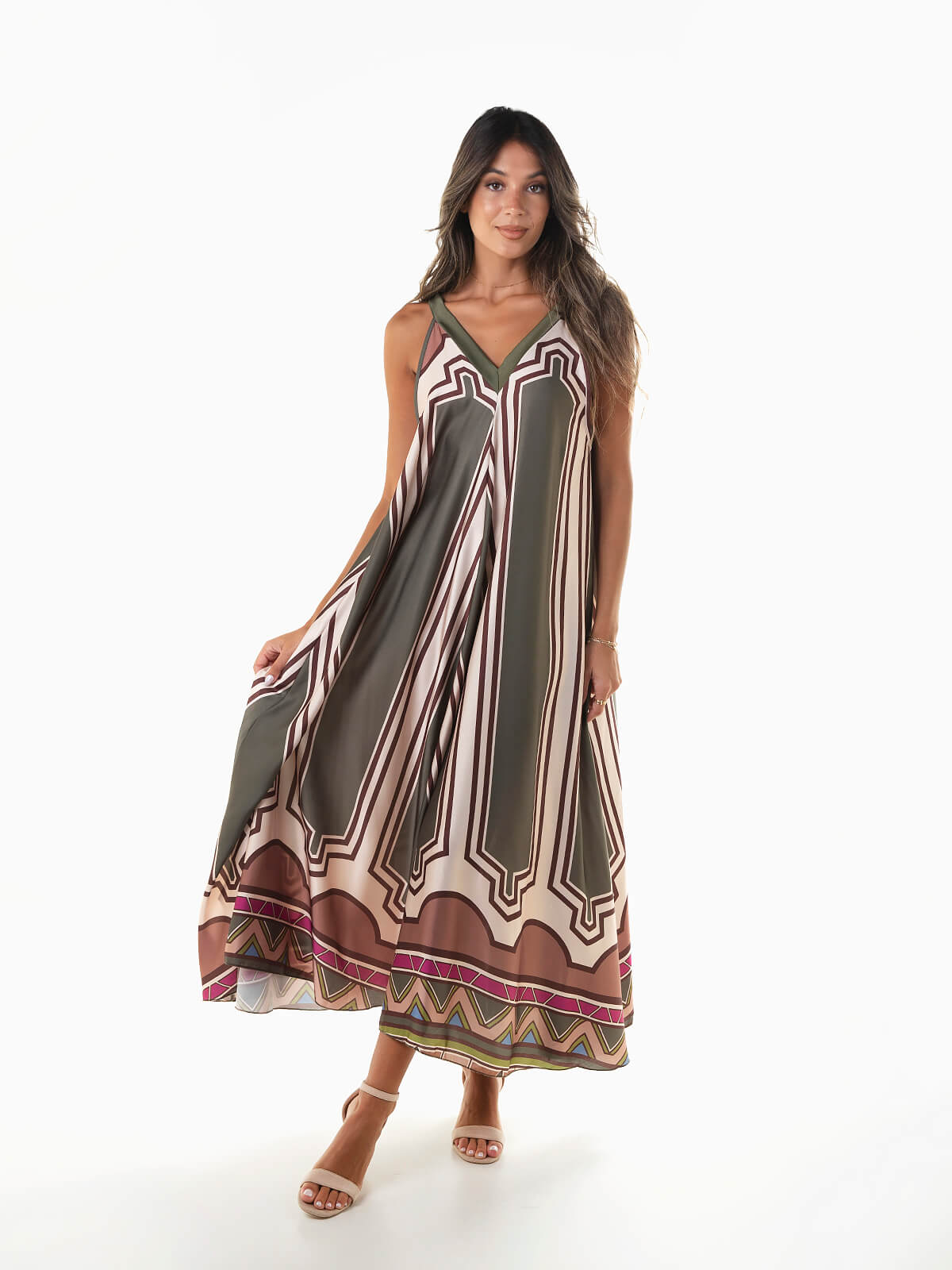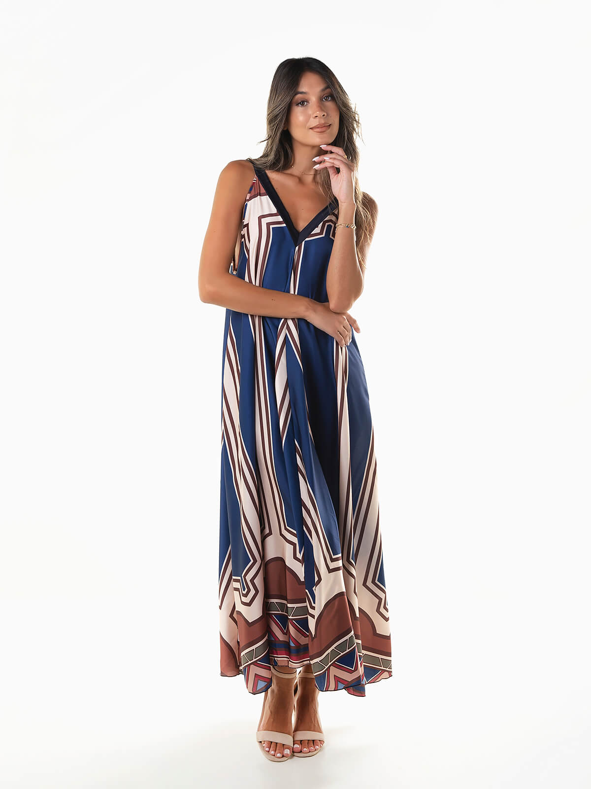 Vestido comprido acetinado com estampado e corte evasé. Vestido fluído de alças com decote em bico à frente e atrás.