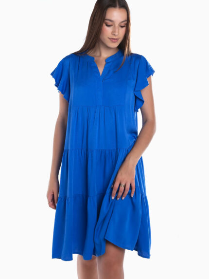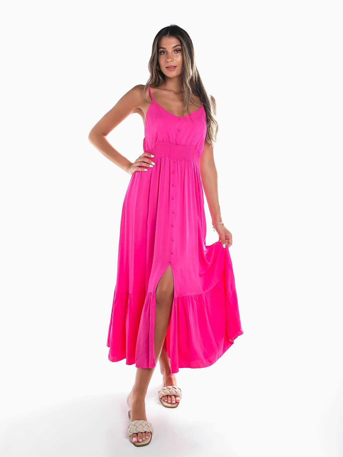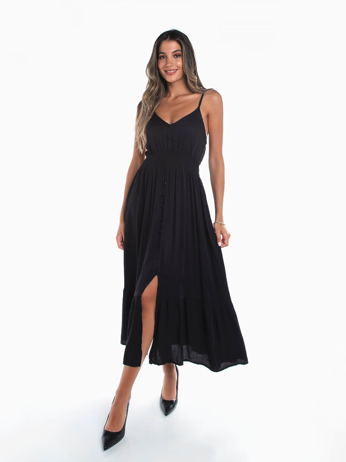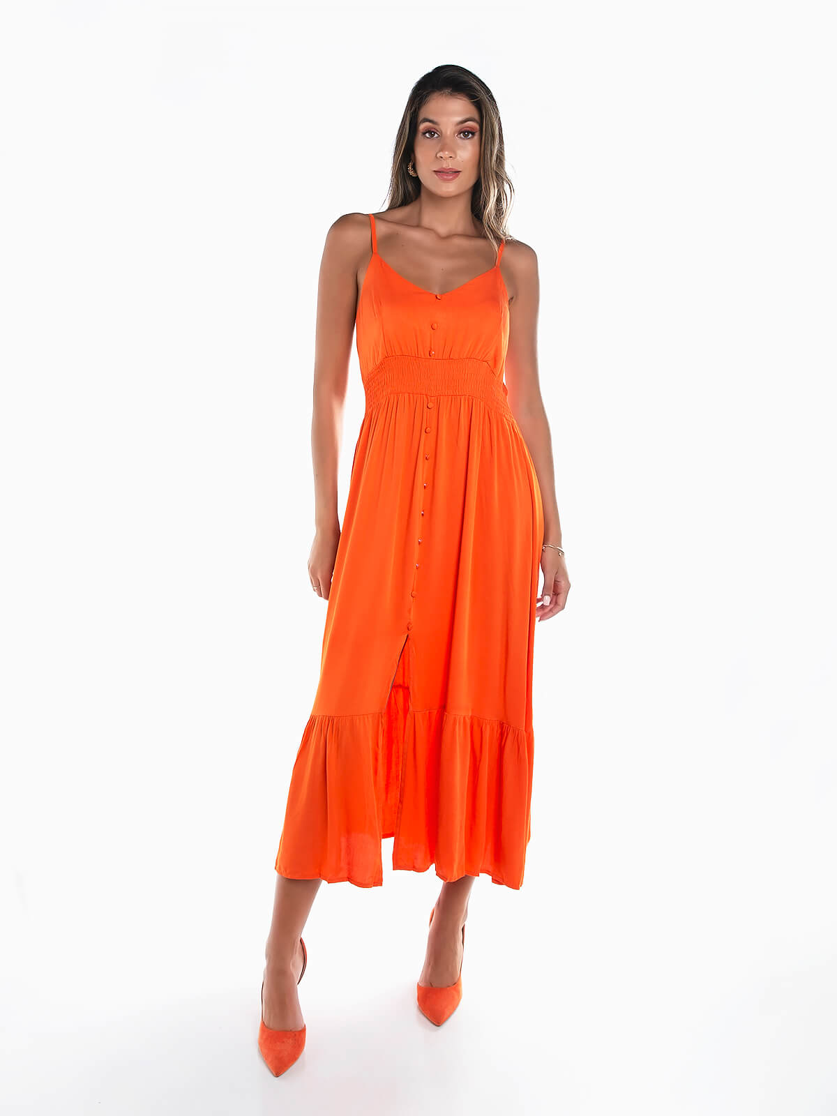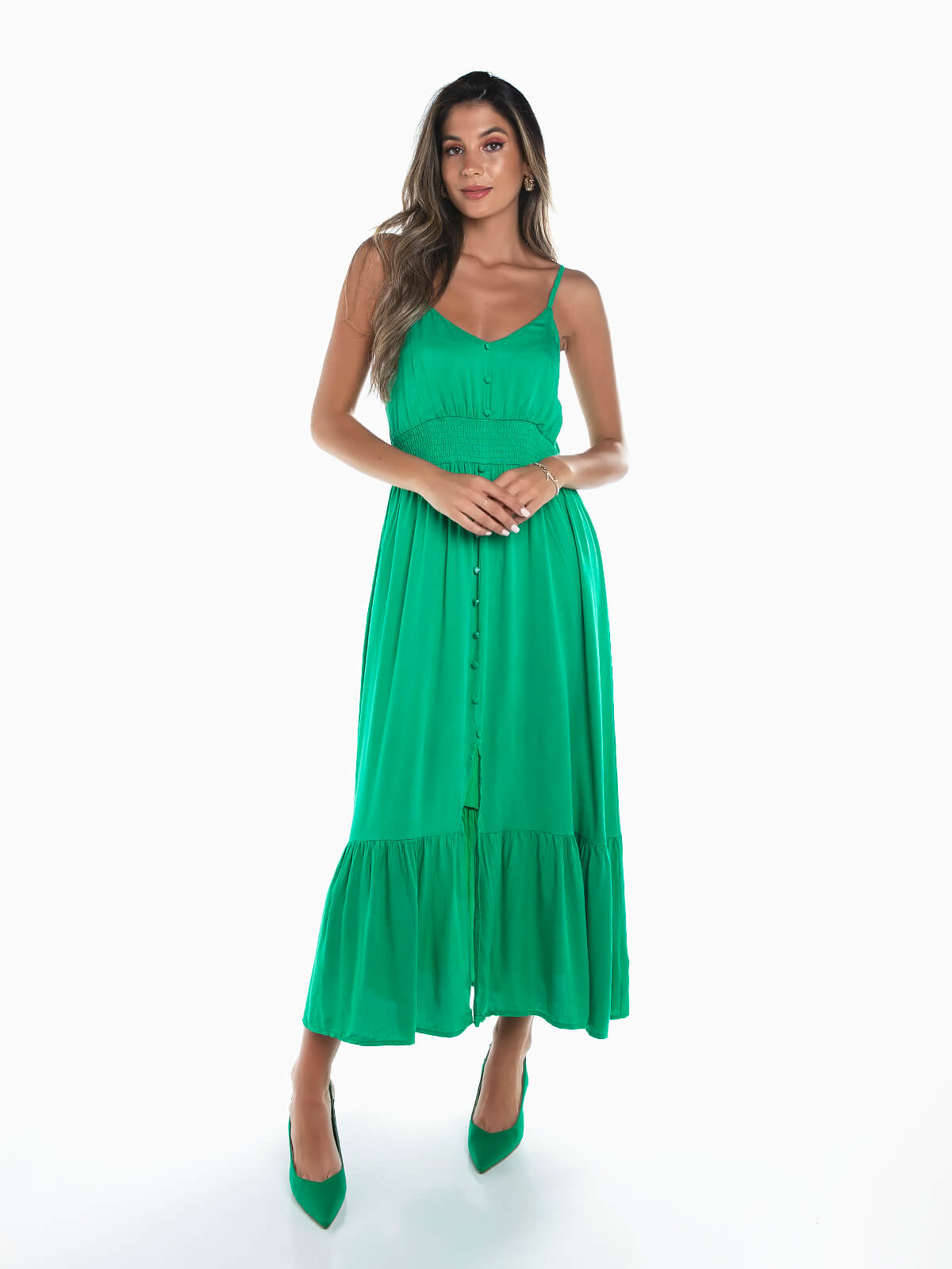 Vestido comprido de alças finas ajustáveis com encaixe de folhos. Vestido fluído com decote em V e elástico na cintura. Botões forrados decorativos. Abertura frontal.