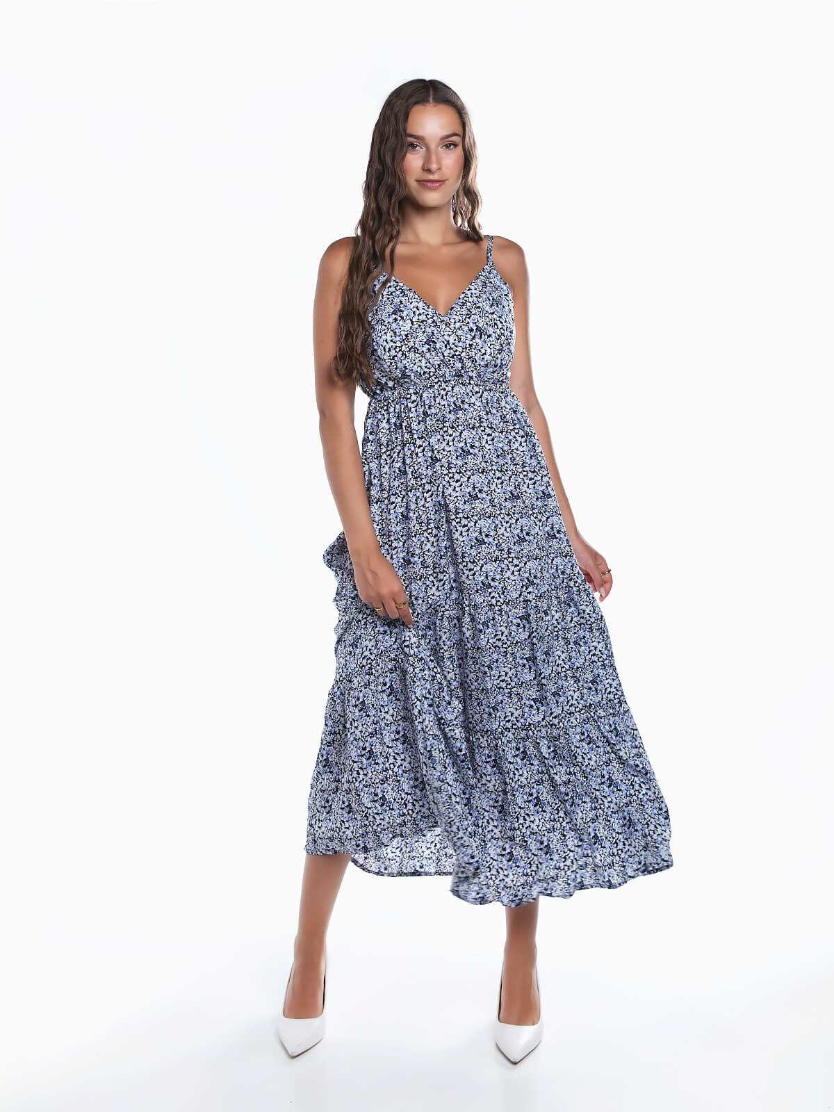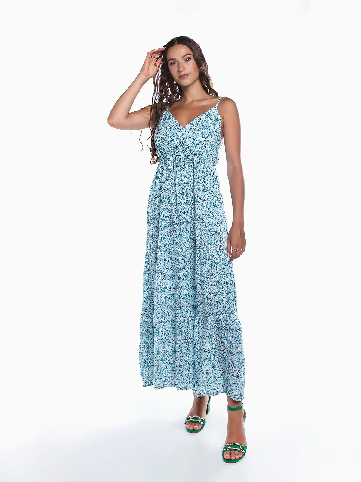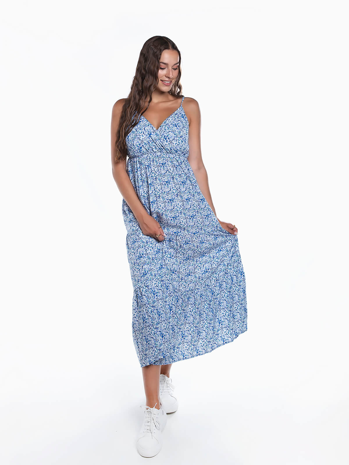 Vestido comprido de alças finas reguláveis com estampado floral. Vestido em tecido 100% algodão de cintura elástica e encaixe de folhos. Decote trespasse.
