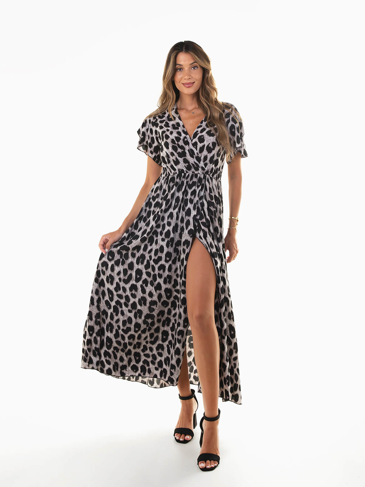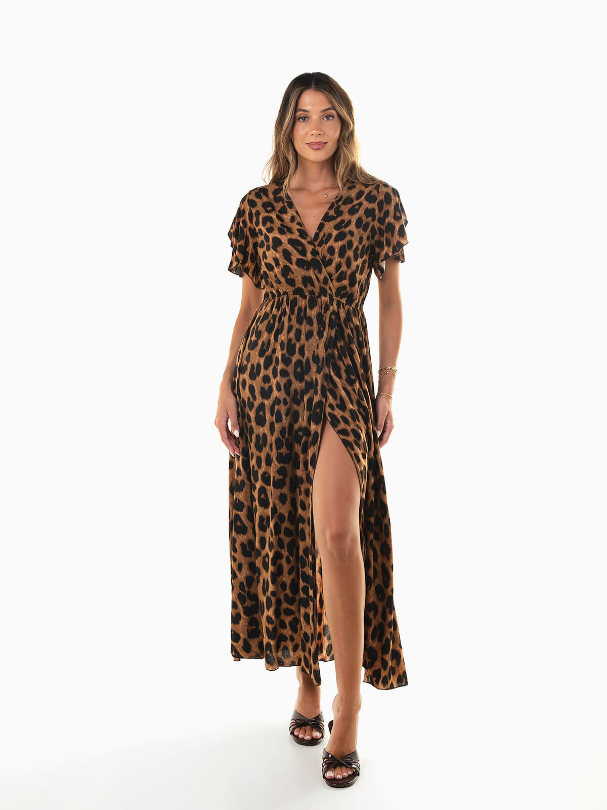 Vestido comprido animal print com abertura na base. Vestido fluído de manga curta com decote cruzado e cintura elástica. Combina na perfeição com sandálias de salto para um look sofisticado ou com sandálias rasas para um visual mais descontraído e confortável.