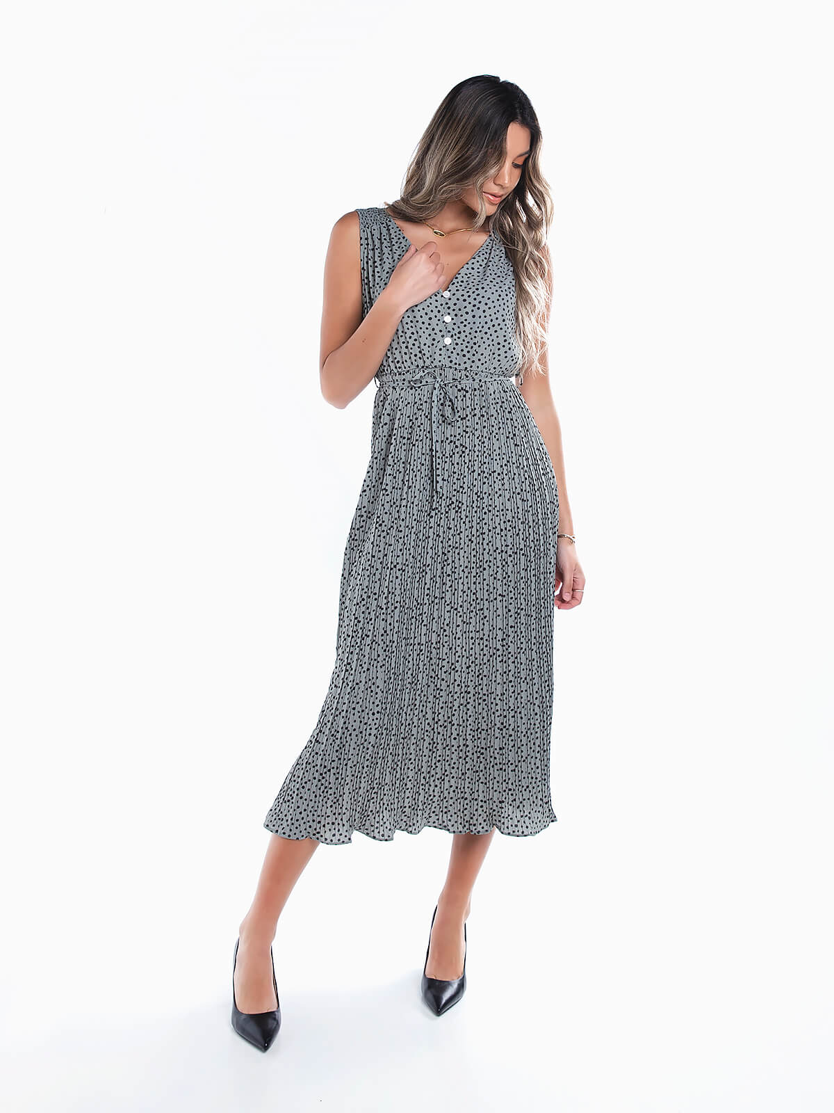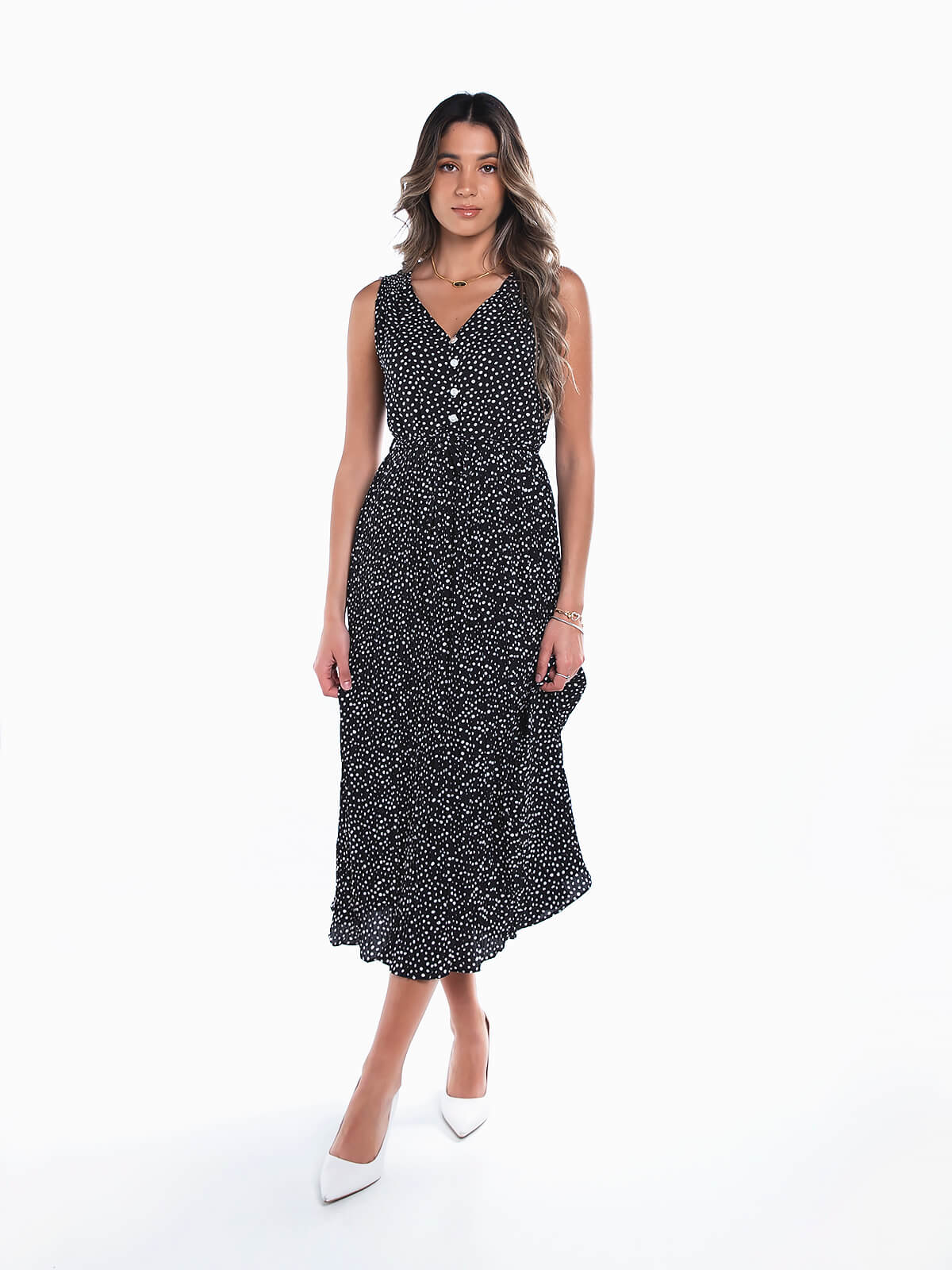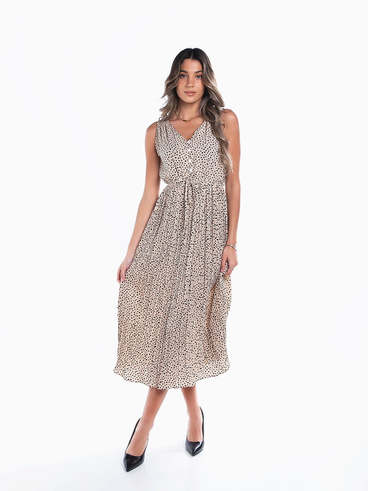 Vestido comprido com estampado de bolas. Vestido plissado sem mangas com decote em V e aperto de botões. Cintura elástica com cordão para ajustar.