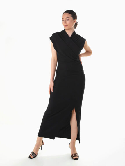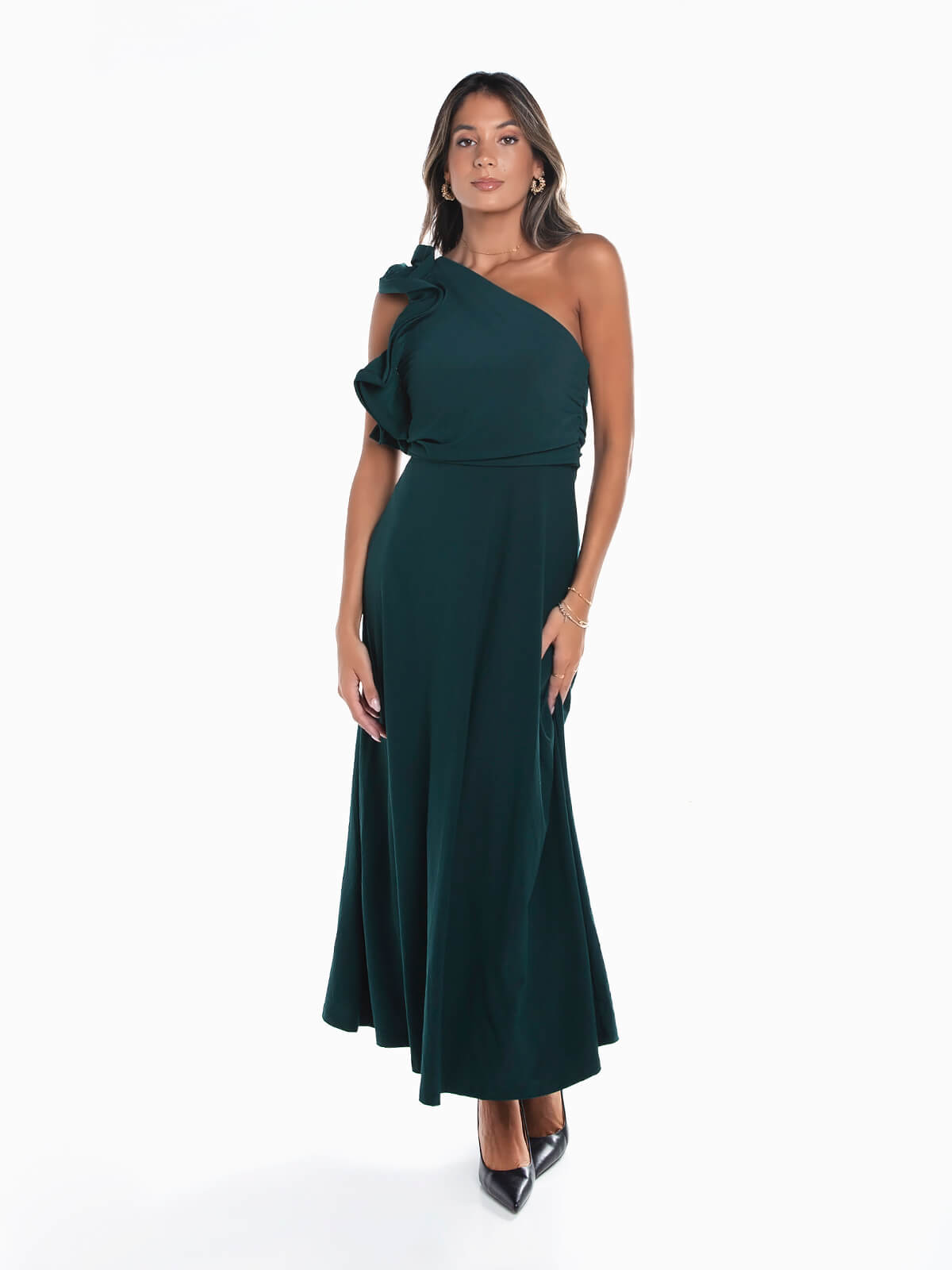 Vestido comprido assimétrico com folho ondulado aplicado ao longo do ombro. Vestido corte evasé com pormenores franzidos na cintura.