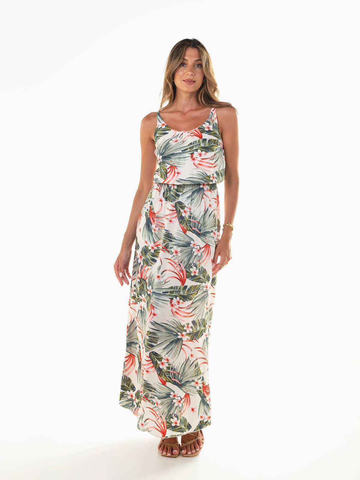 Vestido comprido bege claro com padrão tropical em contraste. Vestido de alças ajustáveis e cintura elástica. Decote redondo. O modelo ideal para os dias de sol: leve, fresco e cheio de cor.