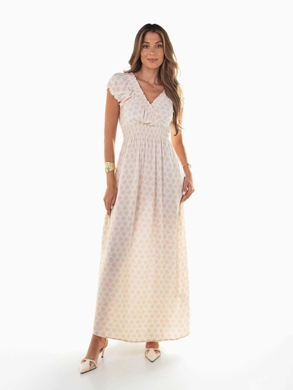 Vestido comprido fluído com estampado veranil para mulher. Vestido sem mangas com decote cruzado e cintura franzida para maior conforto.