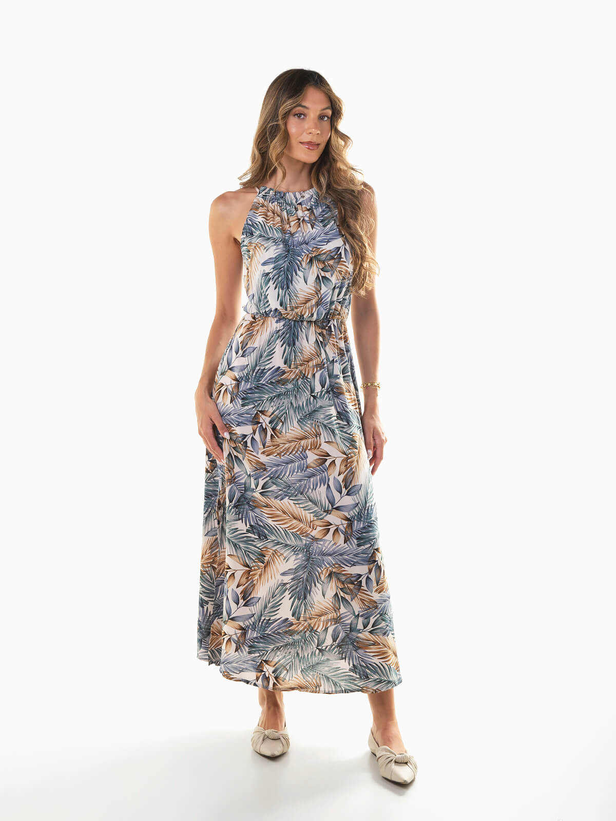Vestido comprido bege com estampado folhas e aberturas laterais. Vestido de alças ajustáveis com decote halter e cintura elástica.
