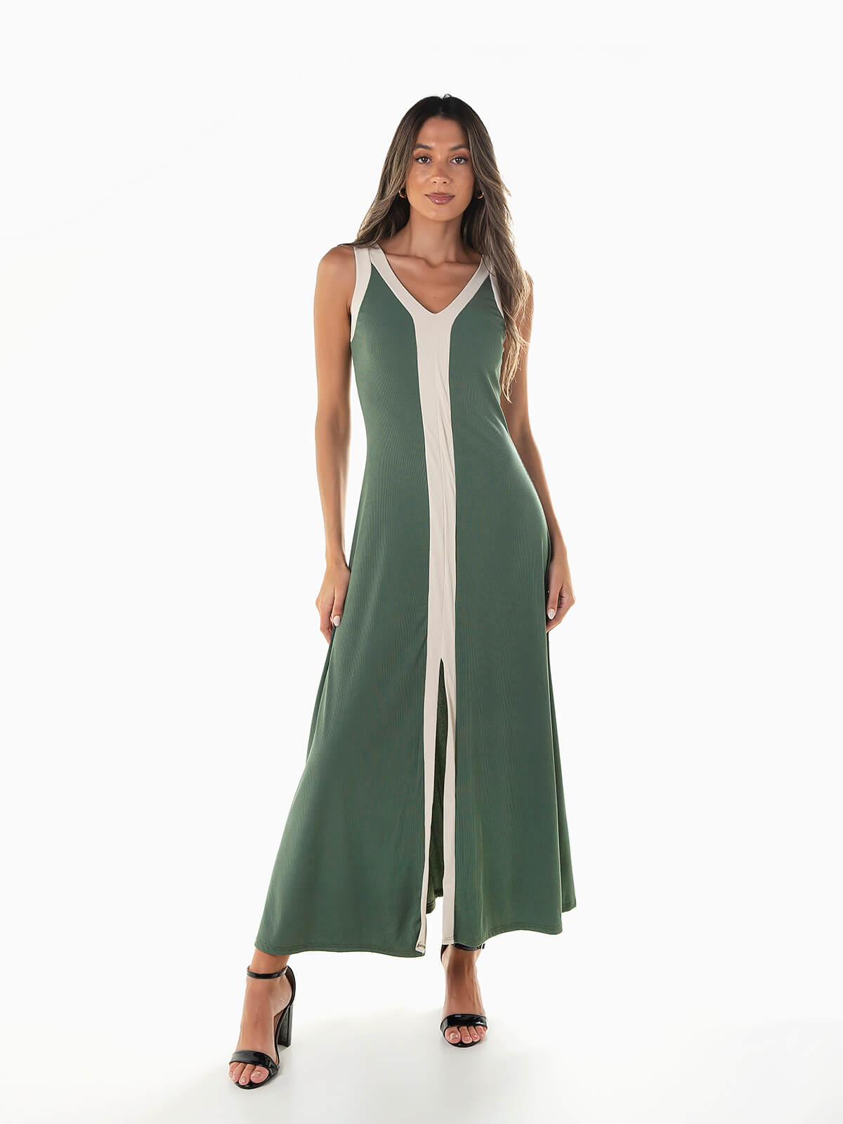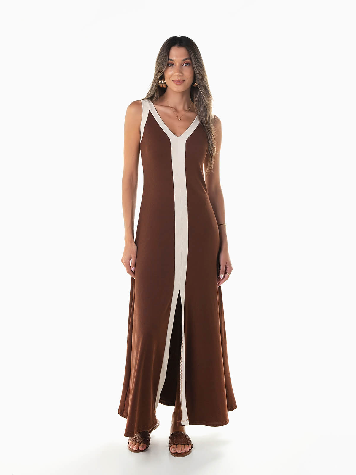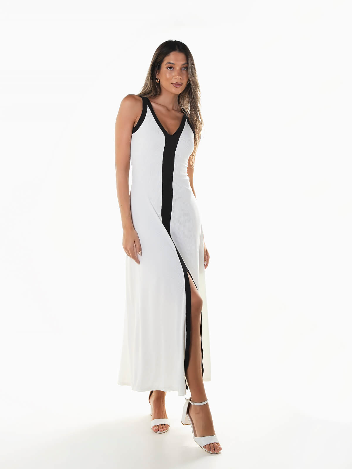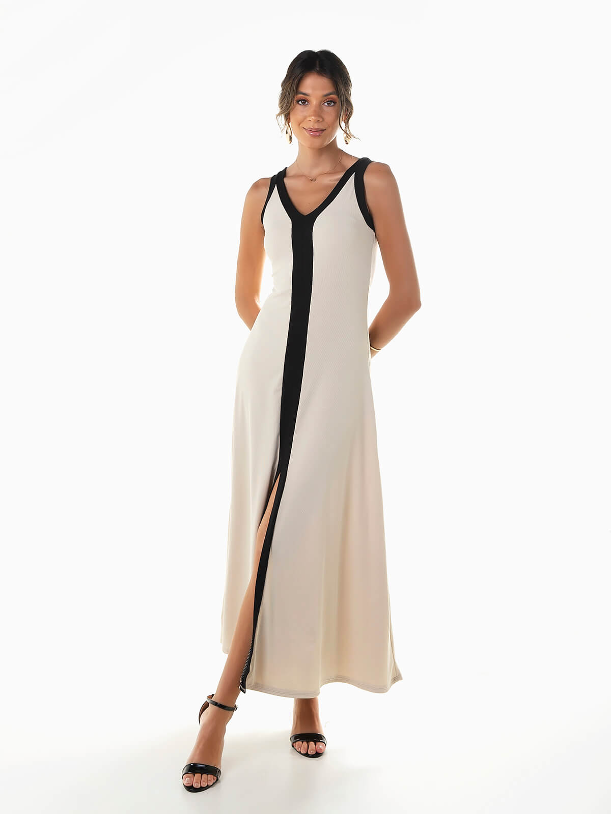 Vestido comprido bicolor em malha canelada para mulher. Vestido de alças com corte evasé e decote em V à frente e atrás. Abertura na base.