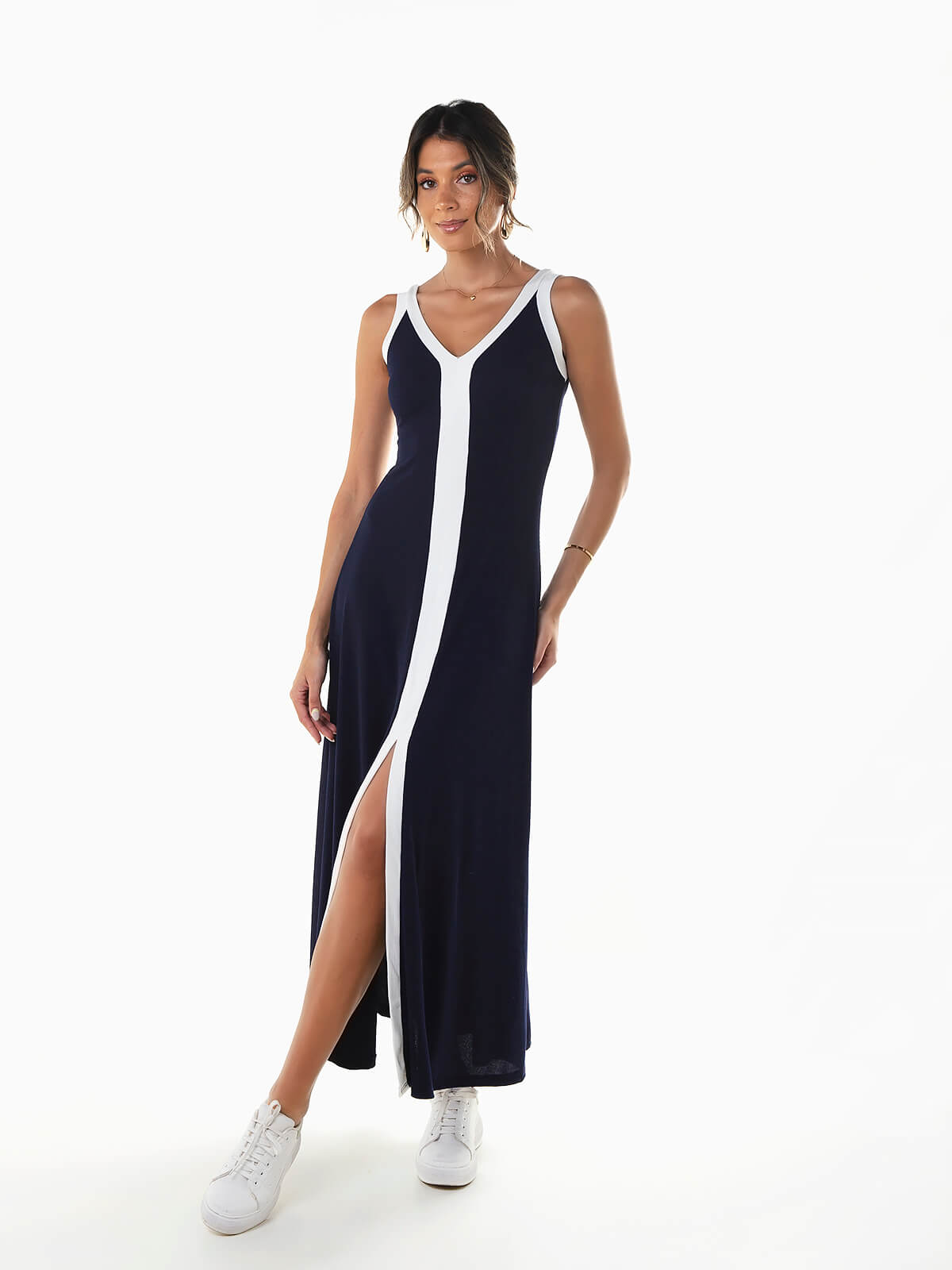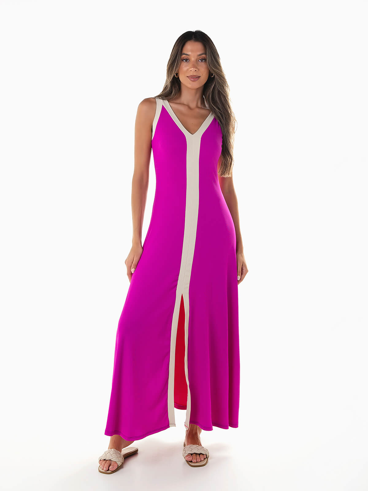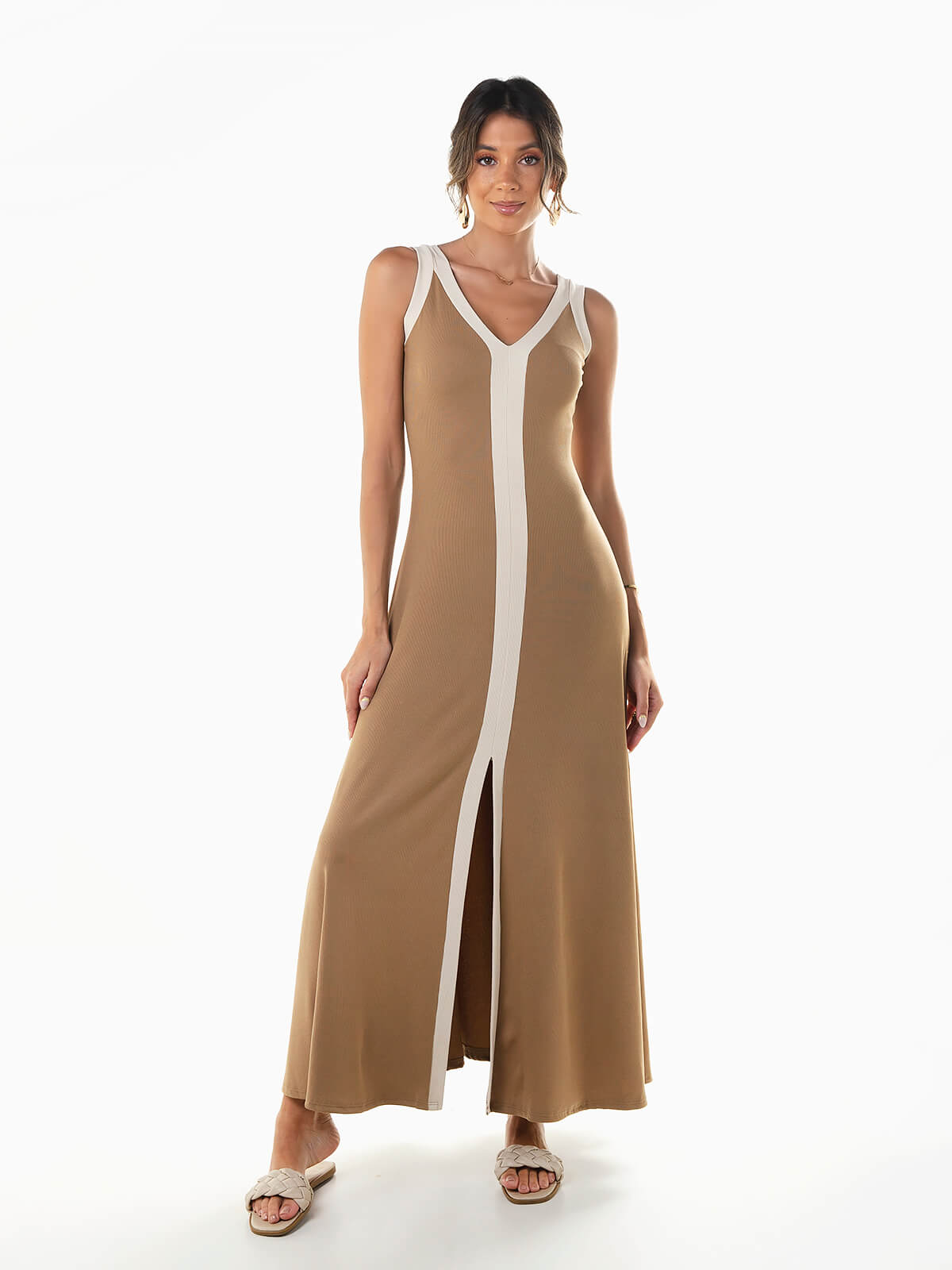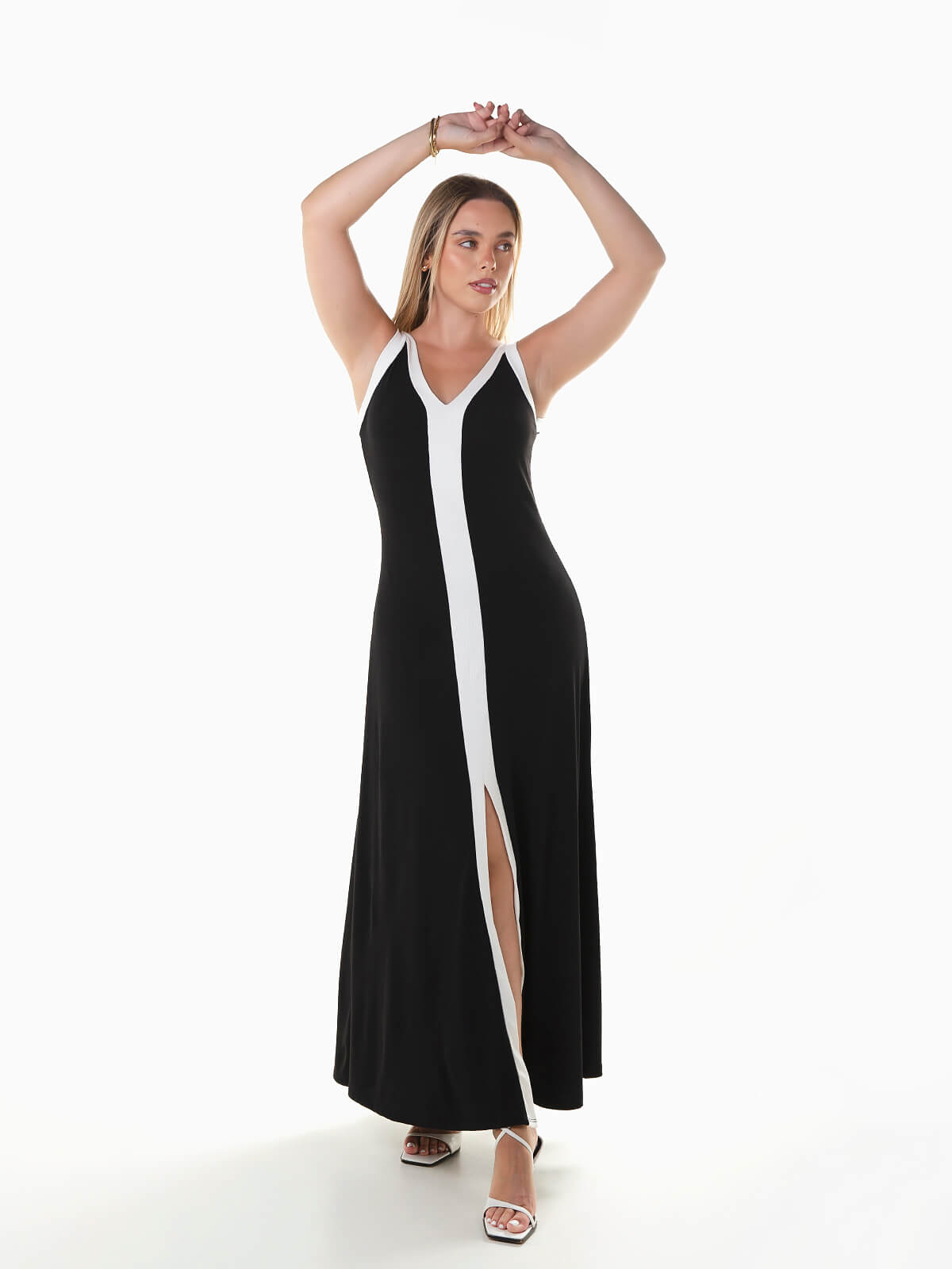 Vestido comprido bicolor em malha canelada para mulher. Vestido de alças com corte evasé e decote em V à frente e atrás. Abertura na base.