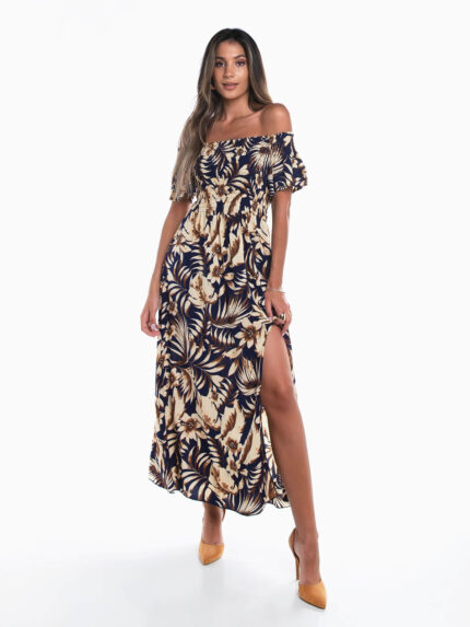 Vestido comprido branco rendilhado com missangas aplicadas para senhora. Vestido com alças reguláveis e decote em V. Interior forrado. Estilo boho. Parte posterior em franzido smock.
