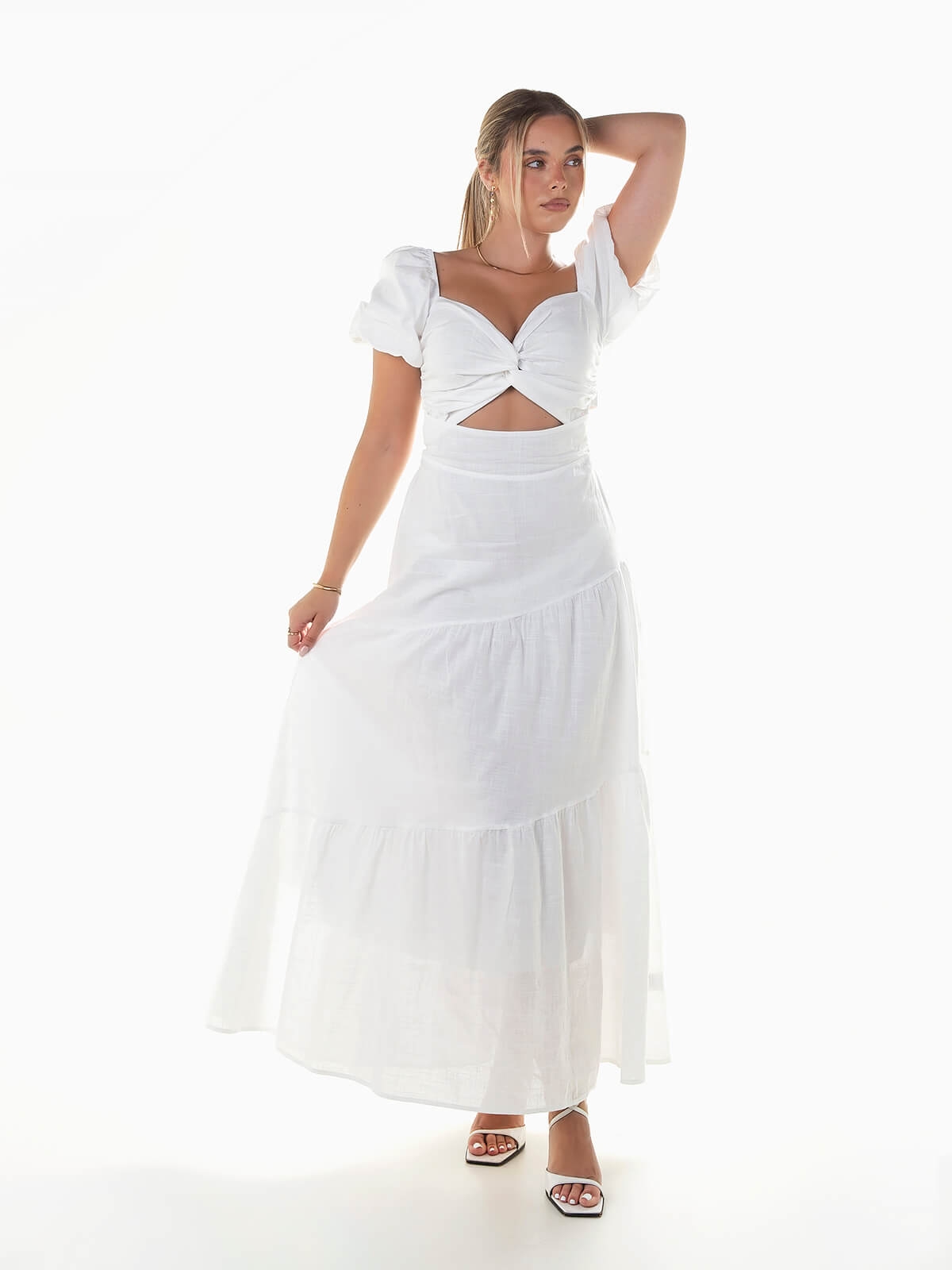 Vestido comprido branco com pormenores cut out e painéis. Vestido de manga curta abalonada com costas descobertas e tira elástica. Interior forrado. Decote coração.