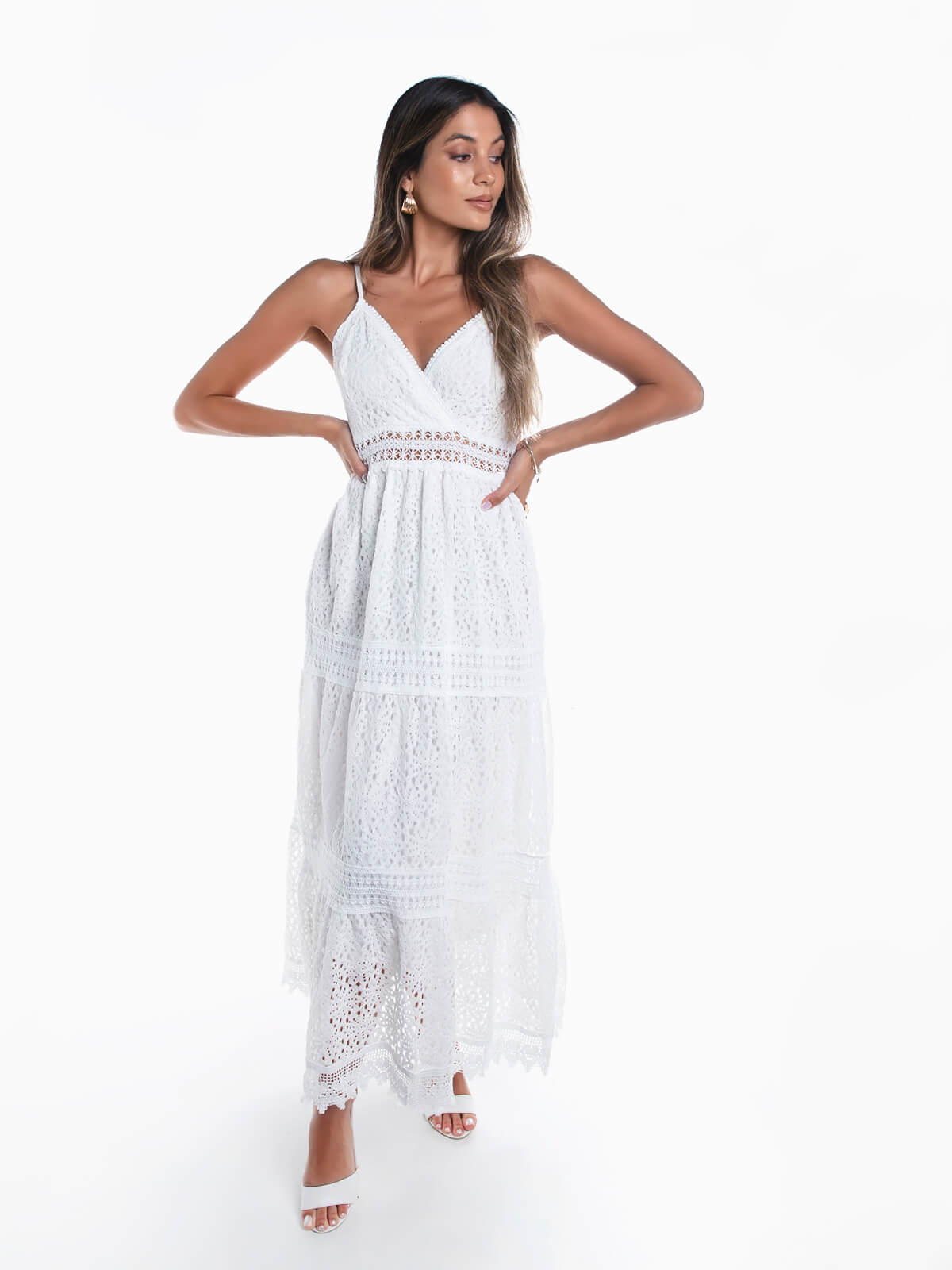 Vestido comprido branco rendilhado para senhora. Vestido com alças reguláveis e decote cruzado. Interior forrado. Estilo boho. Parte posterior em franzido smock.