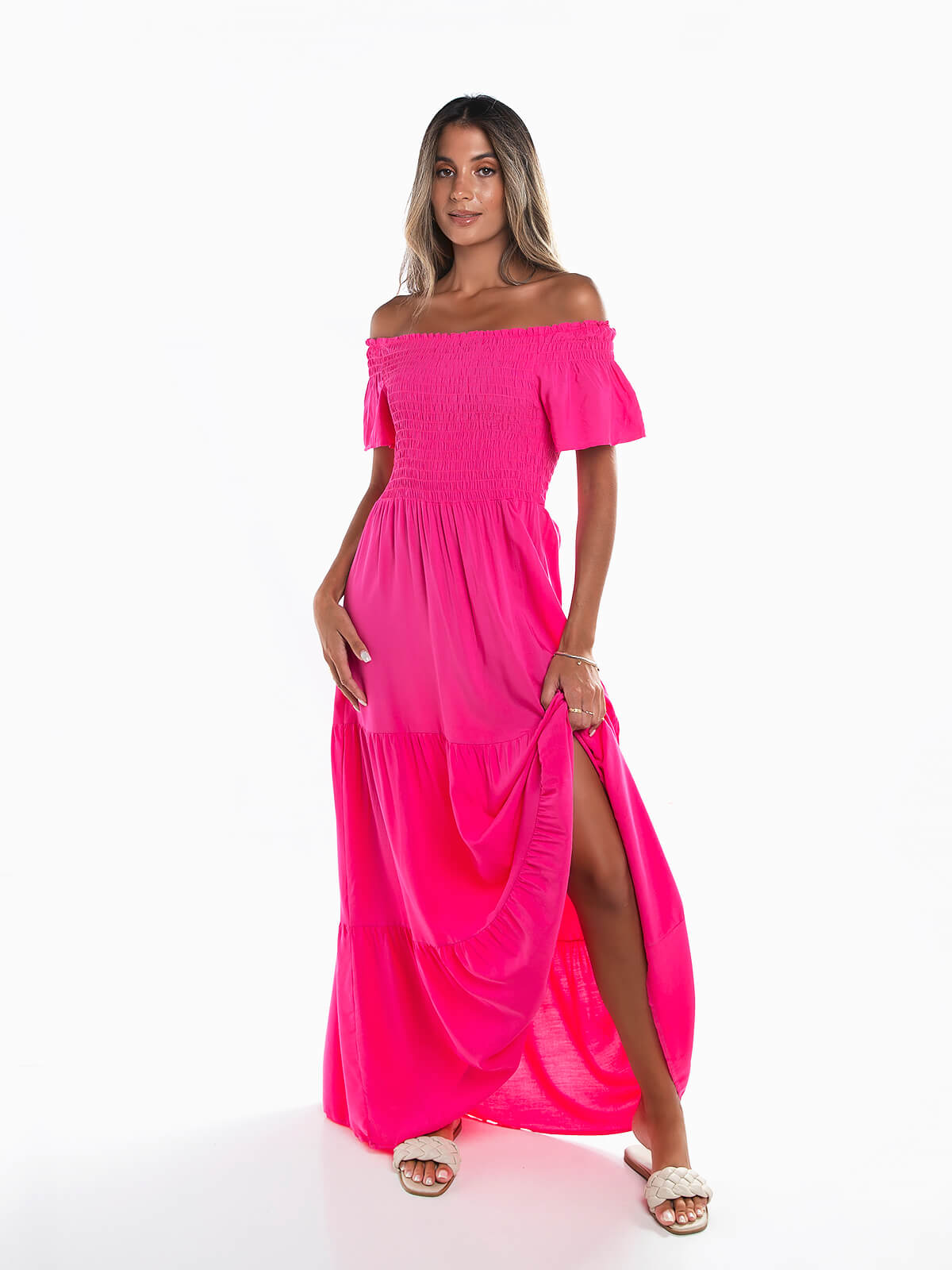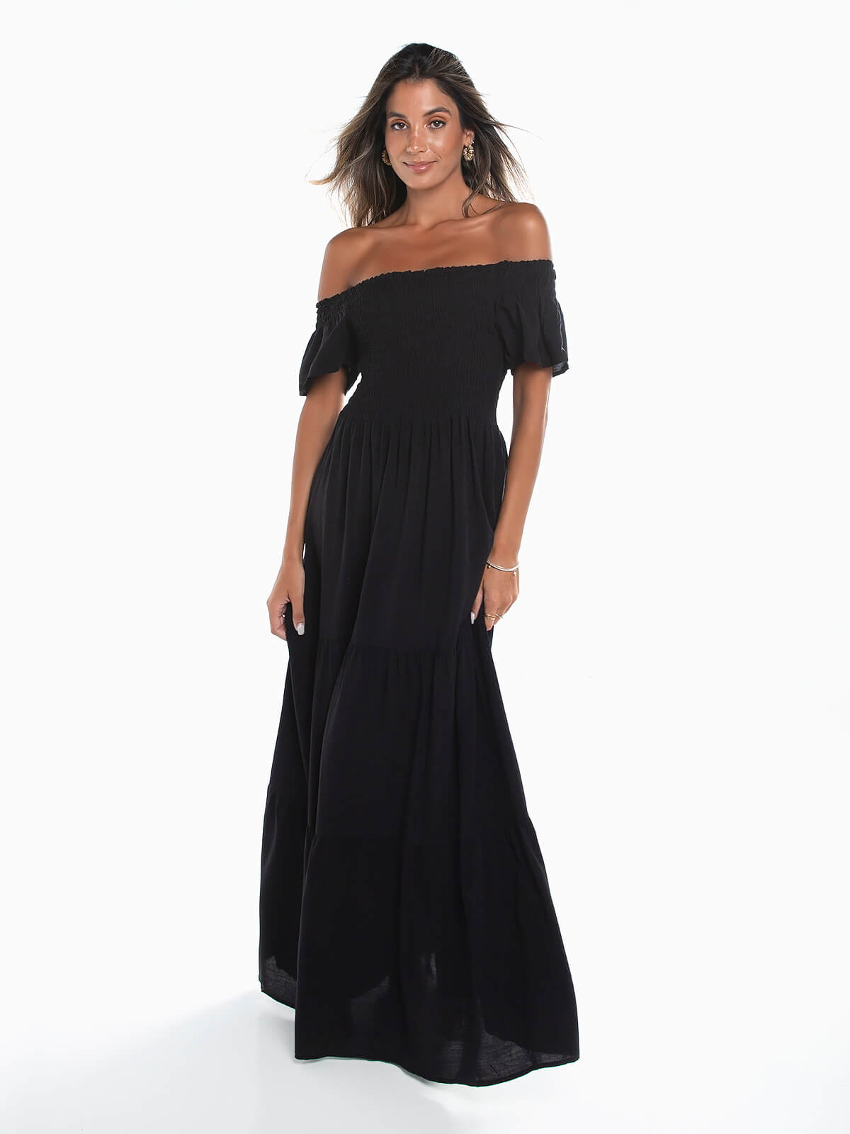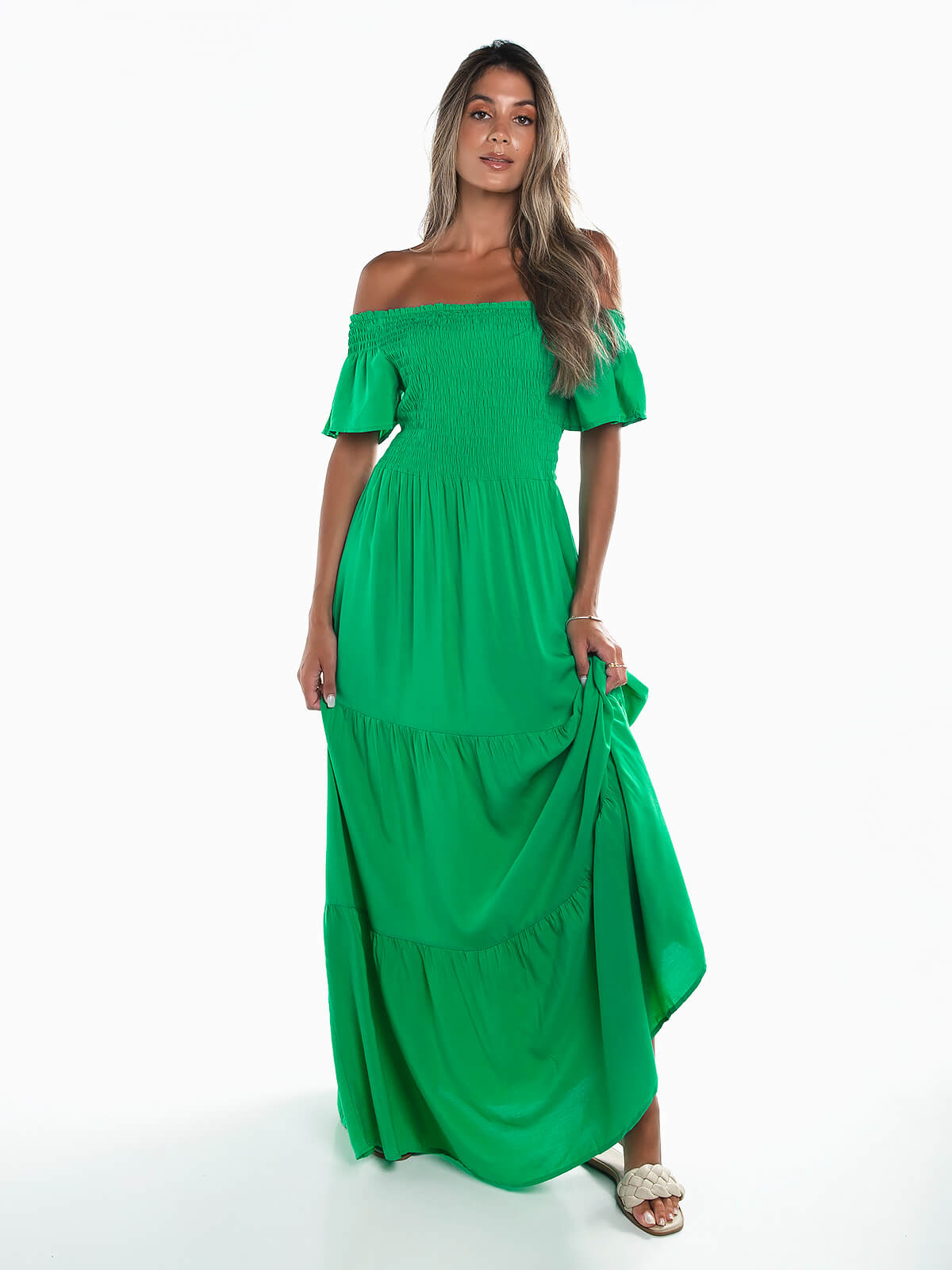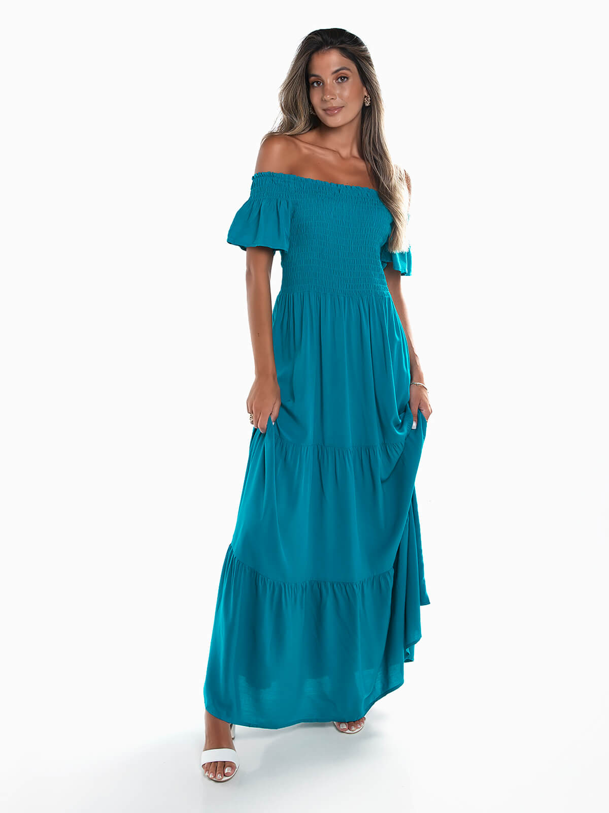 Vestido comprido com decote barco e peito em franzido smock. Vestido fluído de manga curta com encaixe de folhos em tecido 100% algodão.