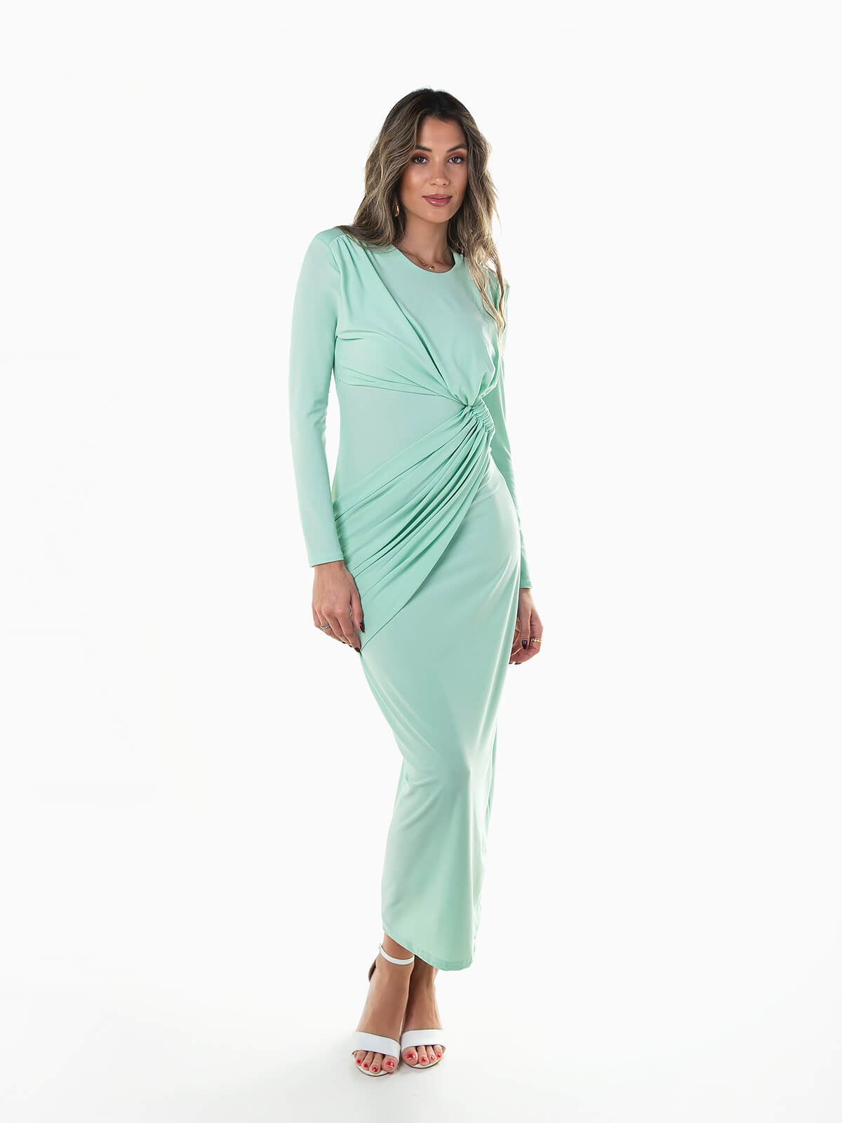 Vestido comprido com pormenor torcido na lateral. Vestido drapeado de manga comprida com abertura na base. Corte justo. Decote redondo.
