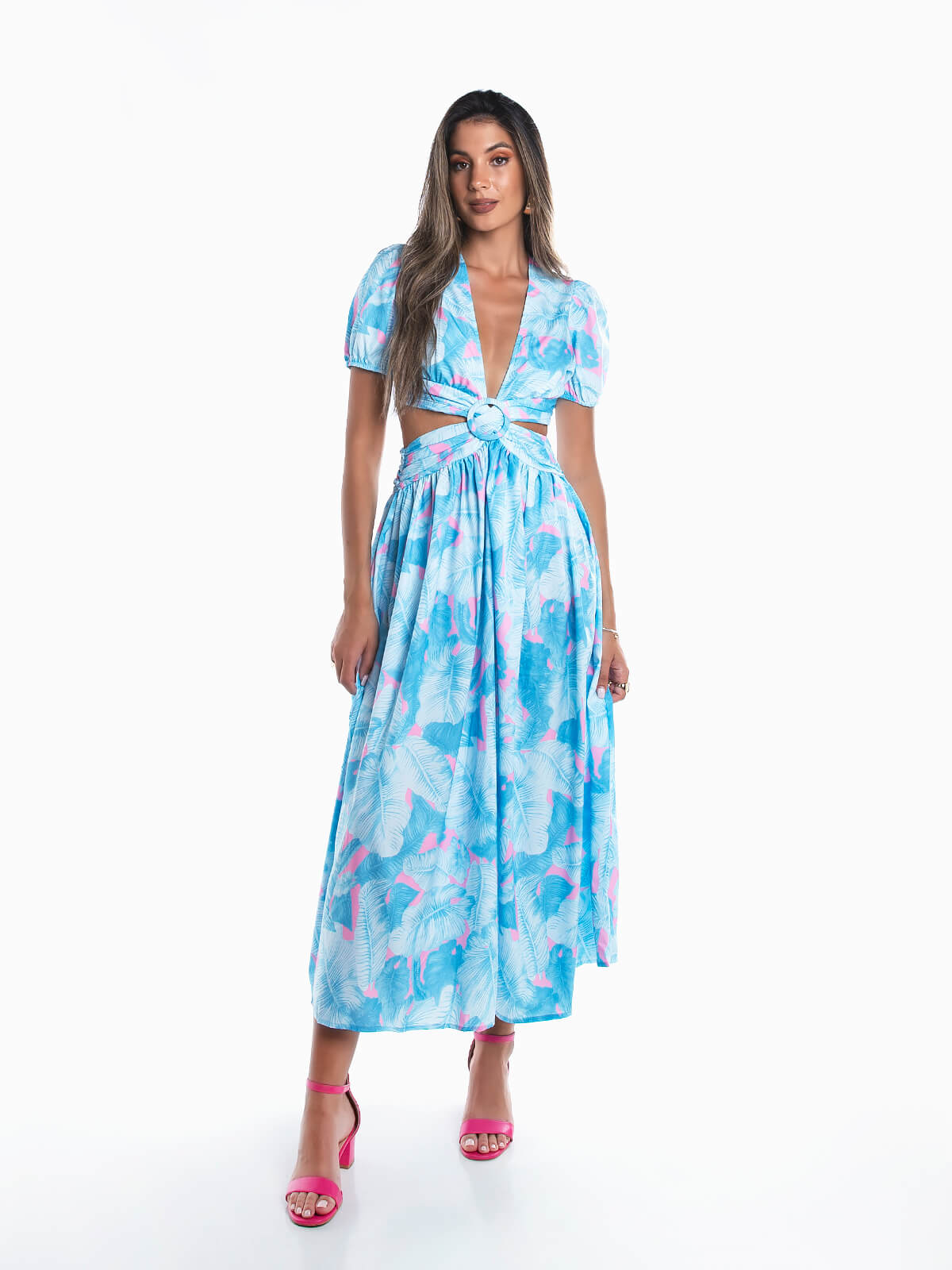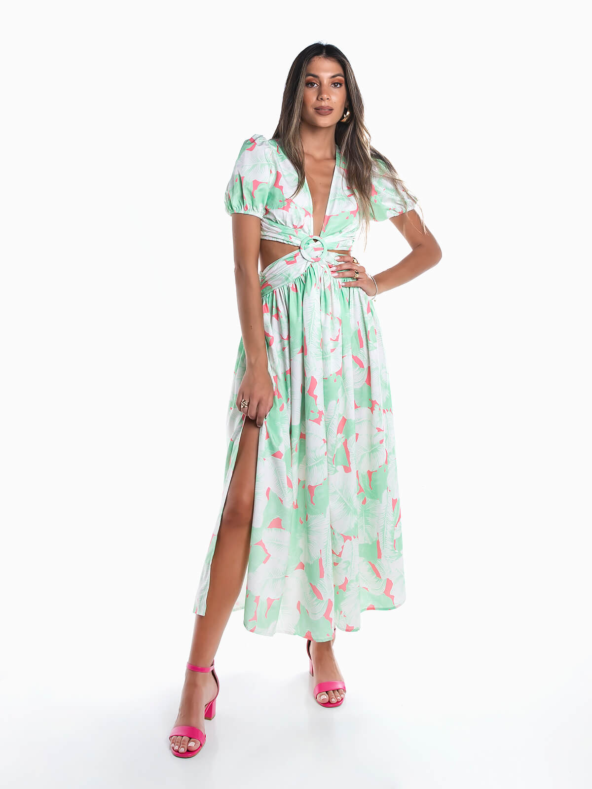 Vestido comprido com cut out para senhora. Vestido de manga curta abalonada com estampado de folhas e decote em bico. Aperto posterior de fechos éclair.