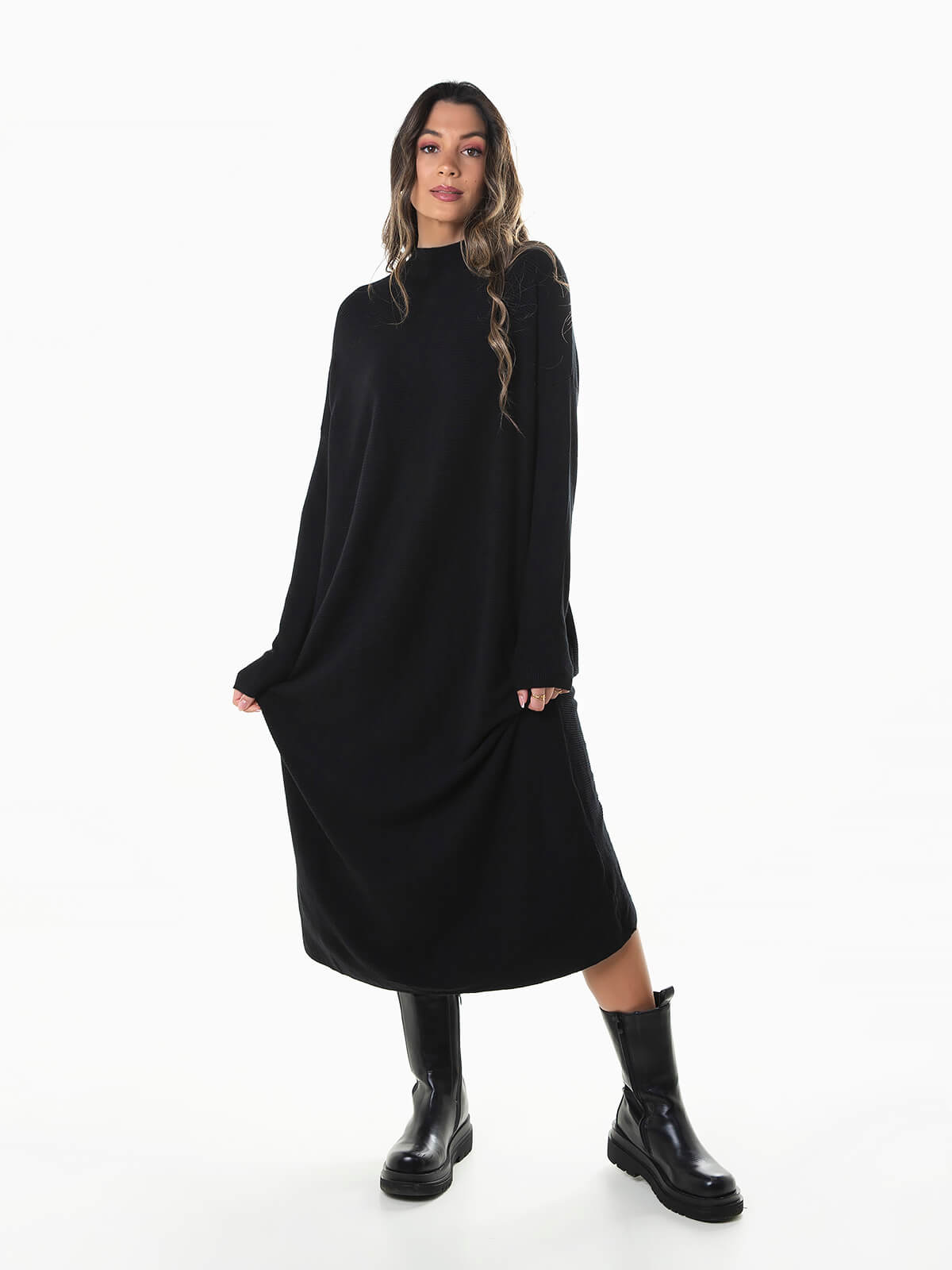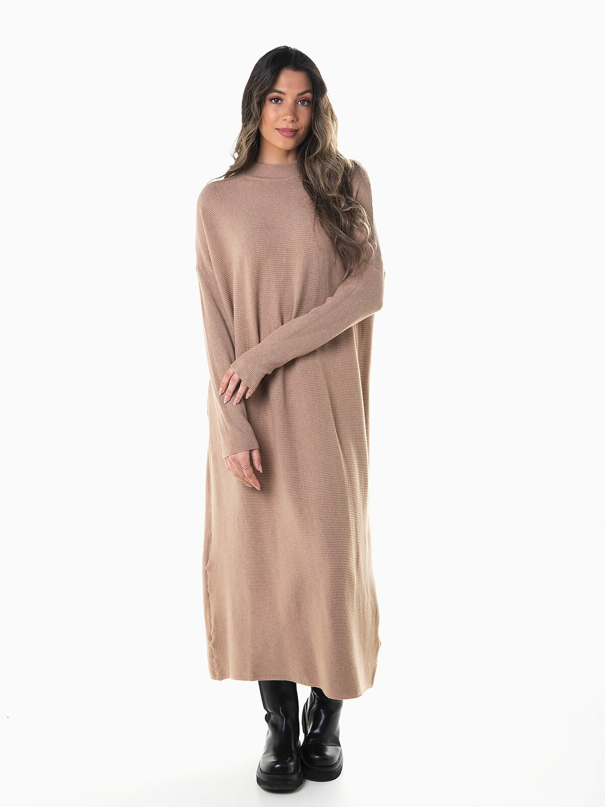 Vestido comprido de malha canelada para senhora. Vestido largo de manga comprida com ombros descaídos. Gola perkins.