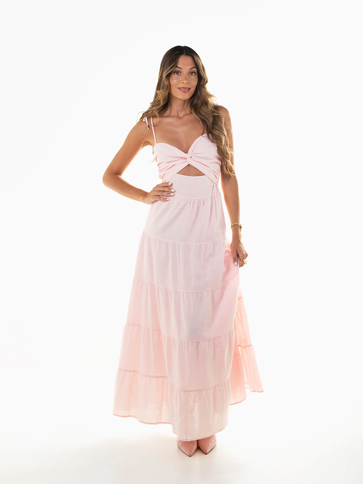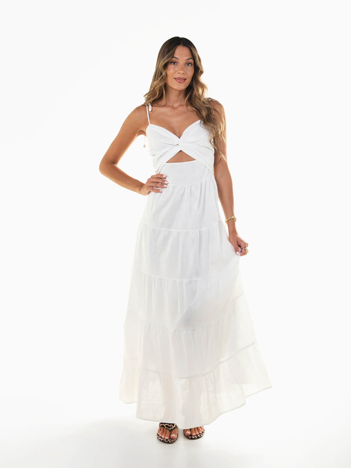 Vestido comprido com corte fluído e detalhe torcido no decote coração. Modelo com alças finas ajustáveis com laço e costas em franzido smock, que garantem maior conforto e ajuste ao corpo. Apresenta painéis que criam movimento e um interior forrado, ideal para um uso mais seguro e confortável. Uma peça leve e feminina, perfeita para destacar o bronzeado e acompanhar-te em ocasiões especiais ou em looks descontraídos de verão.
