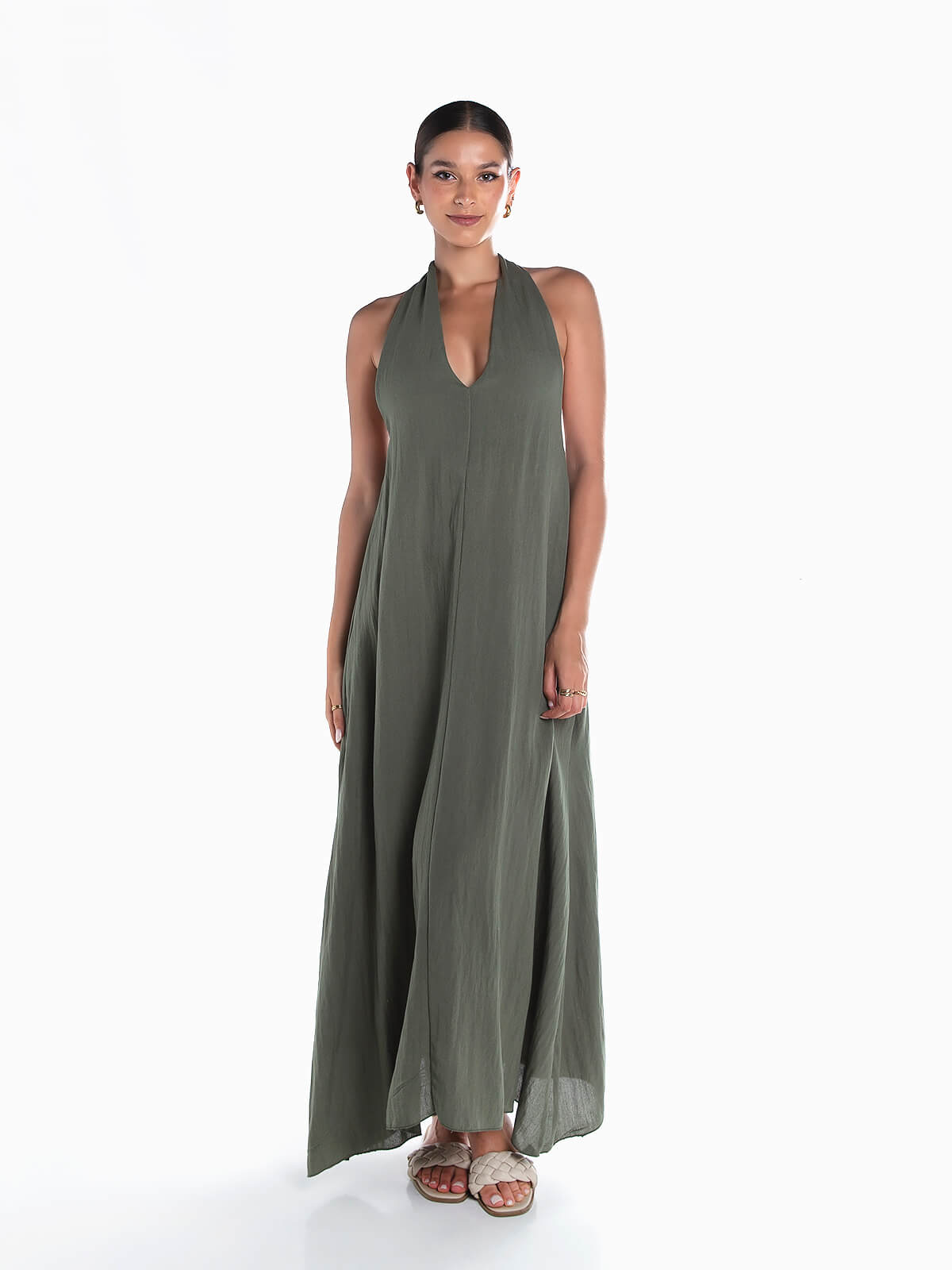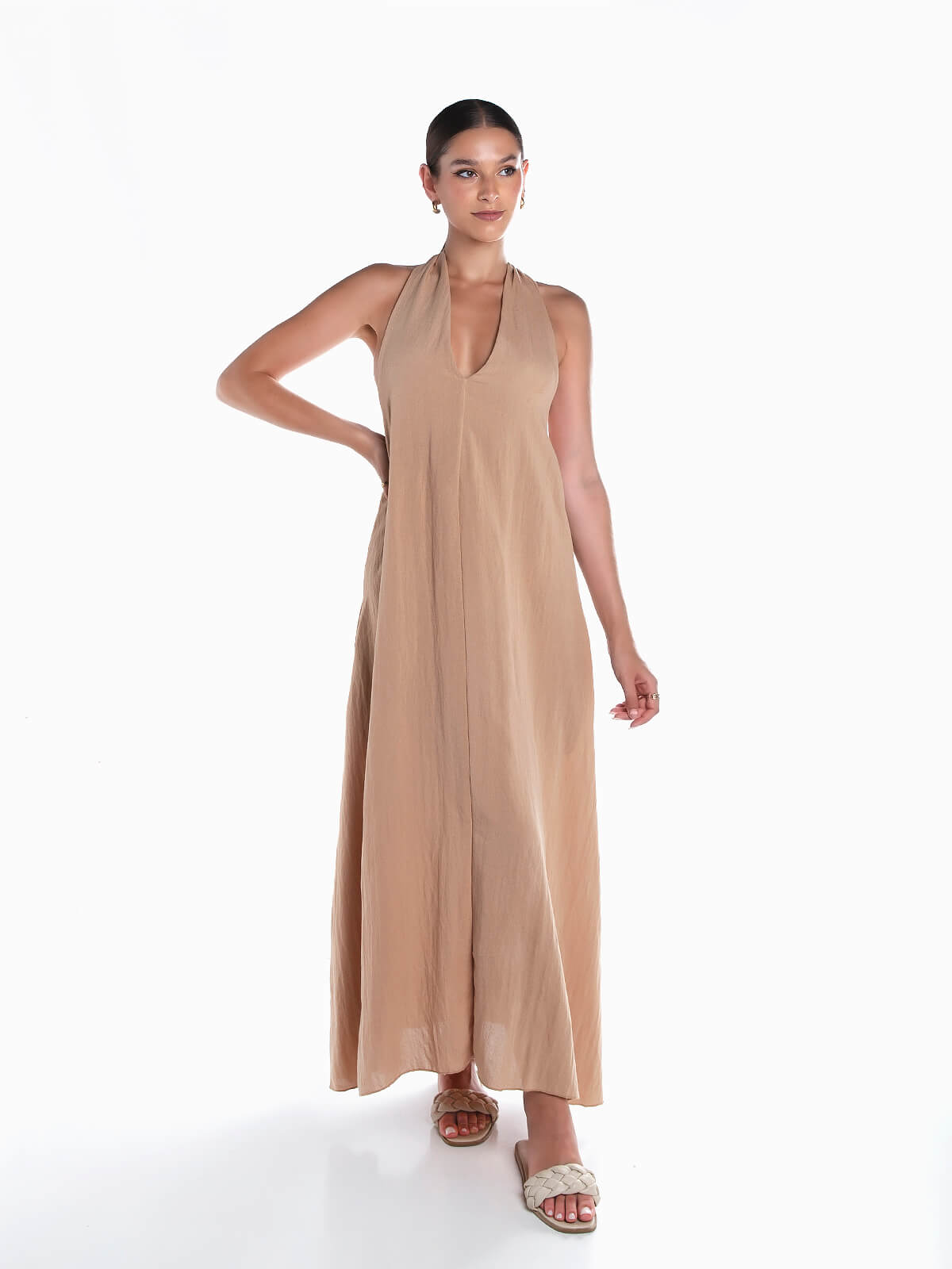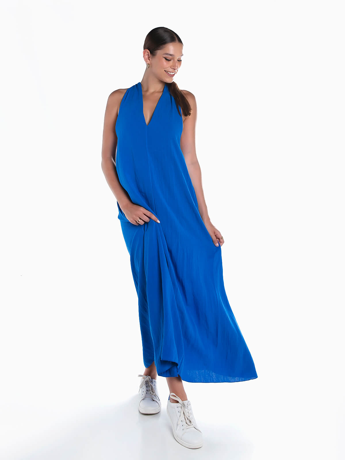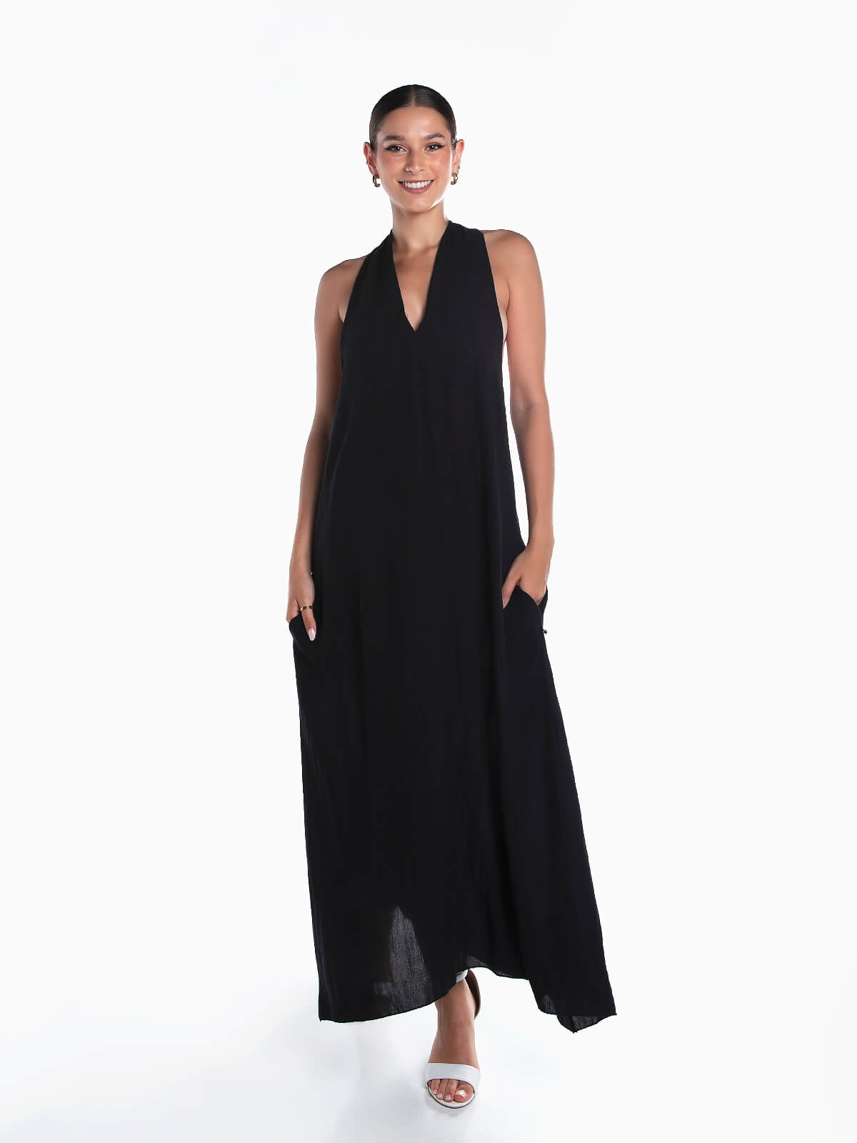 Vestido comprido com decote halter e detalhes abertos na parte posterior. Vestido em tecido leve e fluído com 2 bolsos laterais.