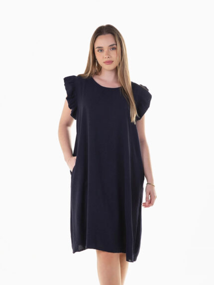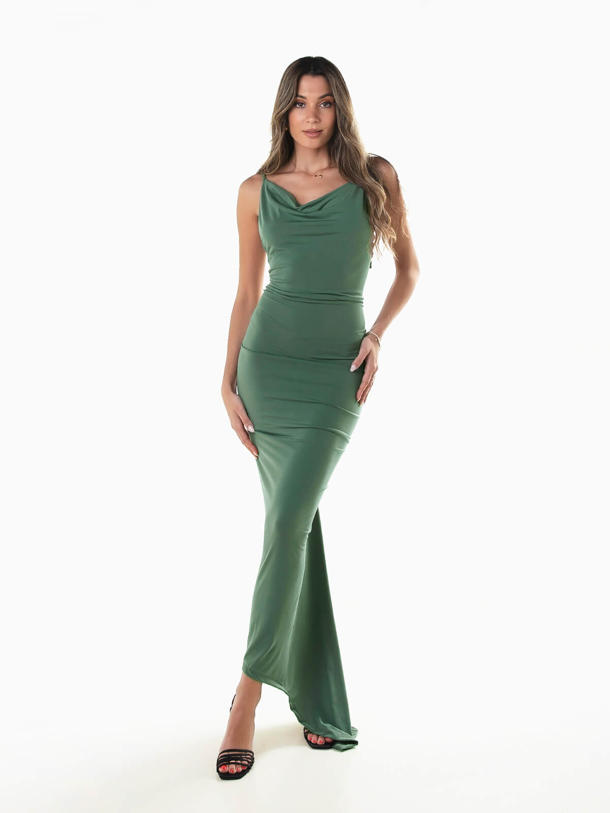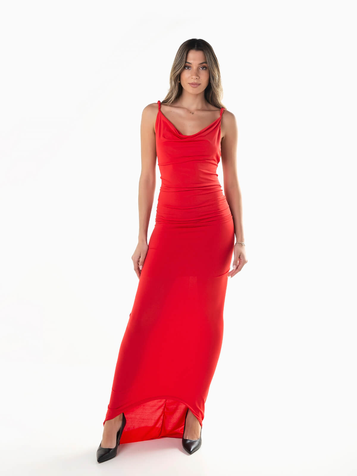 Vestido comprido com decote drapeado e pormenores franzidos nas laterais e parte posterior. Vestido justo elástico com costas descobertas e alças torcidas.