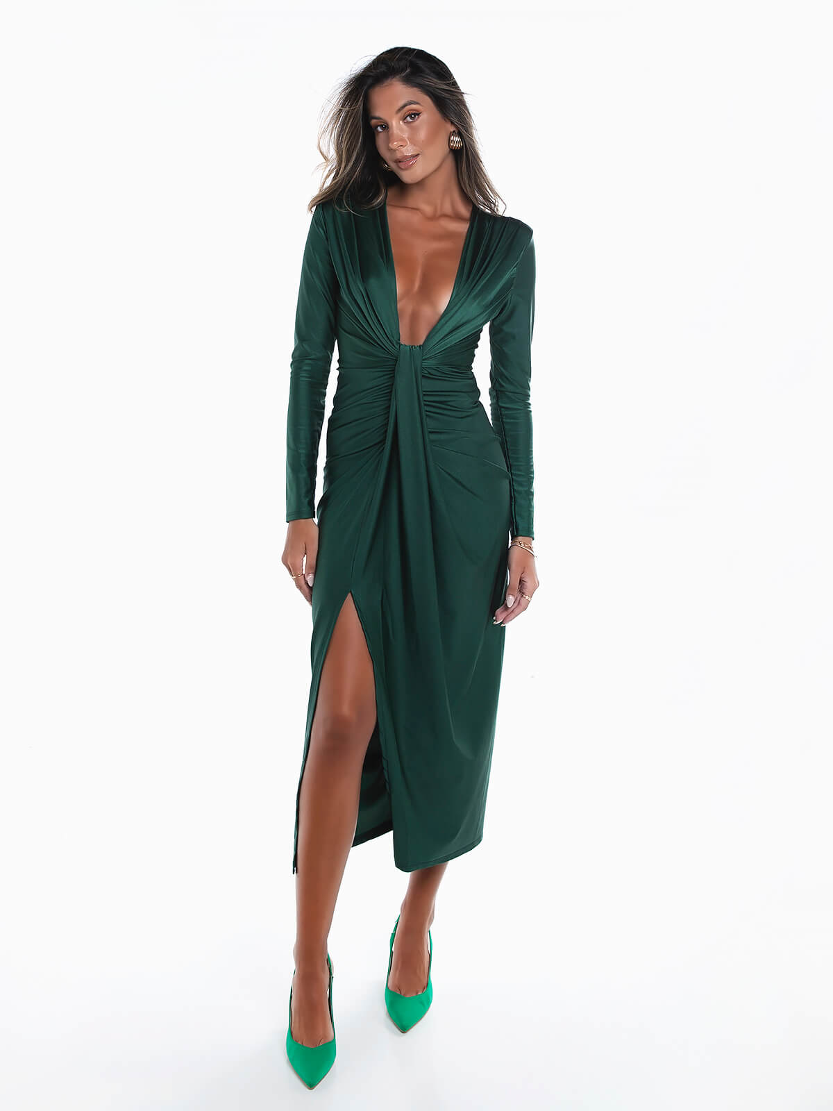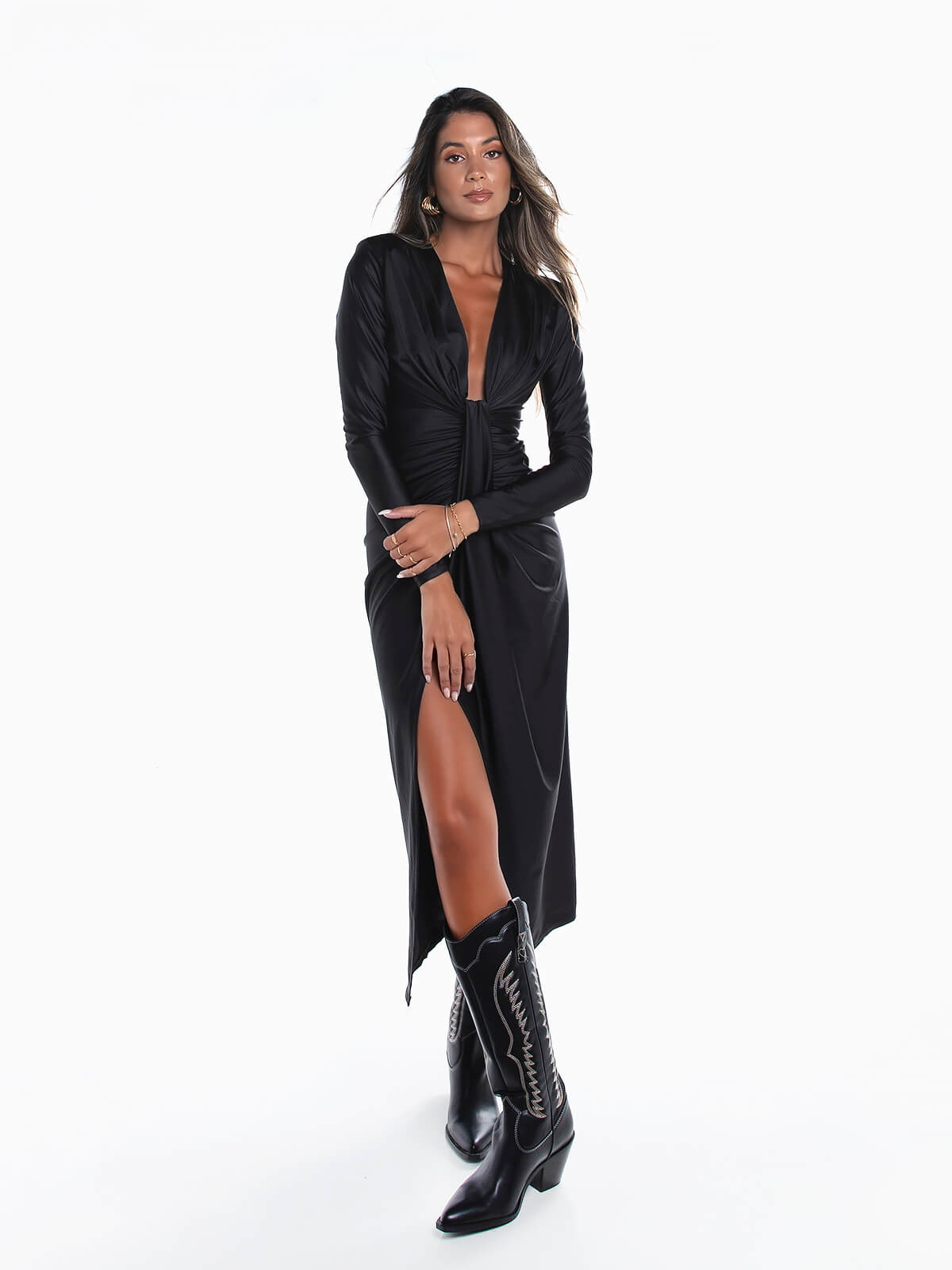 Vestido comprido com decote profundo em V e pormenor de nó. Vestido lycra manga comprida com abertura na base e franzidos.