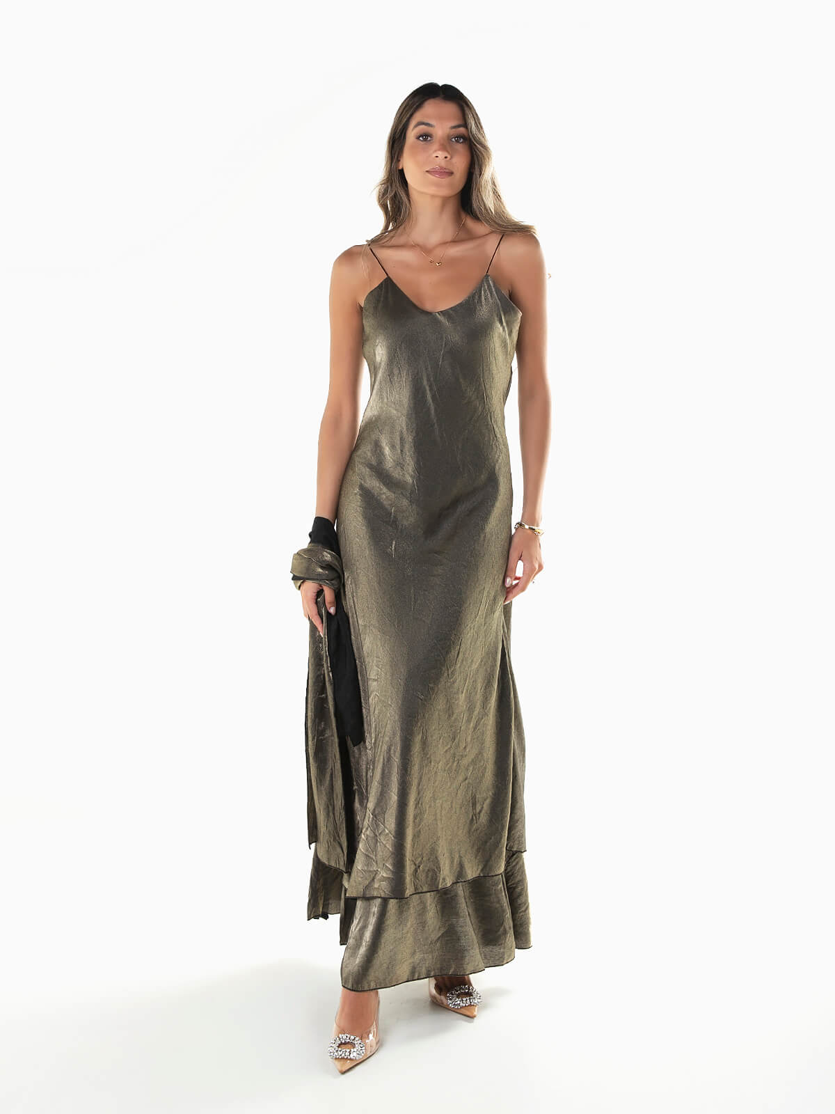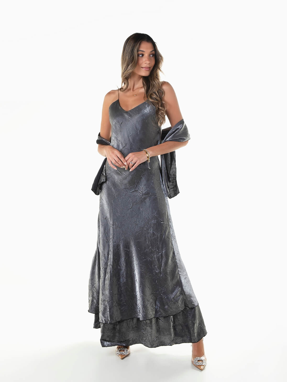 Vestido comprido acetinado com efeito enrugado e duas camadas. Vestido de alças finas com decote em bico e lenço amovível. Corte evasé.
