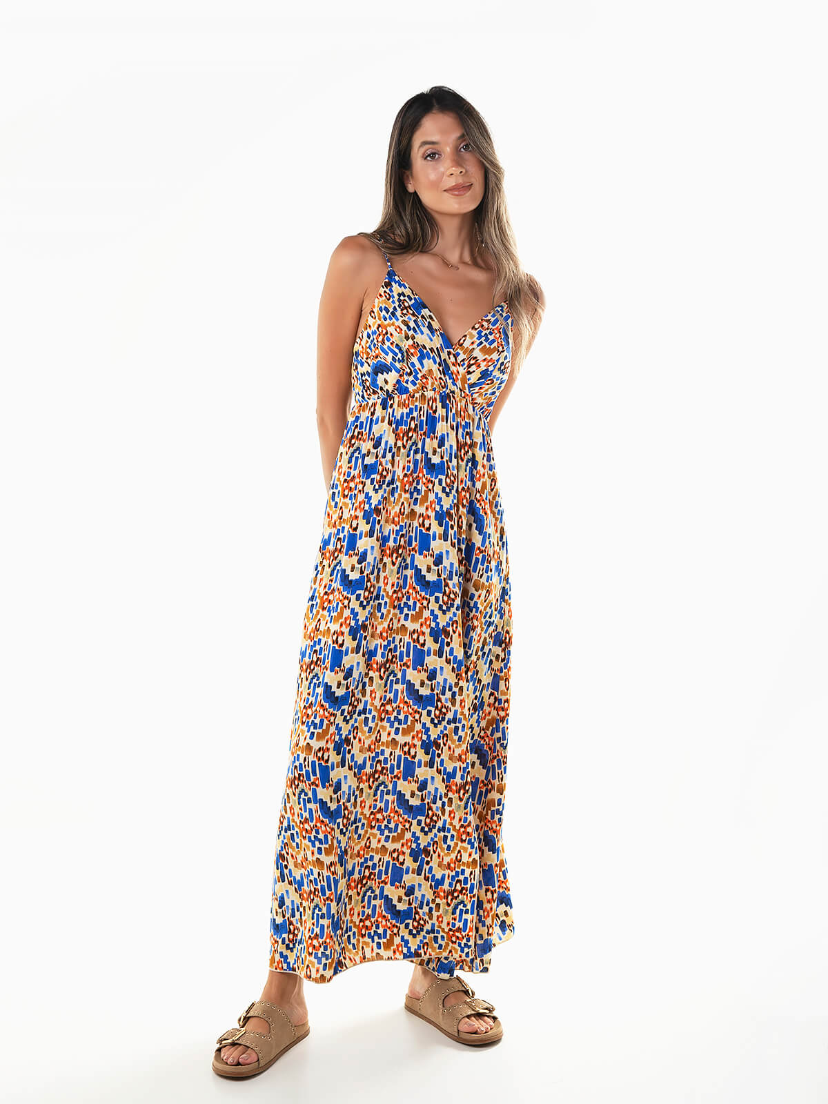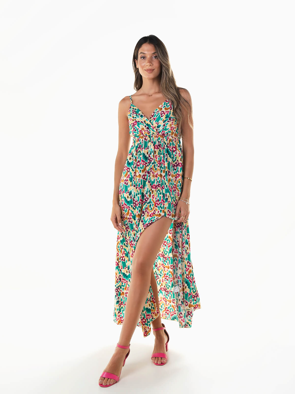 Vestido comprido com estampado abstrato colorido. Vestido alças reguláveis com decote cruzado e elástico abaixo do peito. Abertura lateral.