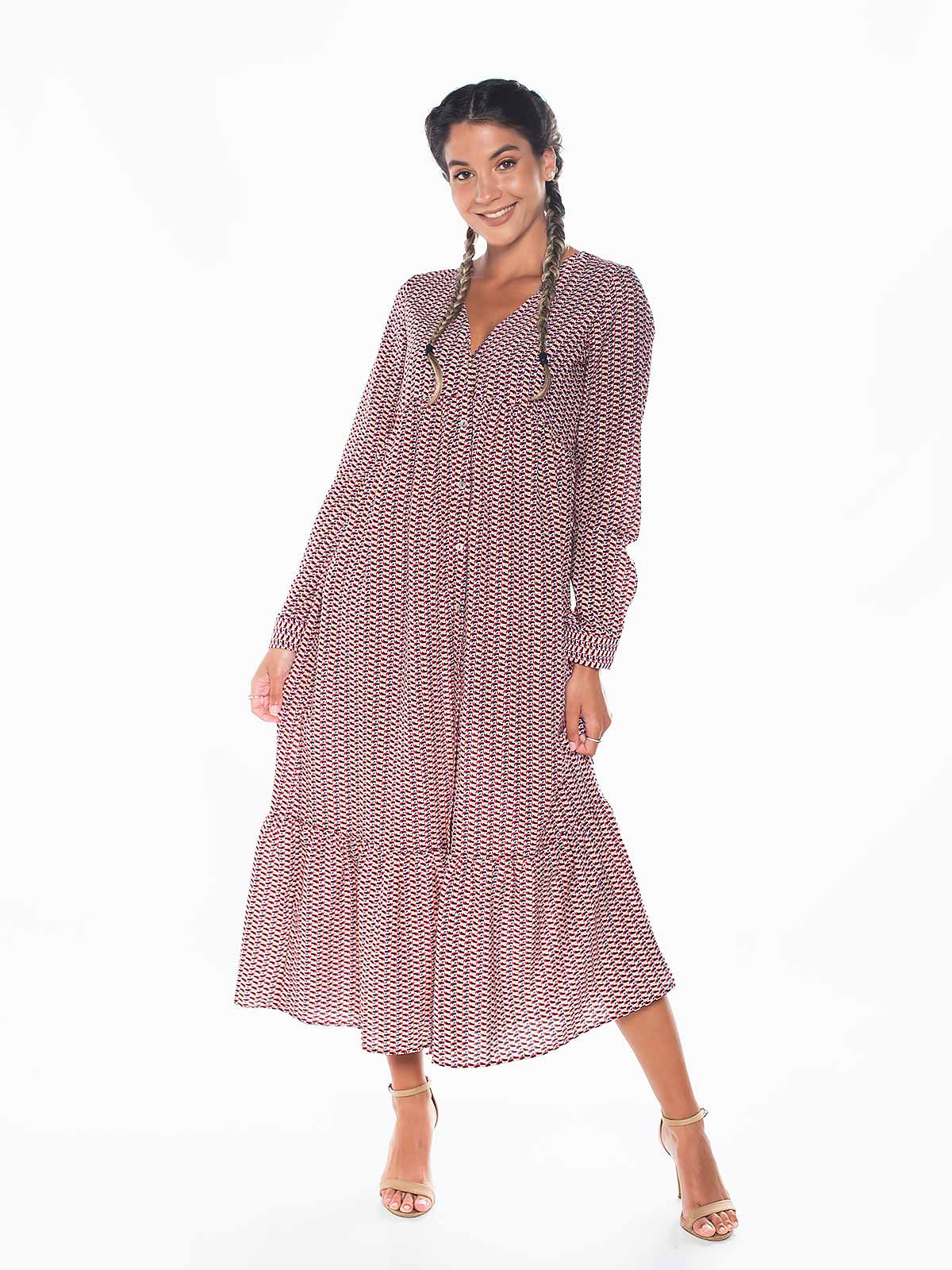 Vestido comprido estampado com botões na frente. Vestido de manga comprida abotoada com folho em baixo. Decote em V.