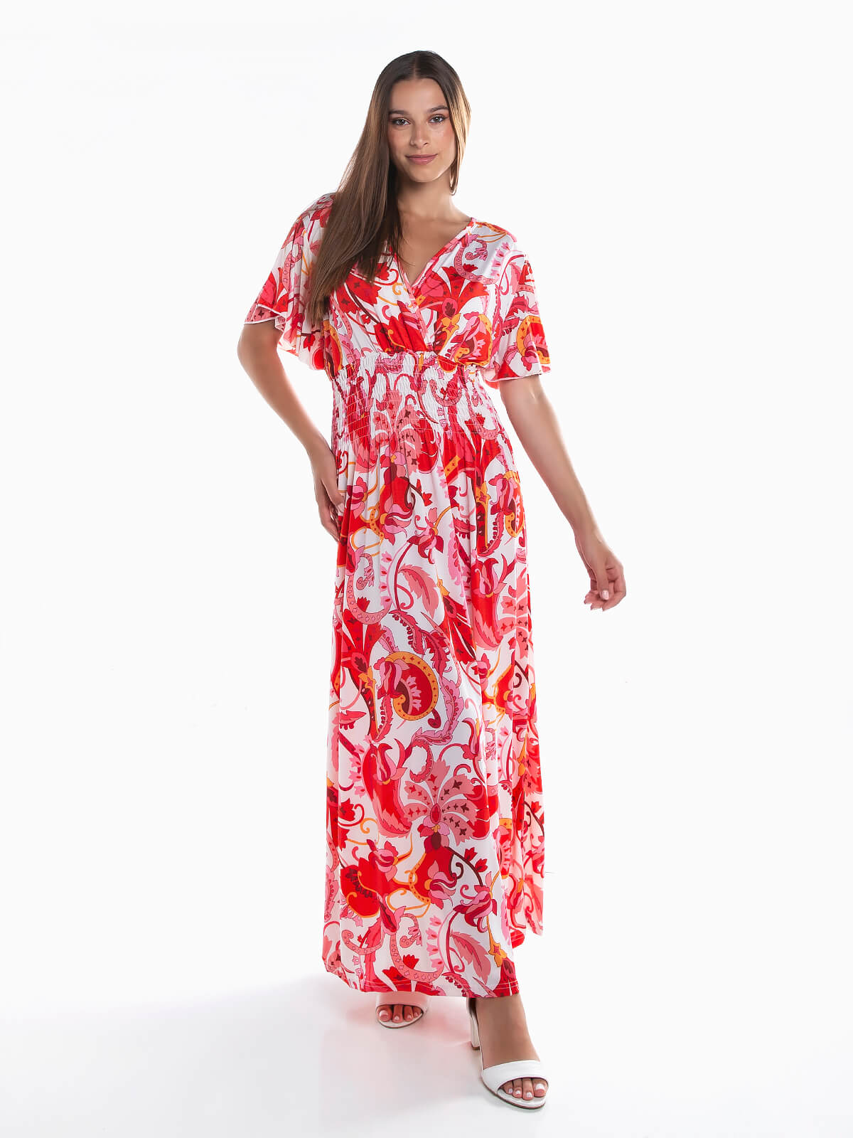 Vestido comprido fluído com franzido smock na cintura e estampado abstrato. Vestido em tecido leve e fresco com encaixe folho na cava e decote cruzado.
