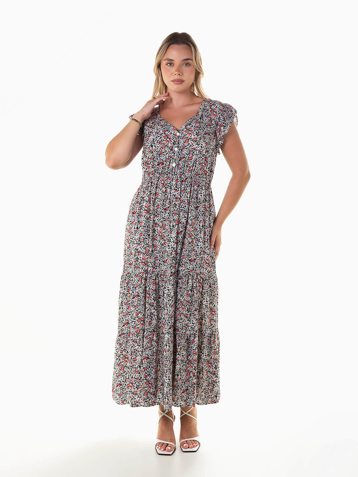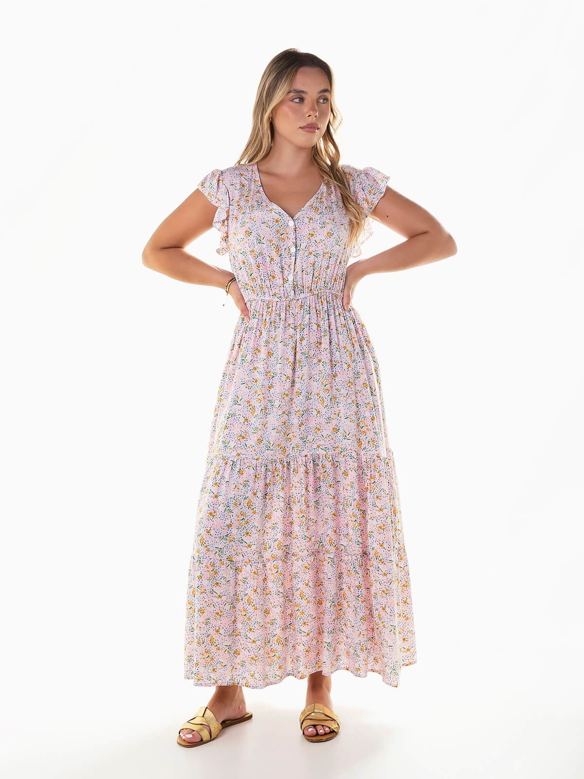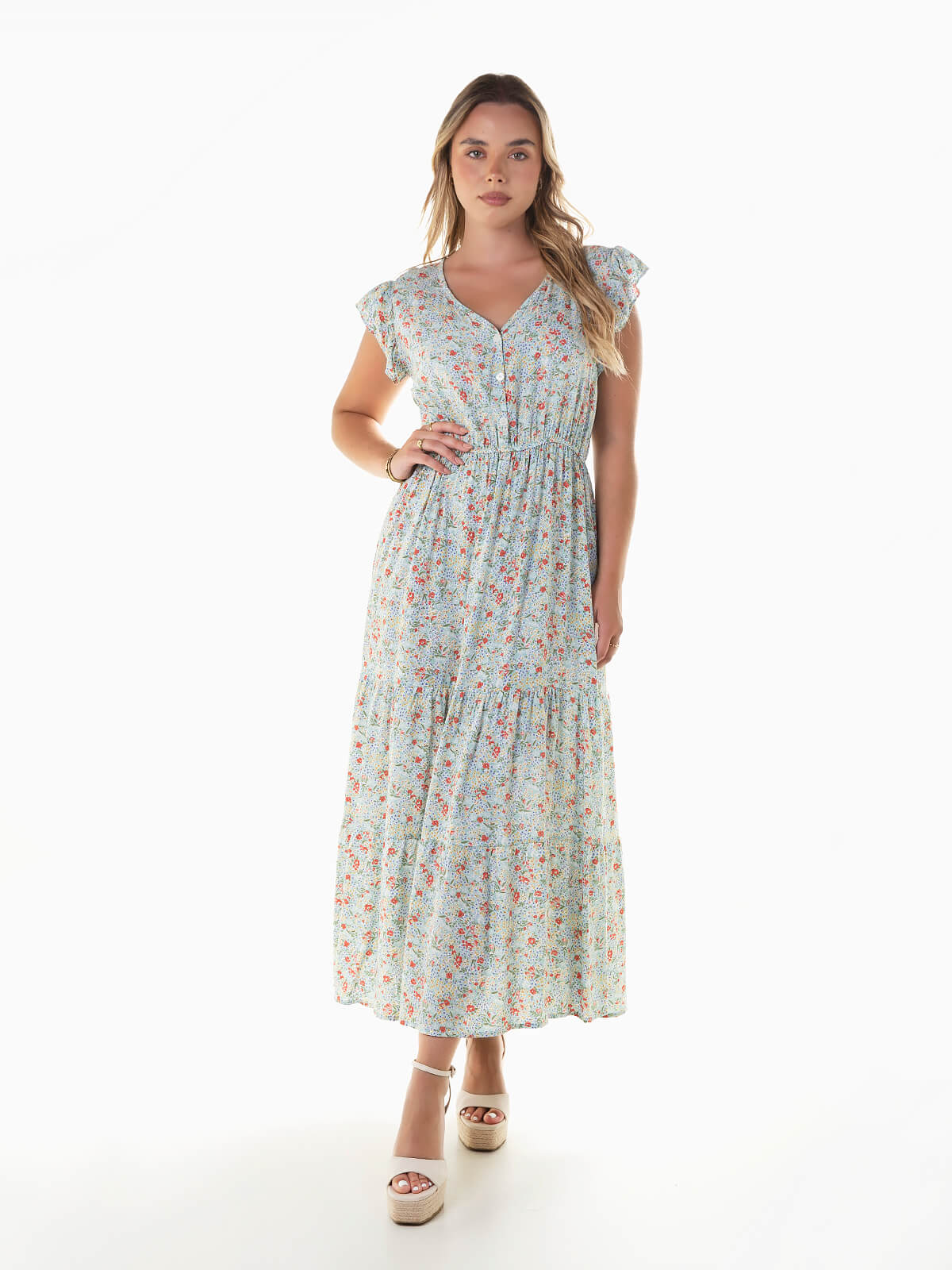 Vestido comprido estampado floral com painéis e cintura elástica. Vestido leve e fluído de manga cava com folho. Decote em V e botões decorativos.
