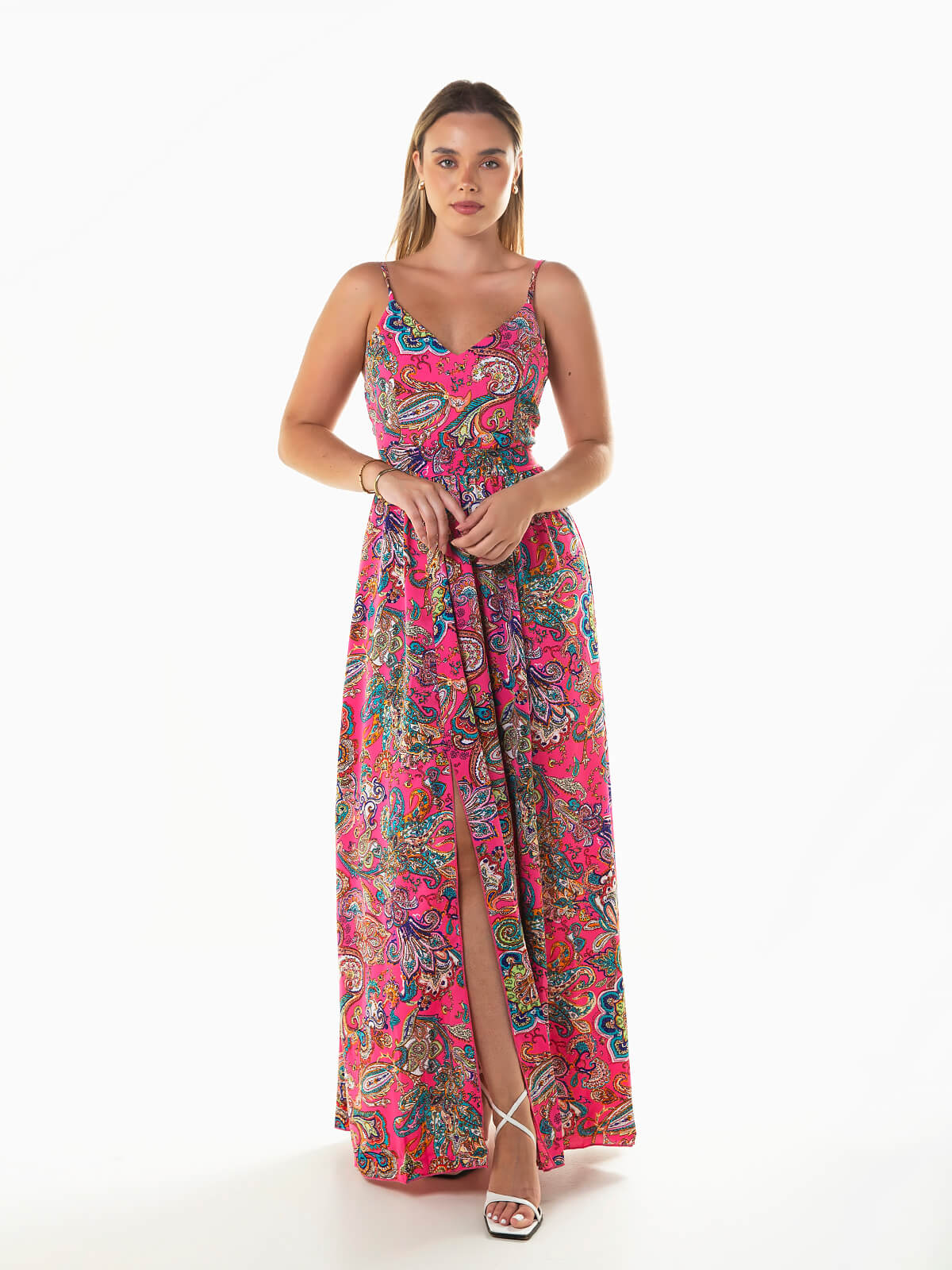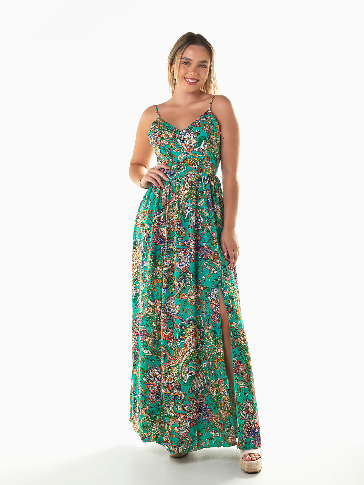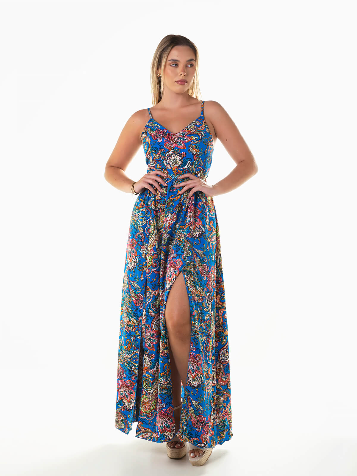 Vestido comprido estampado étnico com abertura lateral. Vestido fluído com alças reguláveis e aperto posterior de laço. Decote em V.