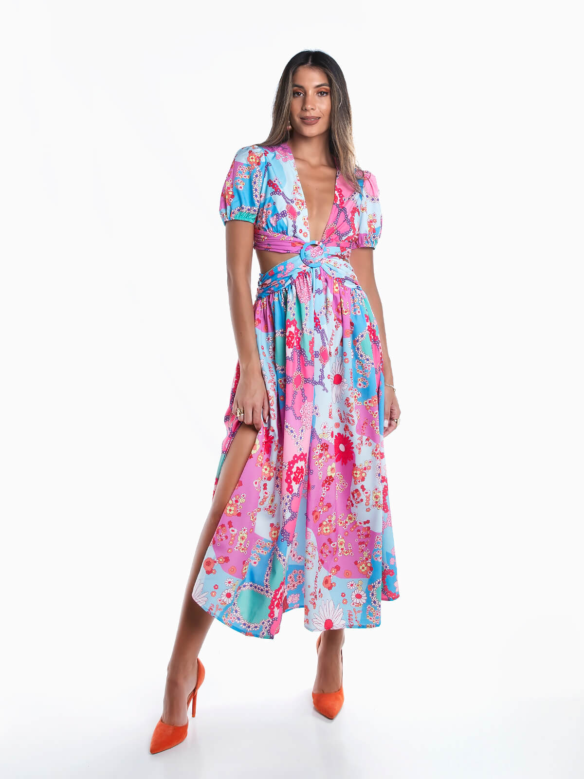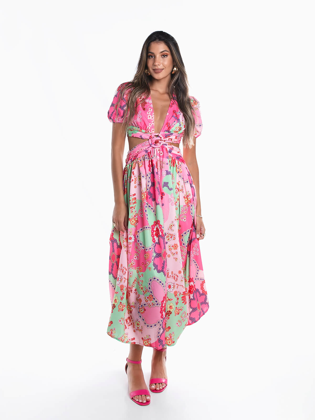 Vestido comprido floral com cut out. Vestido fluído com manga curta abalonada e decote em bico. Aperto posterior de fechos éclair.