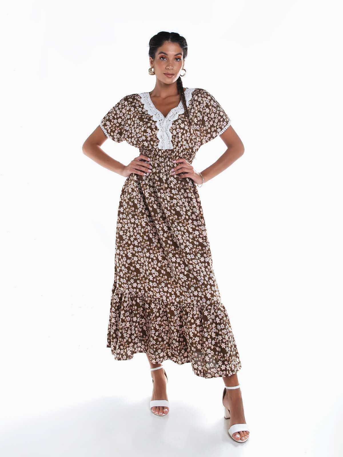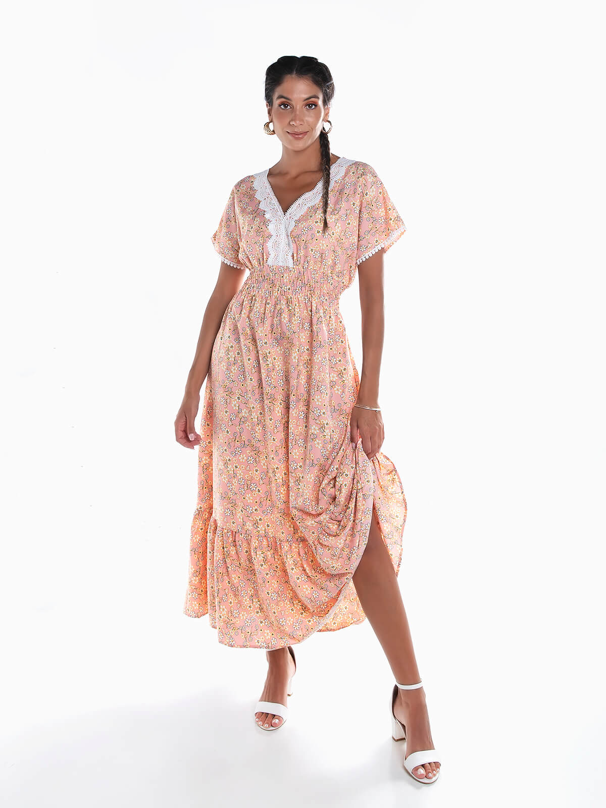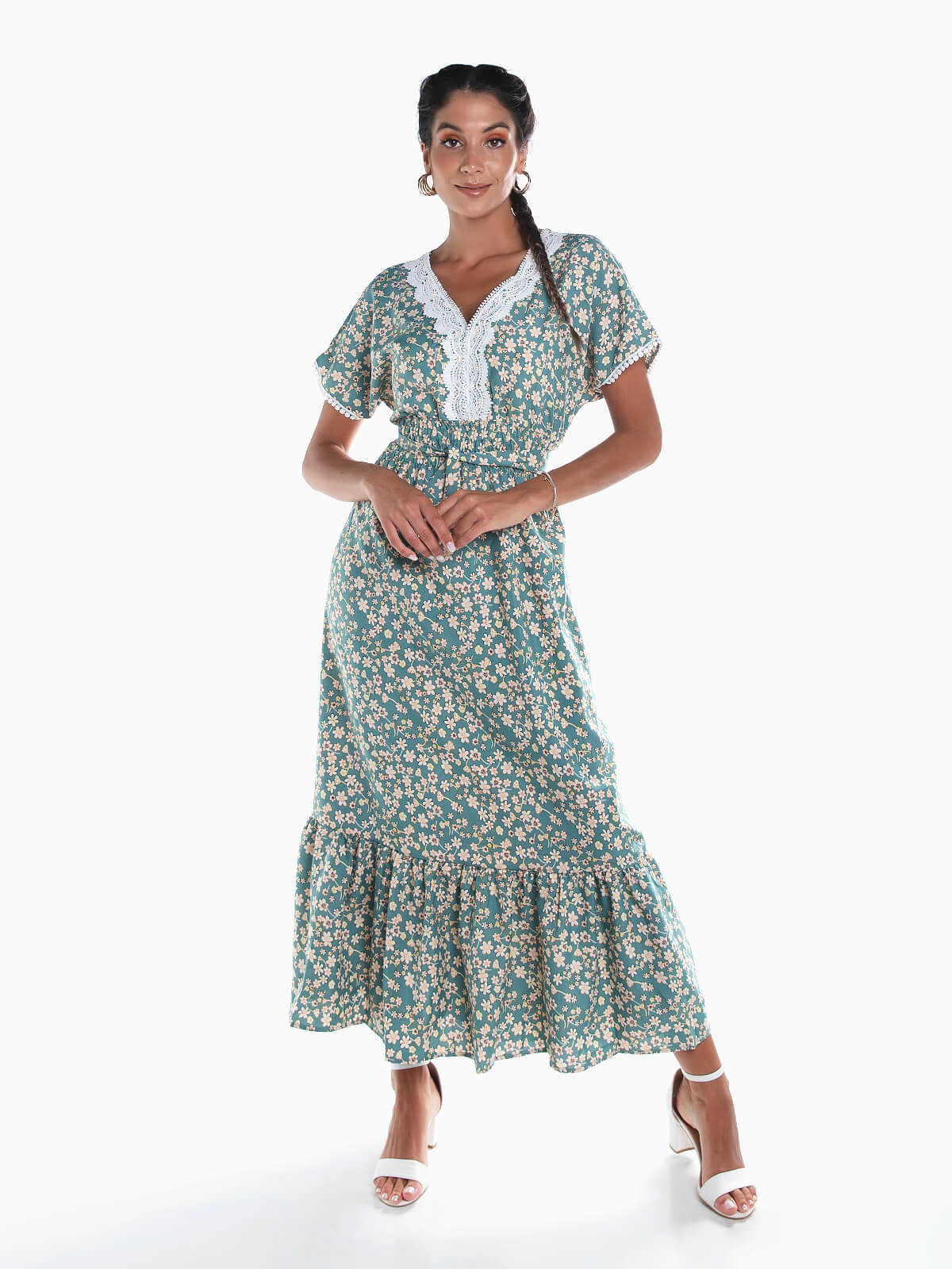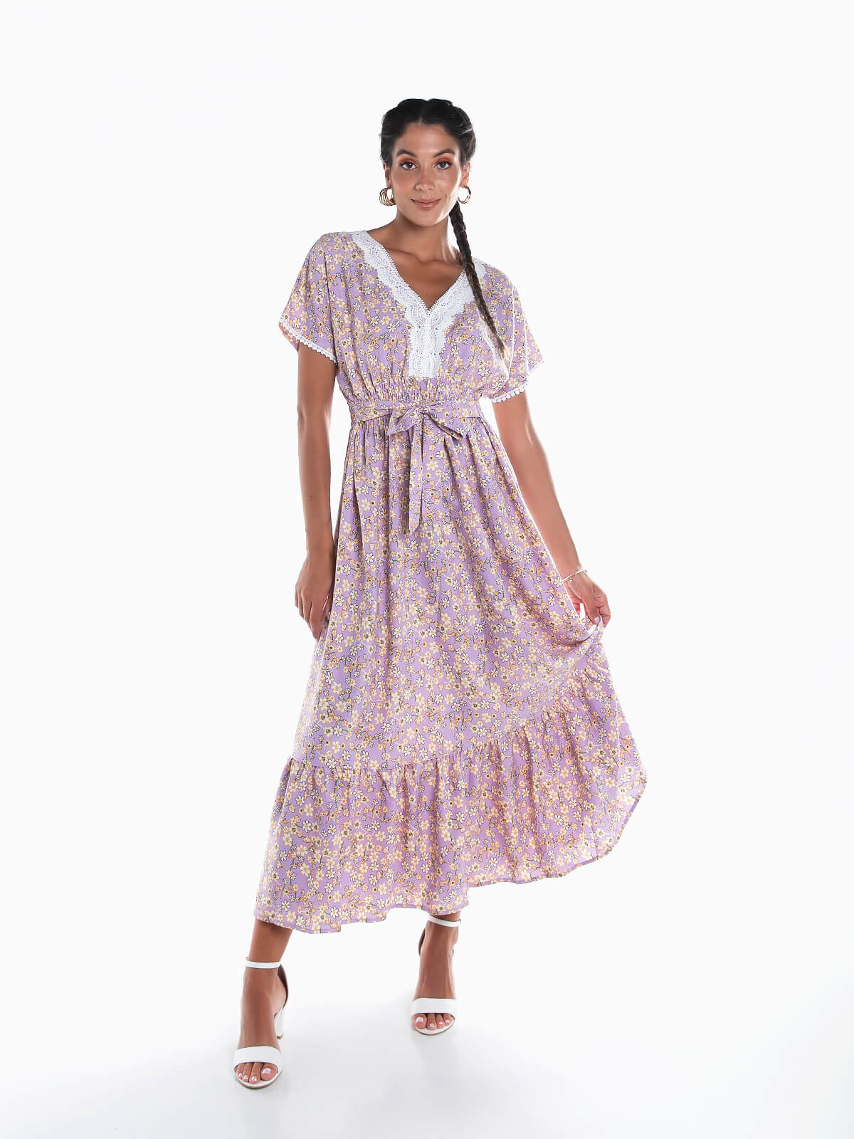 Vestido comprido estampado floral combinado com crochet no decote em V e mangas. Vestido fluído manga curta com elástico na cintura e tecido para laço. Encaixe de folho na base.