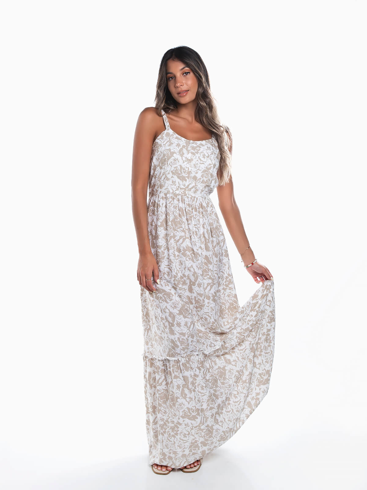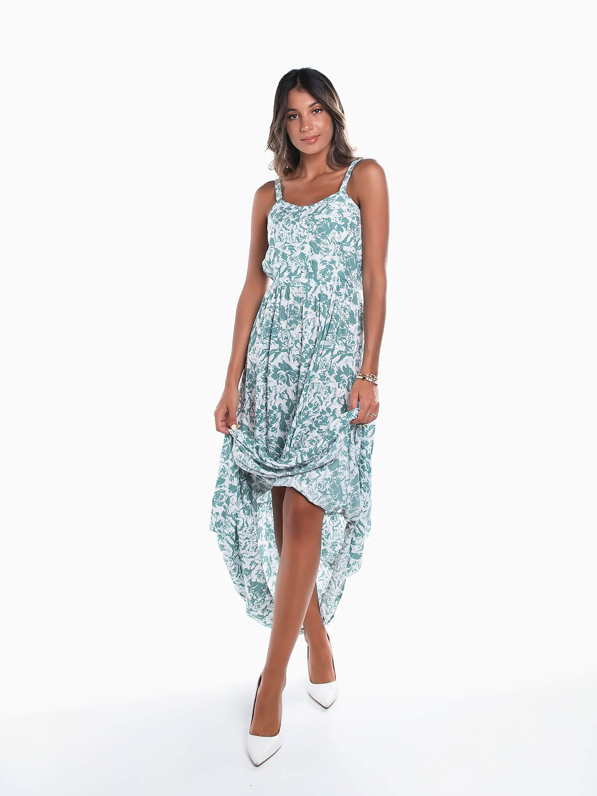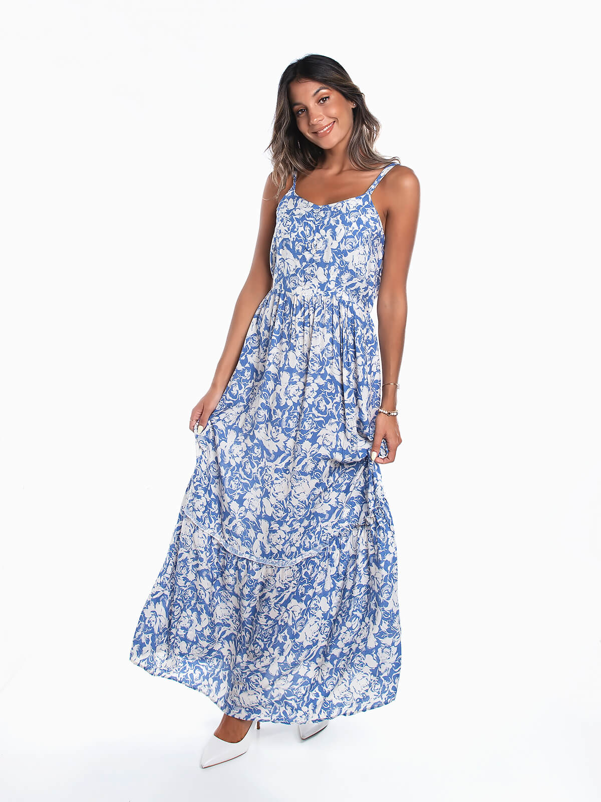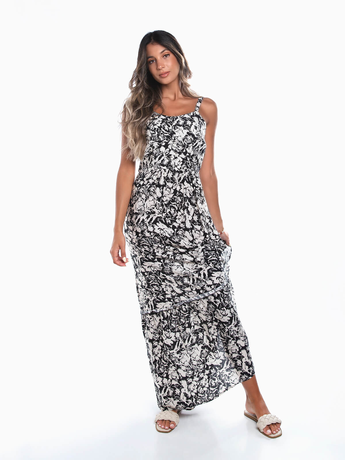 Vestido comprido estampado floral com encaixe de folho na base. Vestido fluído de alças ajustáveis e cintura elástica. Decote redondo. Botões decorativos.