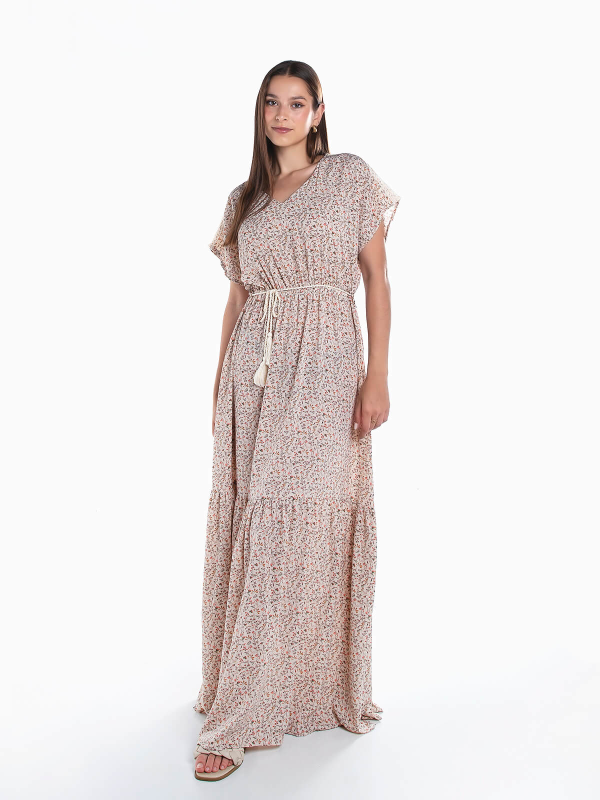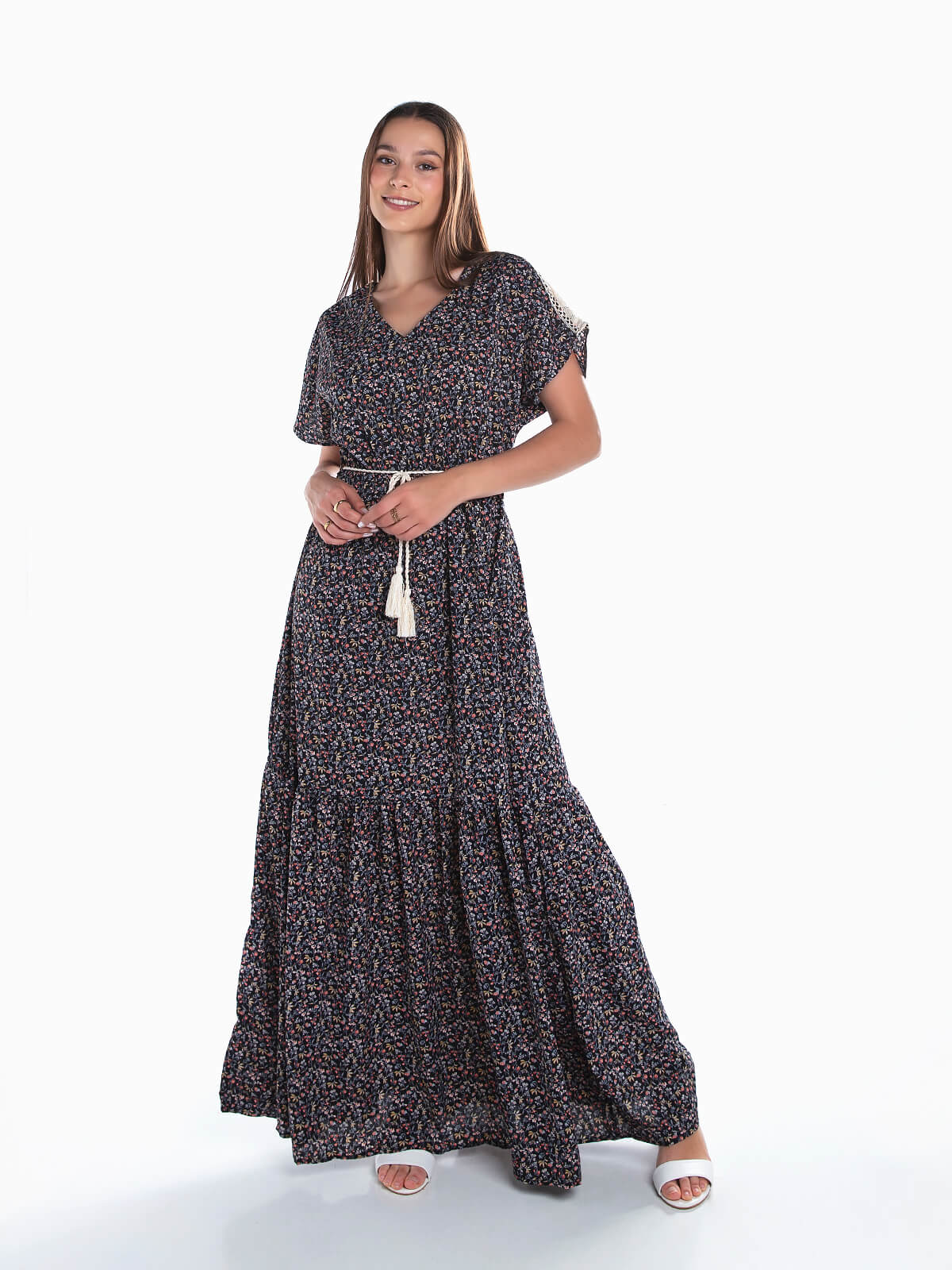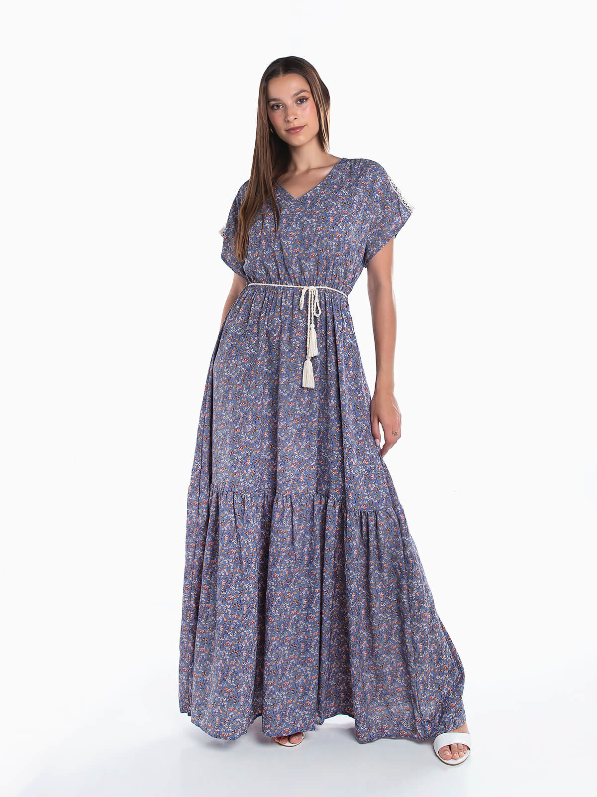 Vestido comprido estampado floral de manga curta para senhora. Vestido fluído com cordão na cintura para ajustar. Encaixe de folho na base.
