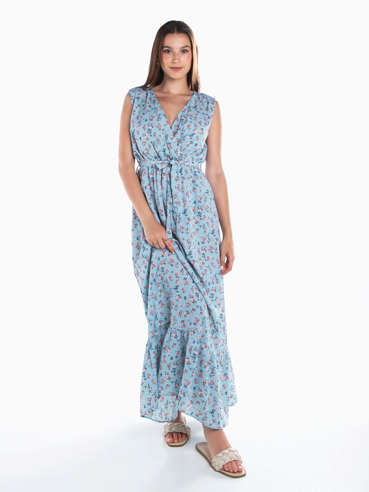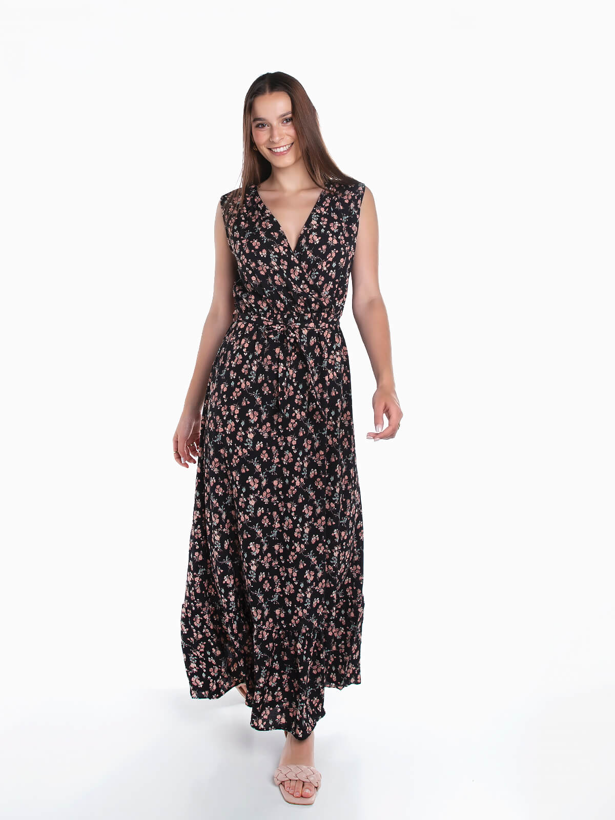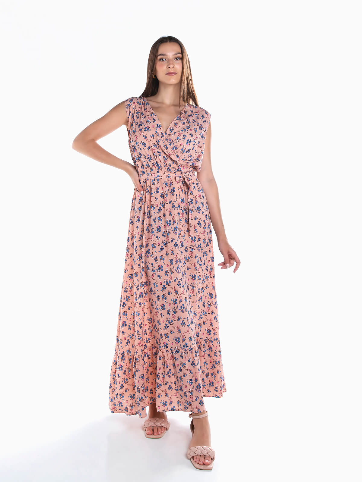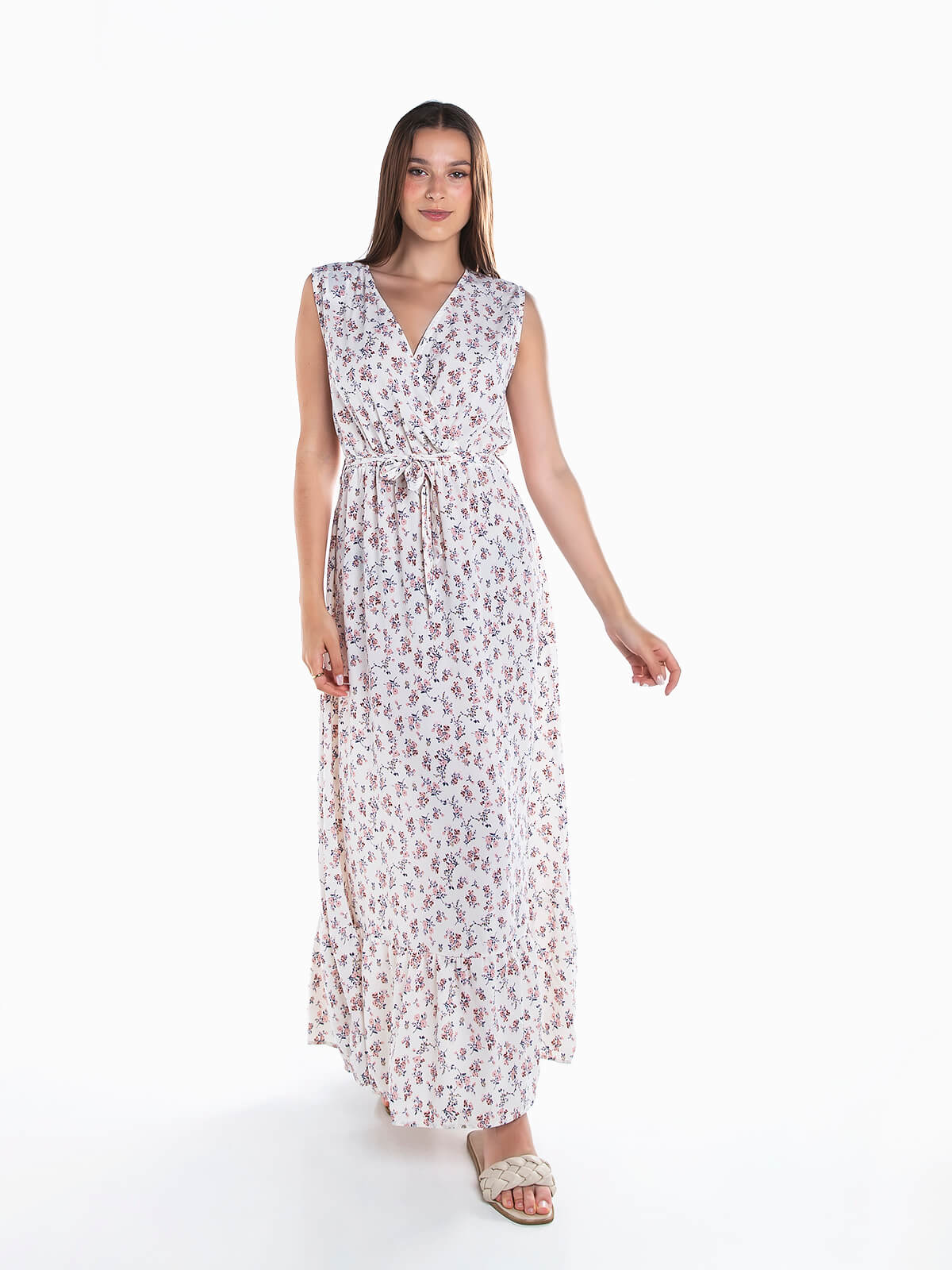 Vestido comprido estampado floral sem mangas para senhora. Vestido em tecido fluído com decote cruzado e cinto para ajustar. Encaixe de folho na base.