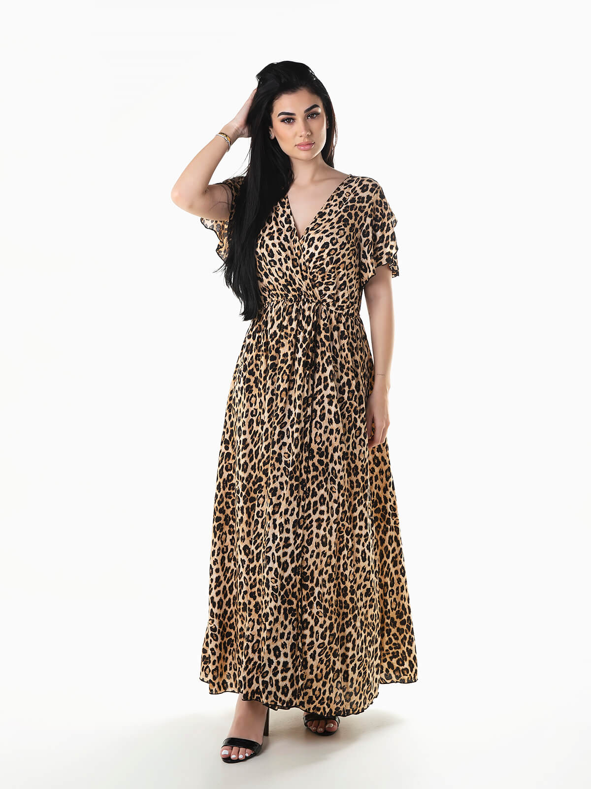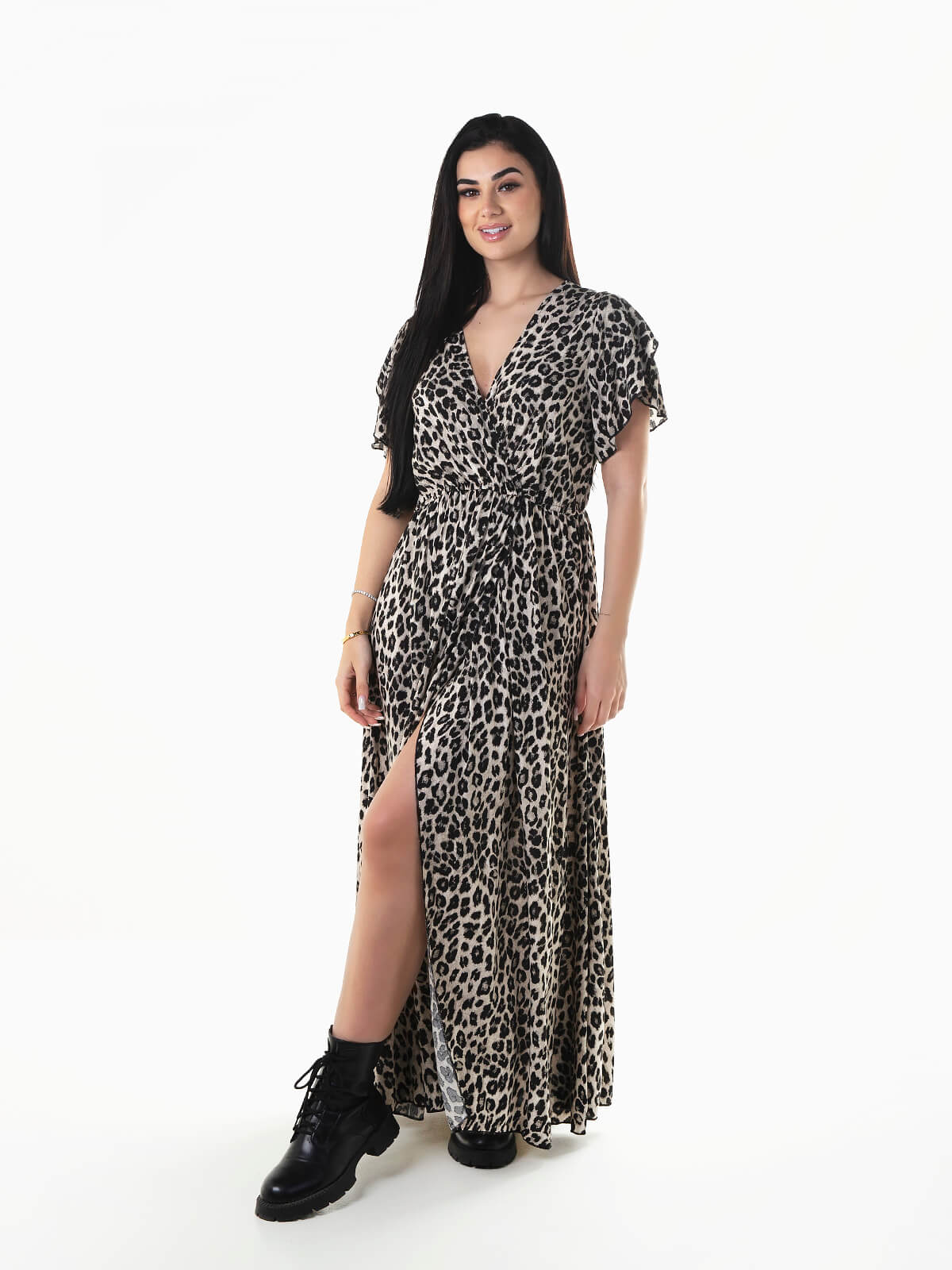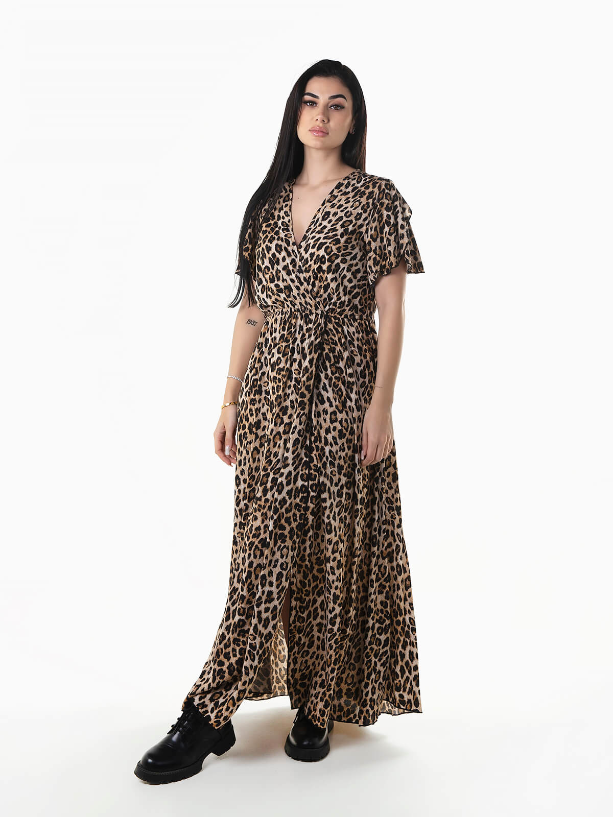 Vestido comprido fluído com animal print e decote cruzado. Vestido de manga curta com abertura na base.