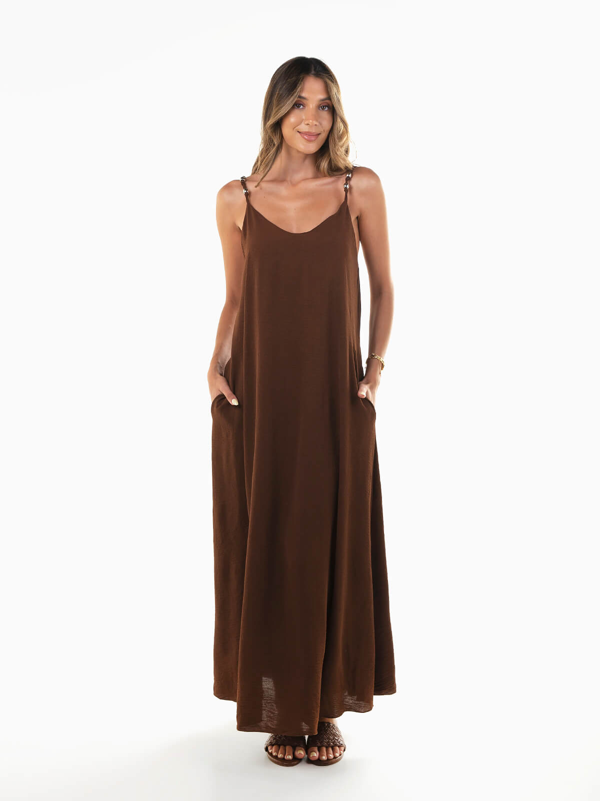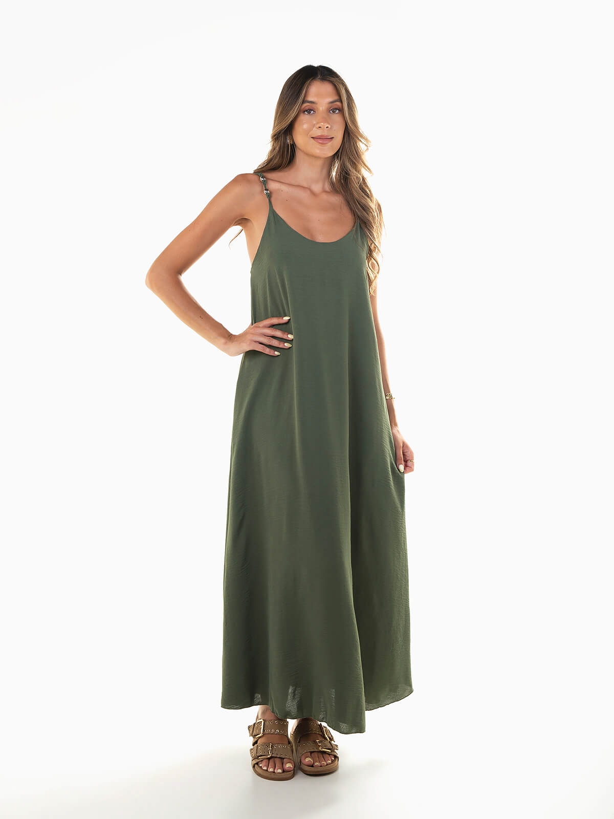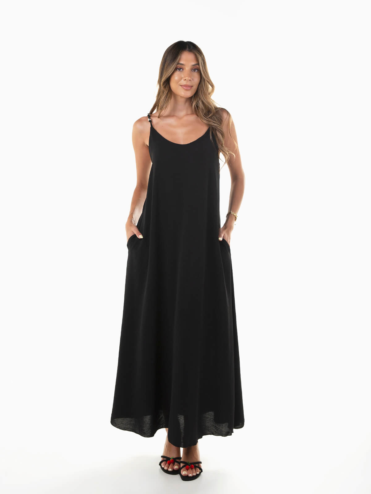 Vestido comprido fluído com 2 bolsos laterais para mulher. Vestido leve com alças finas e aplicações prateadas. Decote em V. Disponível em várias cores, adapta-se a diferentes estilos e ocasiões — use com sandálias rasas para um look descontraído ou com mules de salto para um toque mais elegante.