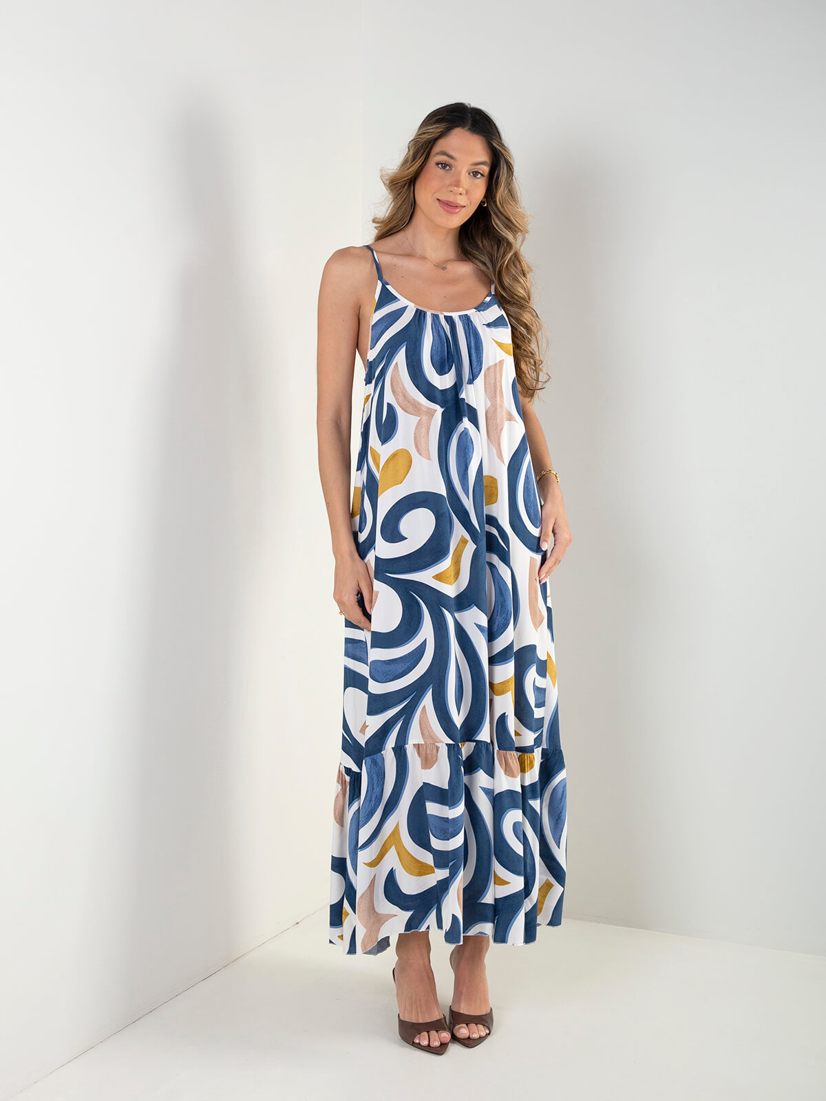 Vestido comprido fluído com estampado em contraste. Modelo de alças finas com decote redondo e corte solto. Detalhe de folho na base que acrescenta movimento à peça. Leve e confortável, ideal para dias quentes e looks descontraídos.