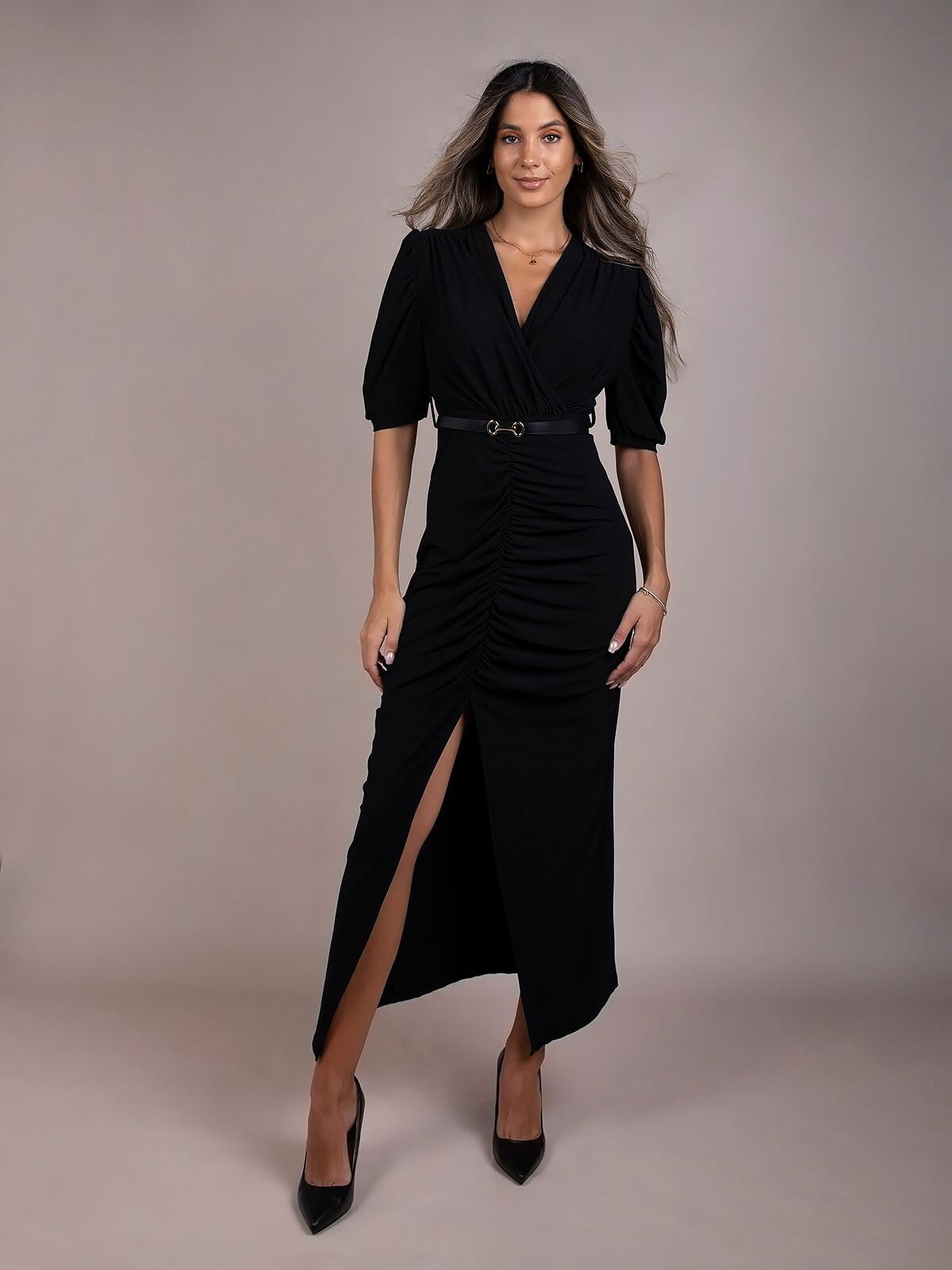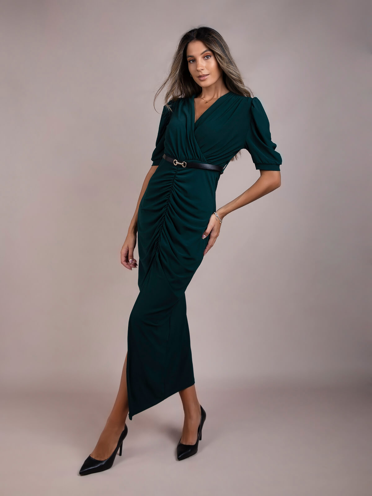 Vestido comprido com franzido à frente e abertura na base. Vestido justo com manga abalonada e decote cruzado. Cinto removível em pele sintética.
