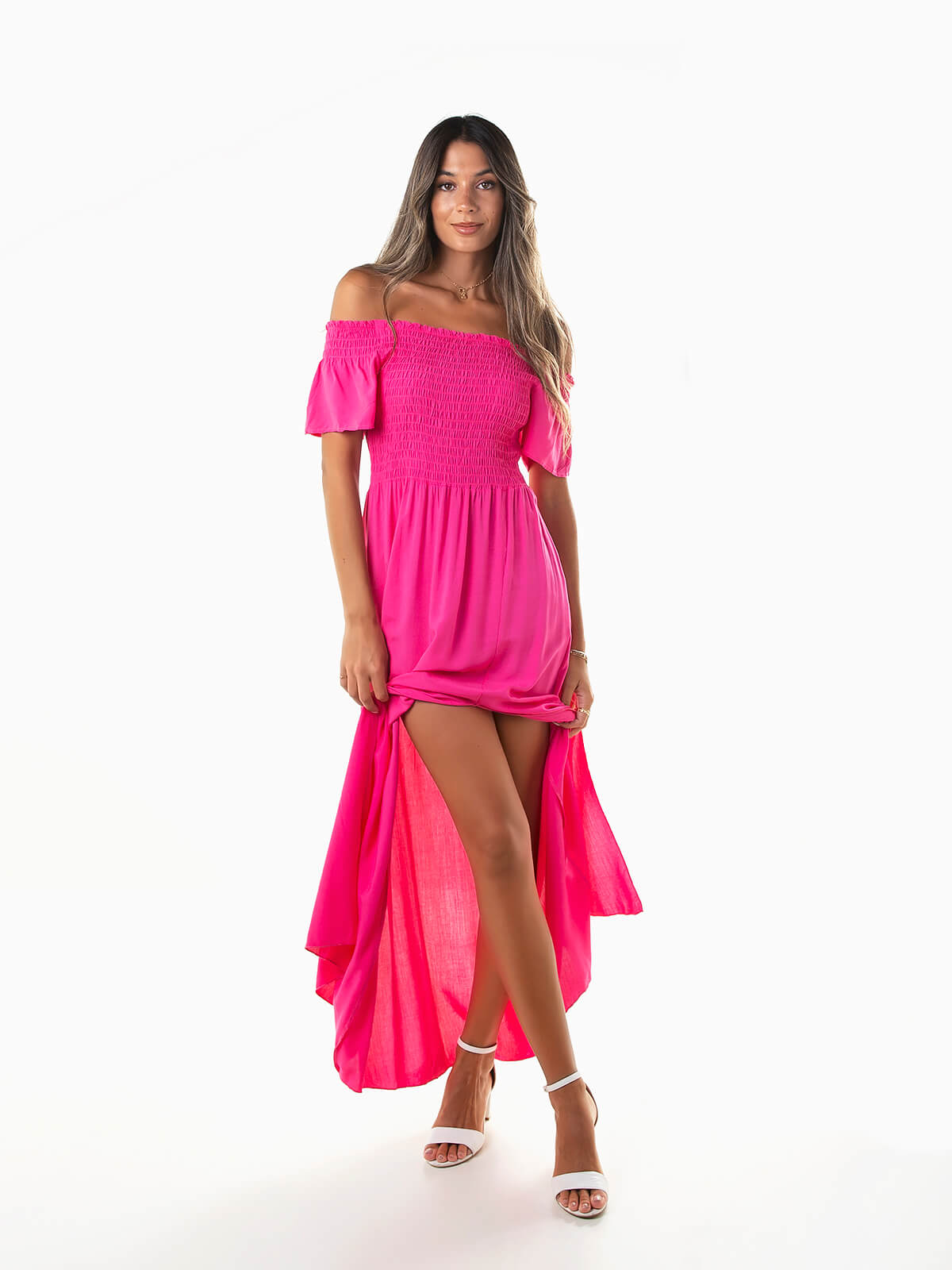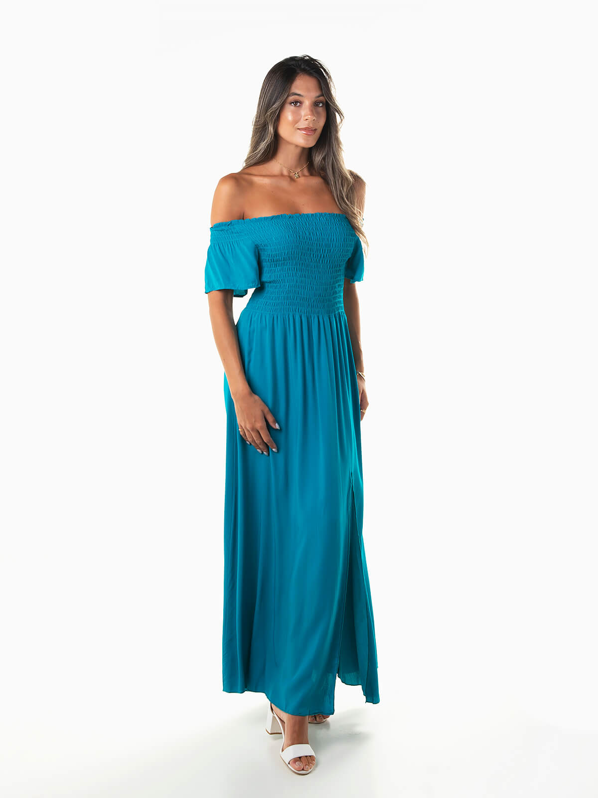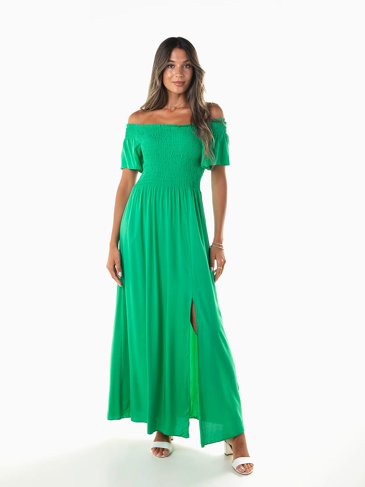 Vestido comprido para senhora com peito franzido smock e ombros descobertos. Vestido fluído de manga curta 100% algodão para maior conforto. Altura da Modelo: 175 cm | Tamanho: S/M