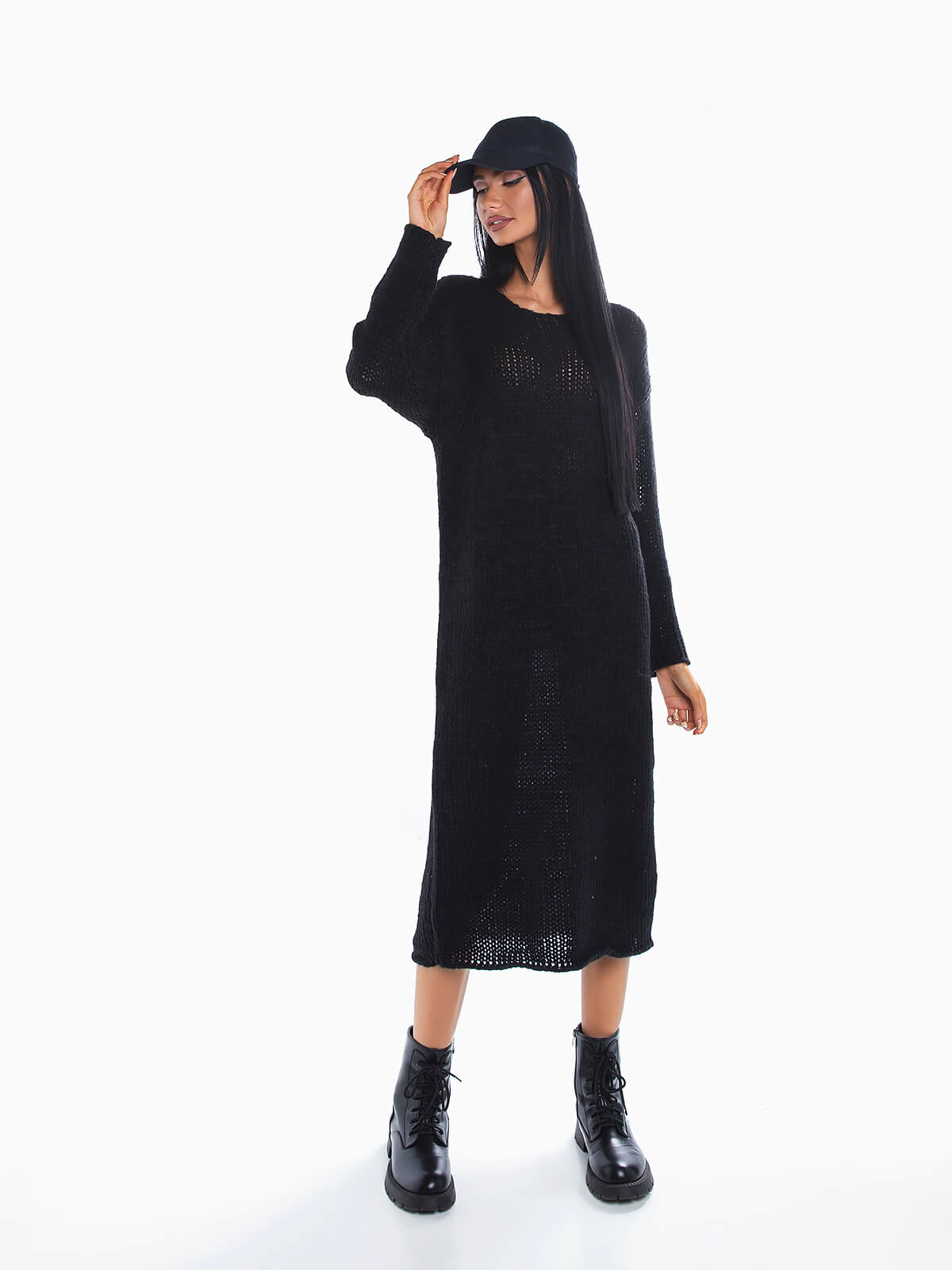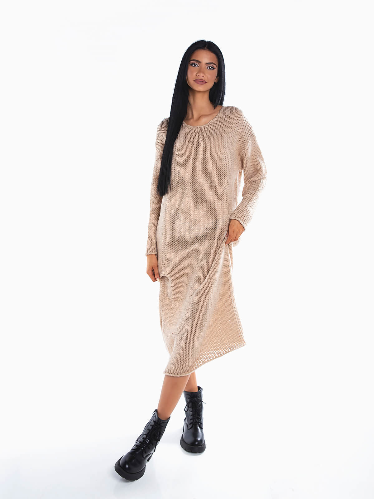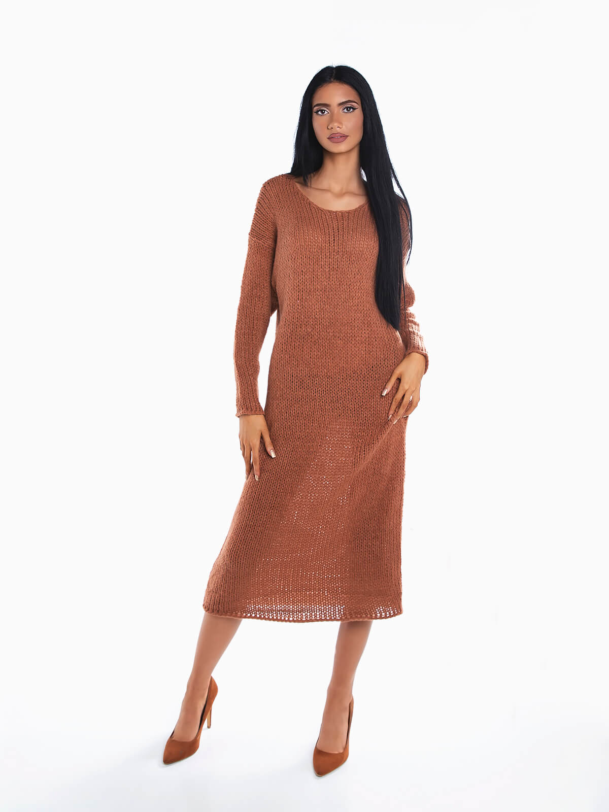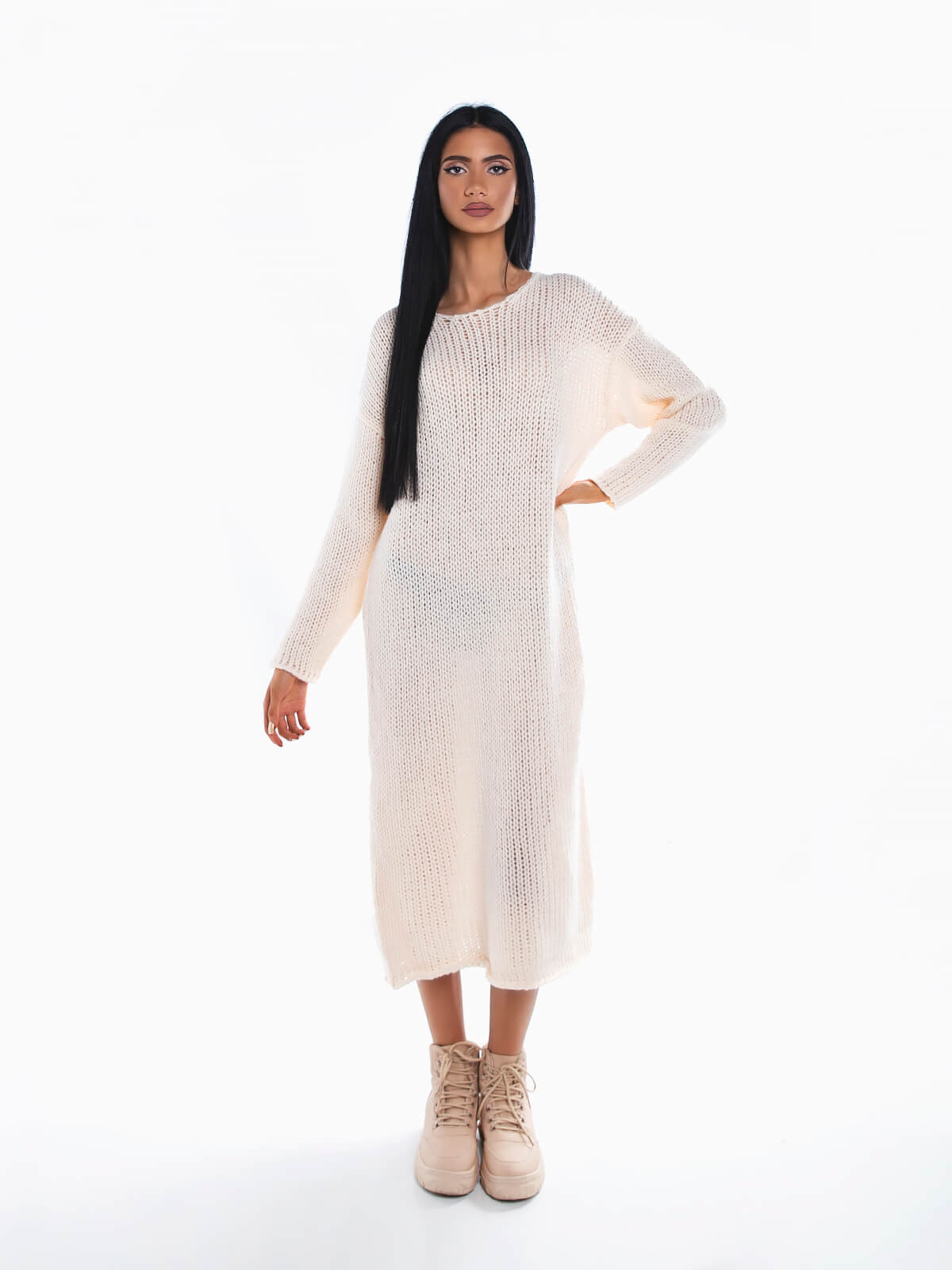 Vestido comprido de malha grossa para senhora. Vestido manga comprida de ponto aberto com decote redondo. Ombros descaídos.