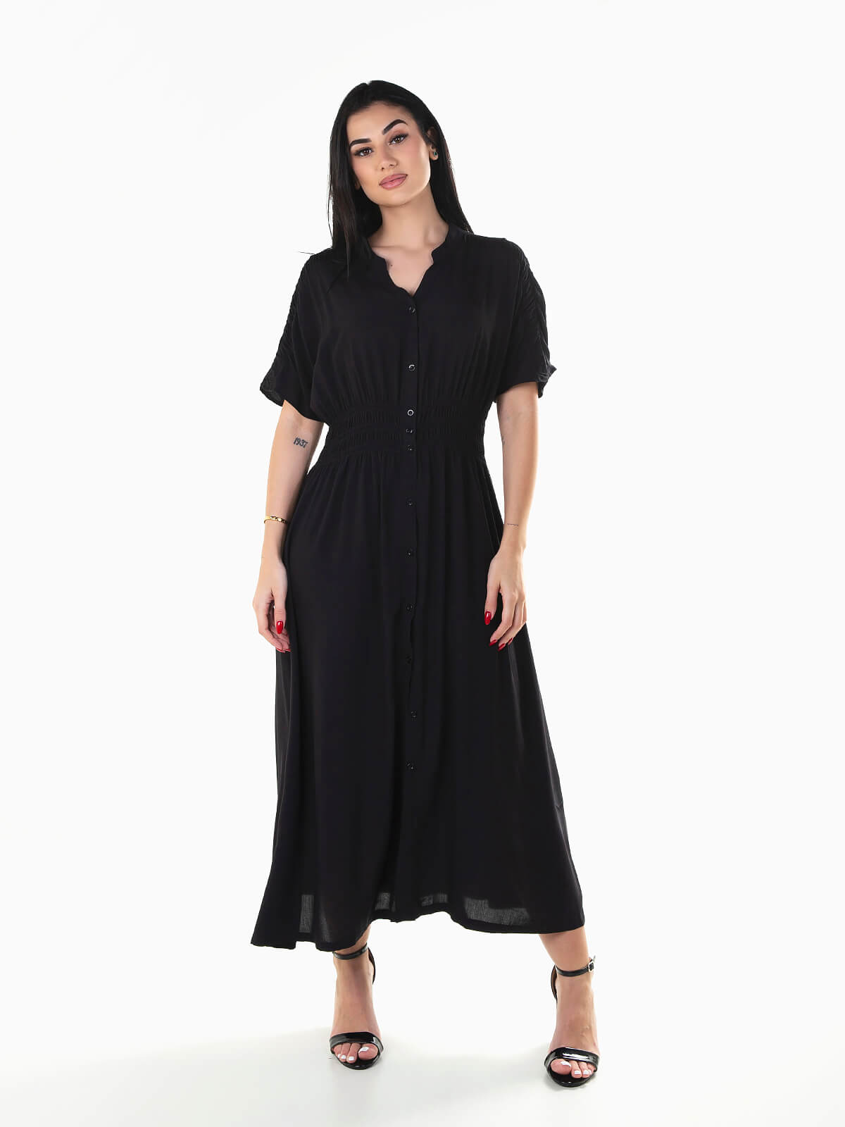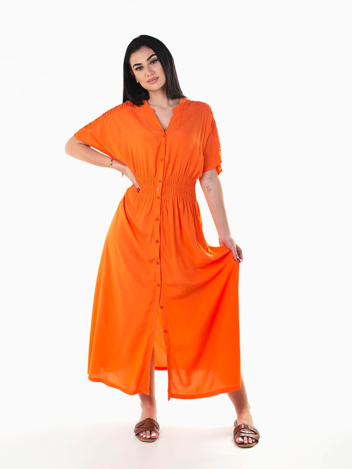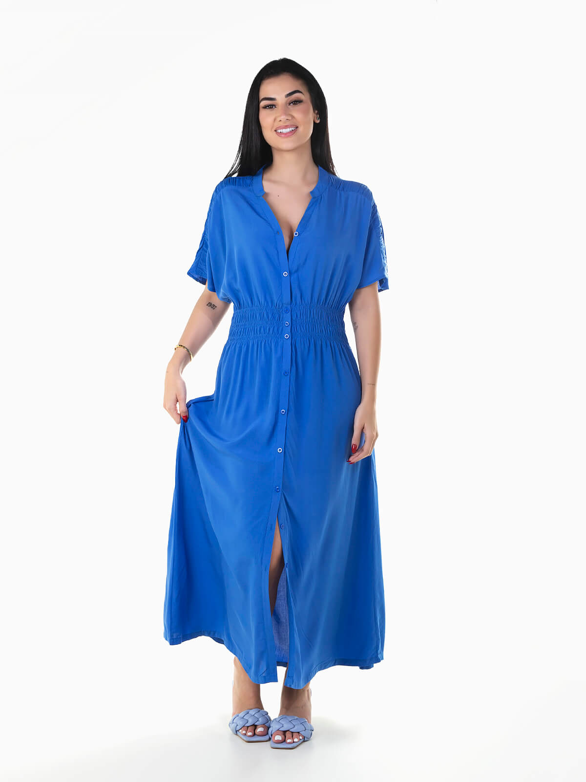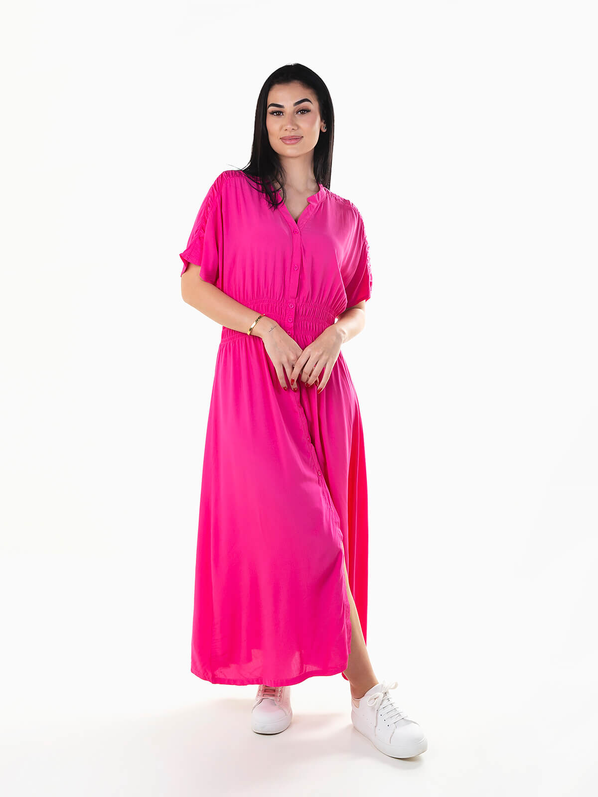 Vestido comprido de manga curta com pormenor franzido na cintura e ombro. Vestido fluído com decote em bico e aperto de botões.