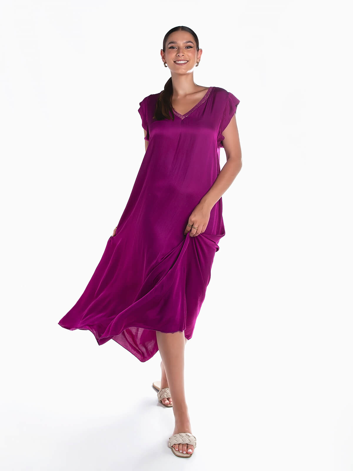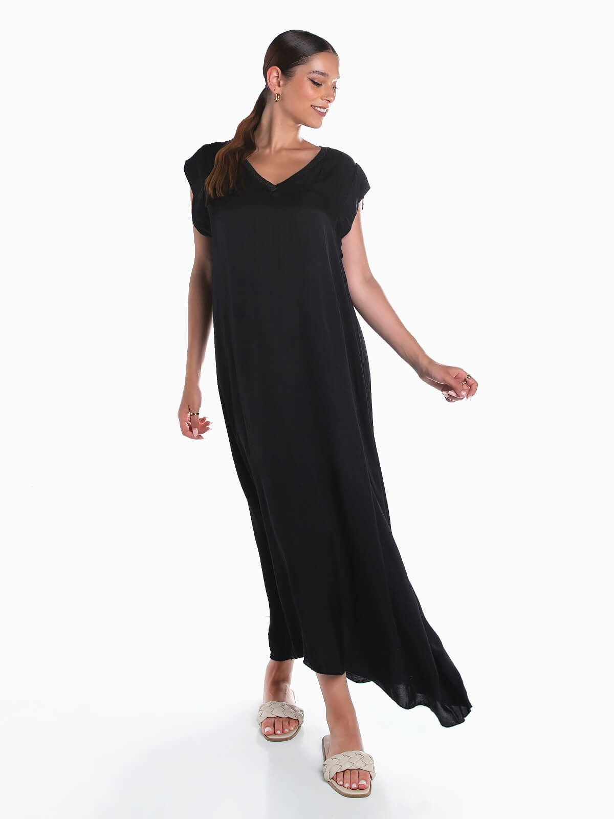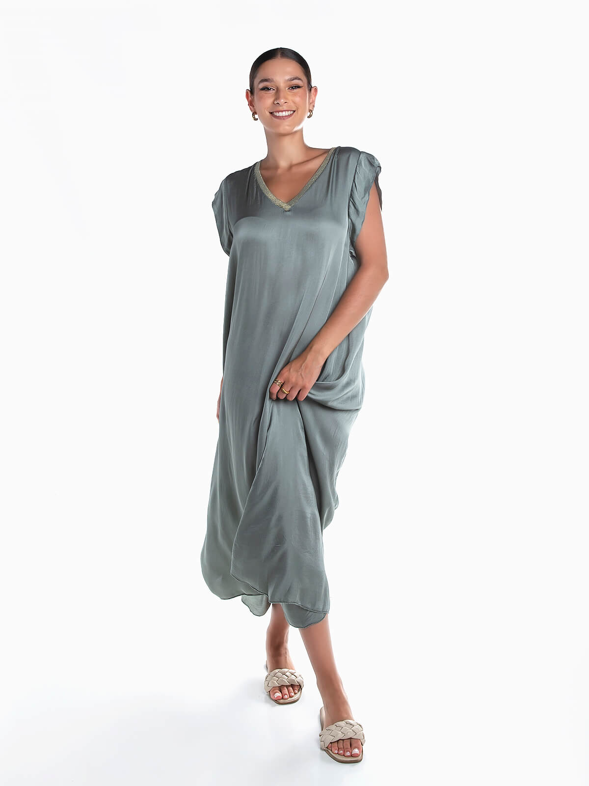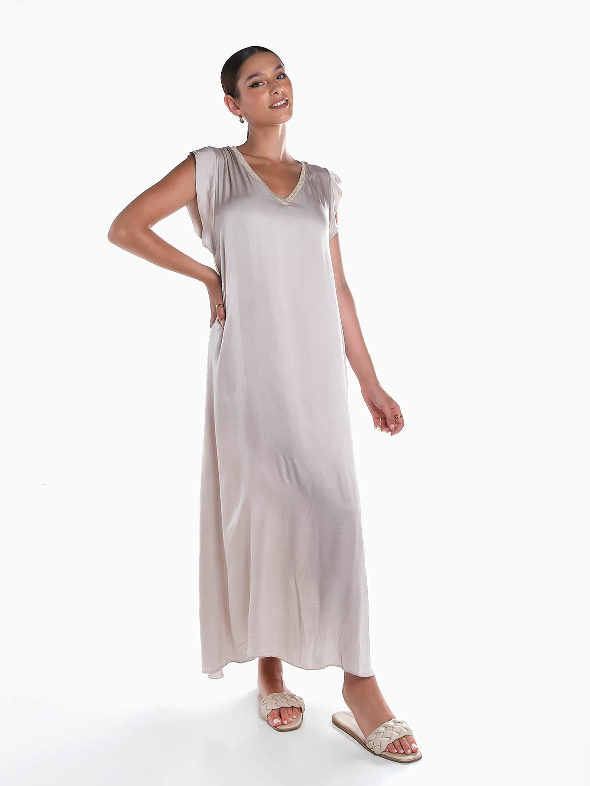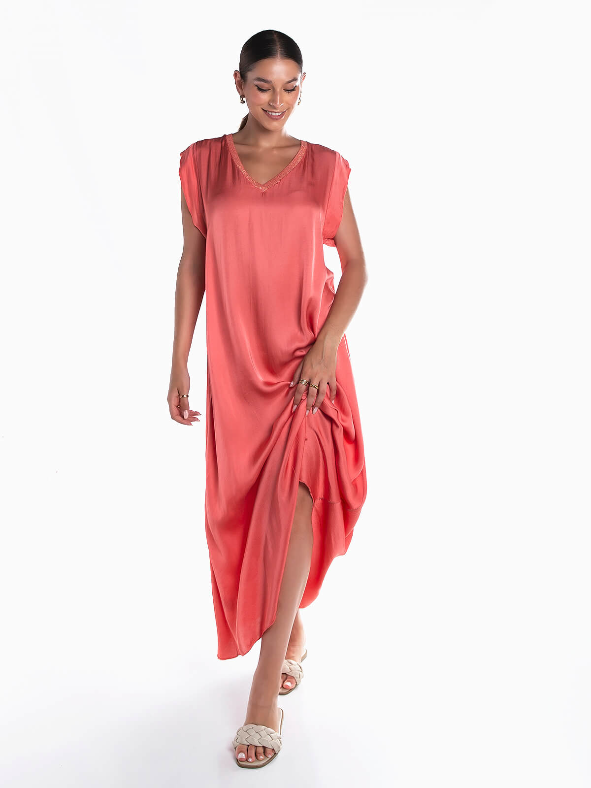 Vestido comprido em tecido cetim com mistura seda. Vestido fluída sem mangas com decote em v brilhante.