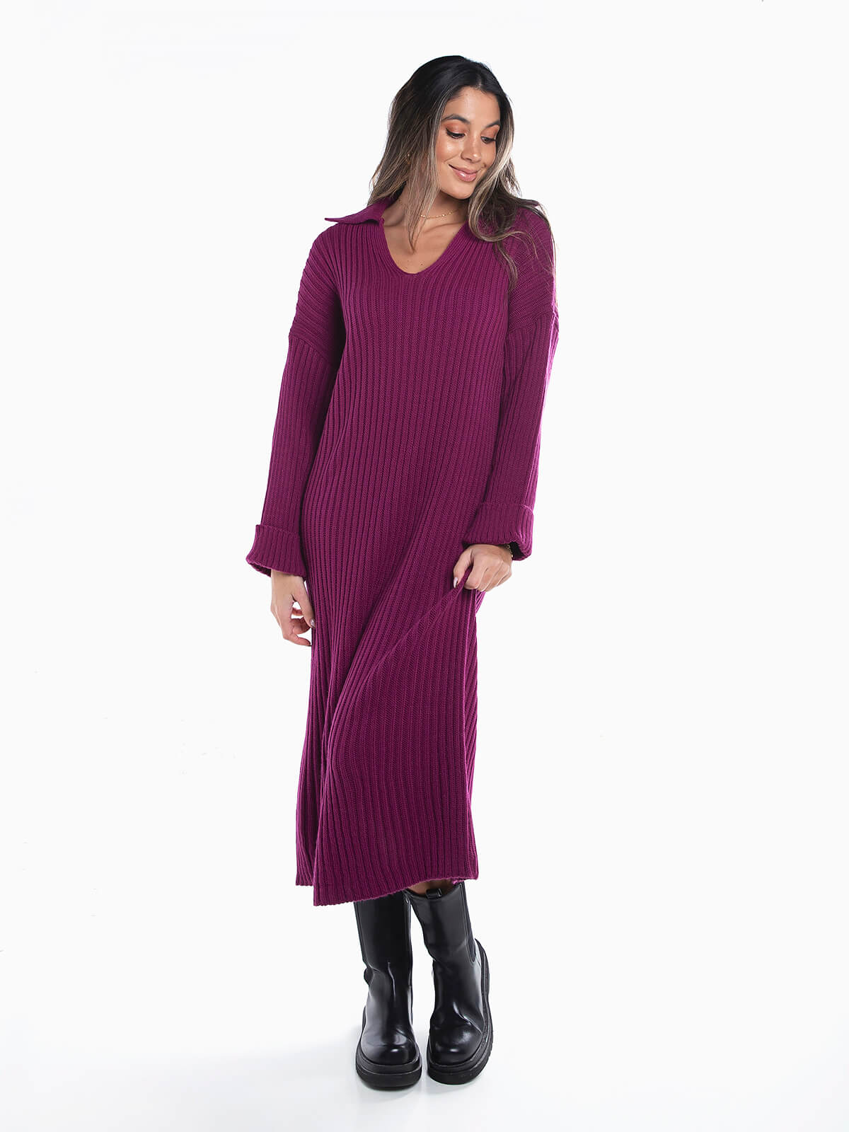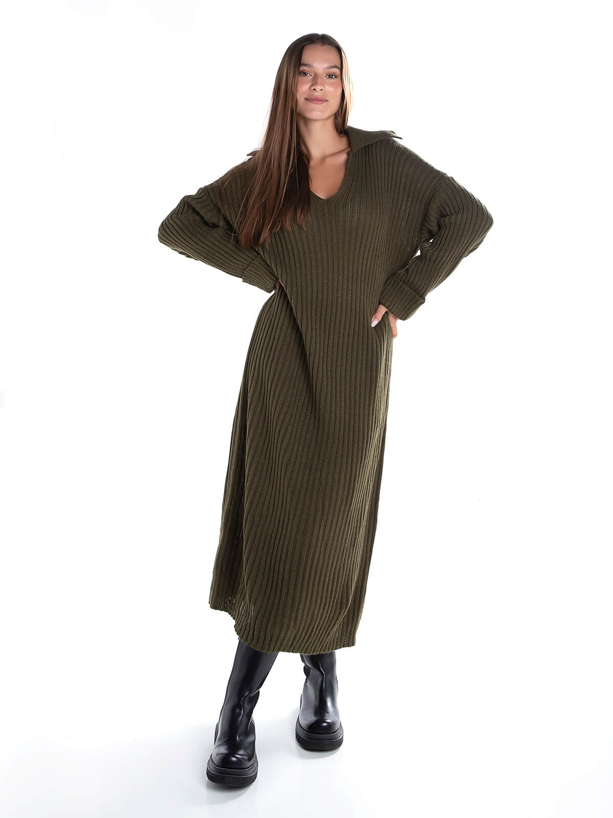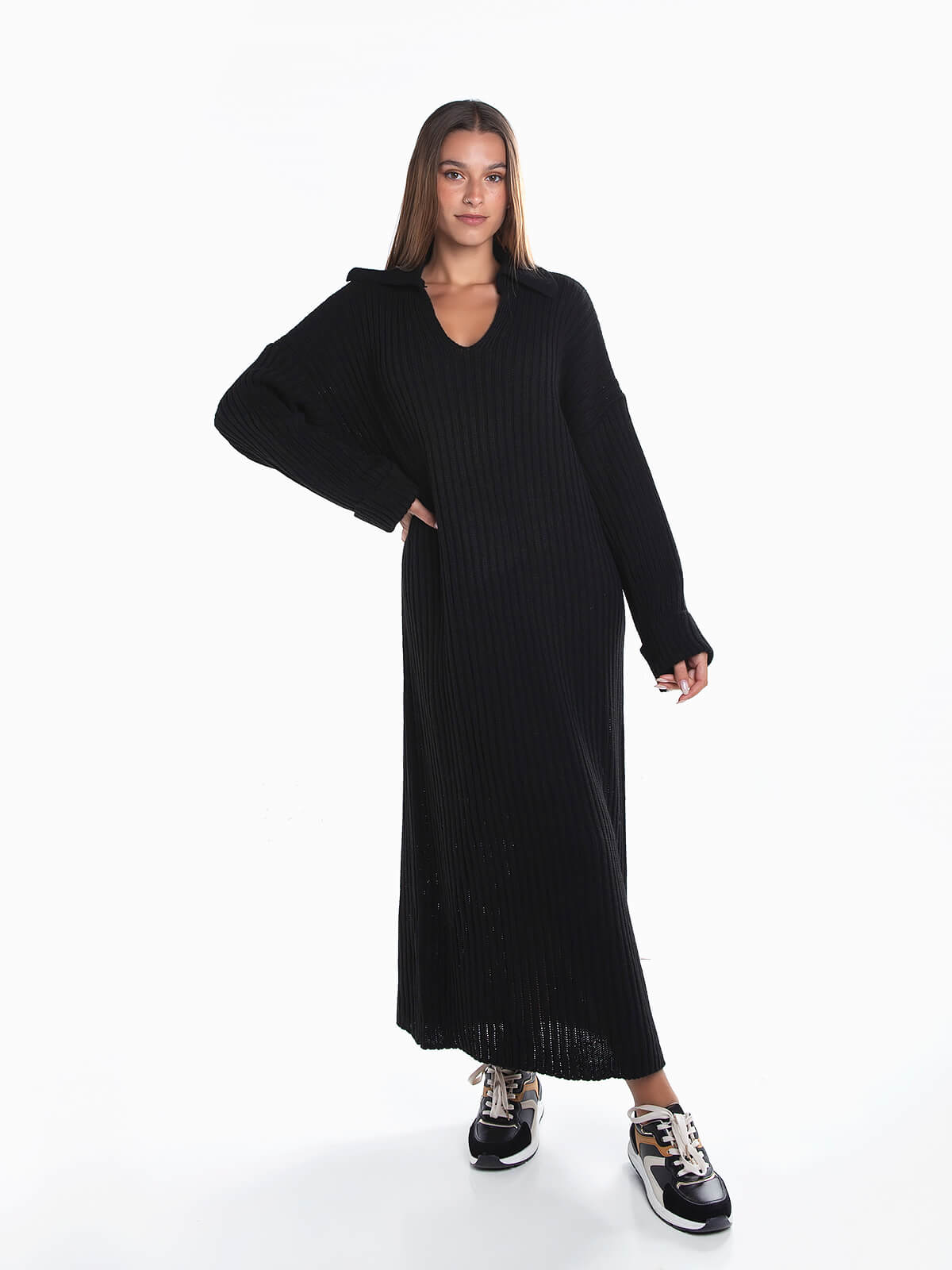 Vestido comprido oversize em malha canelada para senhora. Vestido manga comprida com abas e decote em bico. Punhos com dobra.