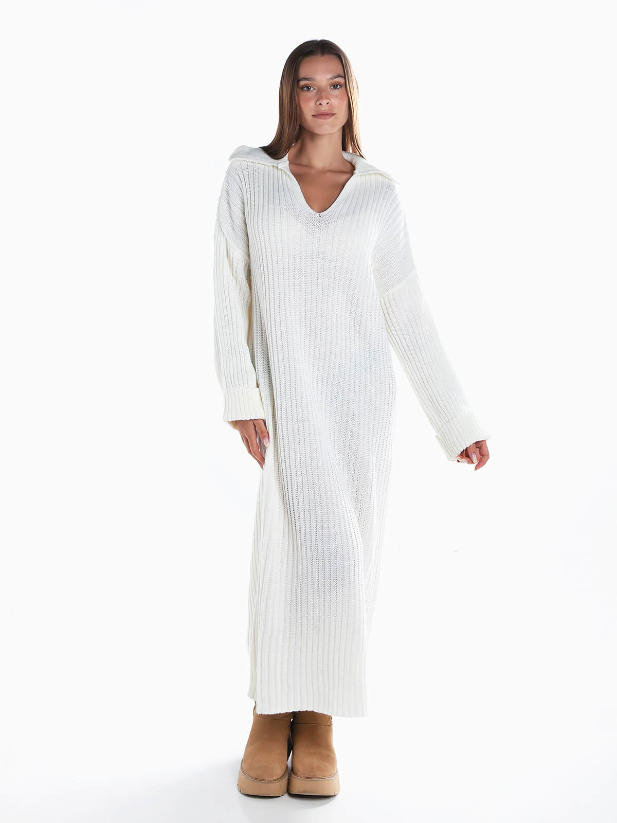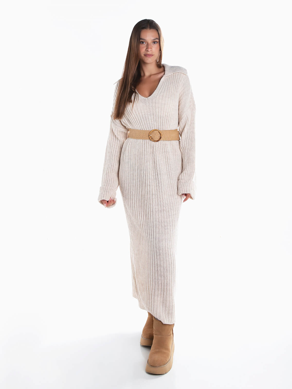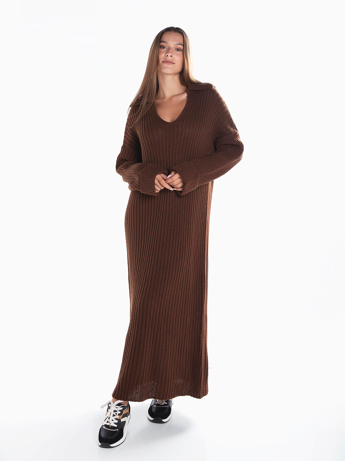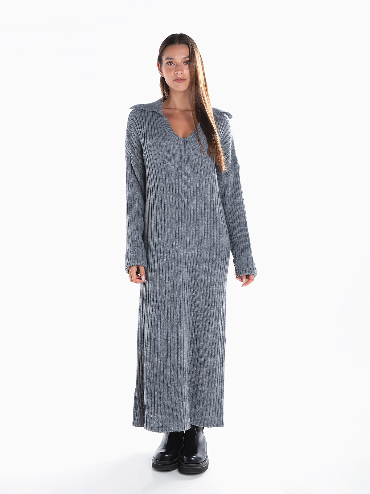 Vestido comprido oversize em malha canelada para senhora. Vestido manga comprida com abas e decote em bico. Punhos com dobra.