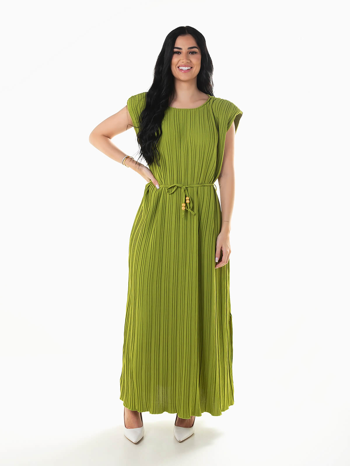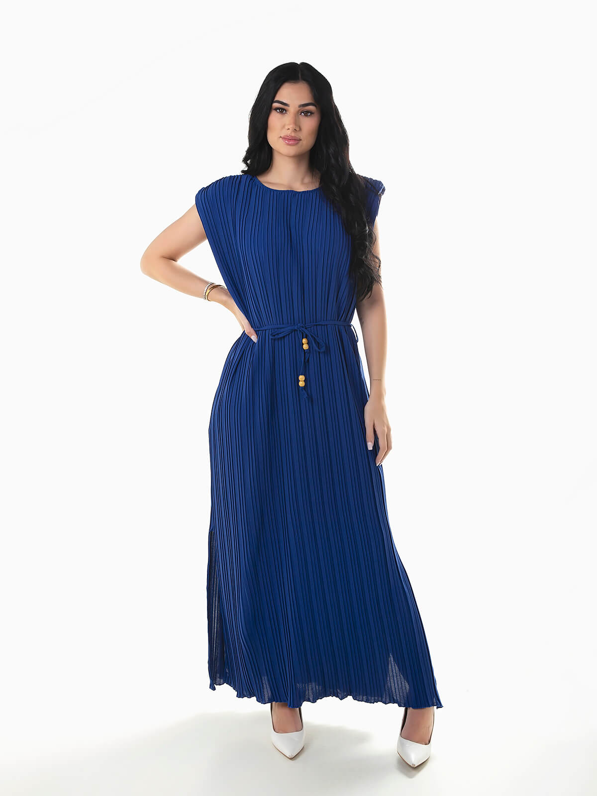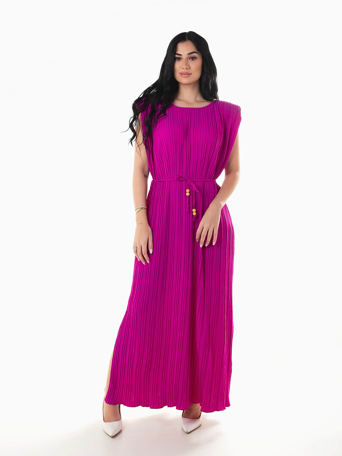 Vestido comprido plissado sem mangas para senhora. Vestido com ombreiras e decote redondo. Cinto para ajustar removível.